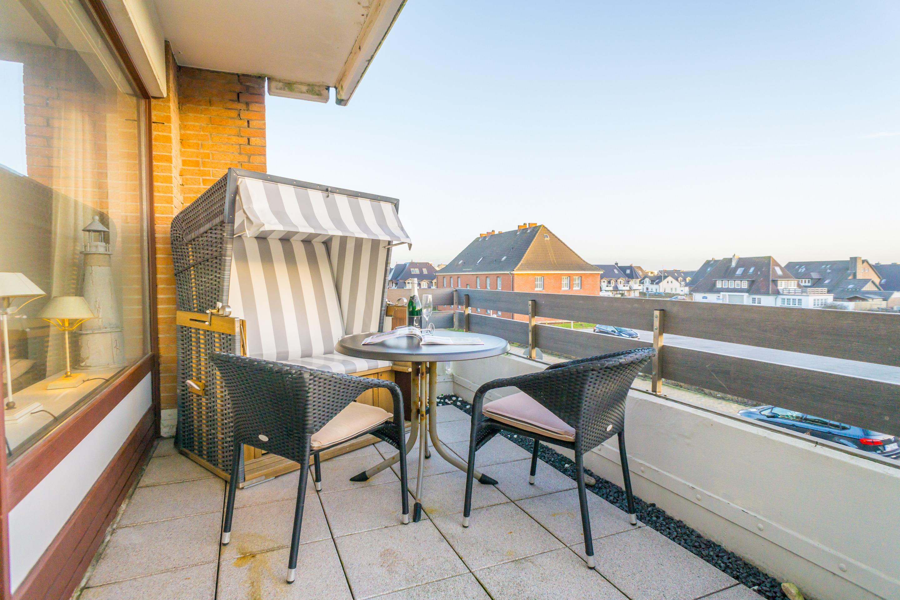 Diese charmante 2-Zimmer-Nichtraucher-Ferienwohnung erstreckt sich über ca. 45 m² und bietet Platz für 2 Personen. Sie befindet sich in der 1. Etage und besticht durch einen sonnigen Südbalkon, der mit einem Strandkorb, stilvollen Balkonmöbeln und Auflagen ausgestattet ist – und durch den Sie den Blick ins Freie genießen können. Zur Wohnung gehört ein eigener PKW-Stellplatz direkt am Haus.