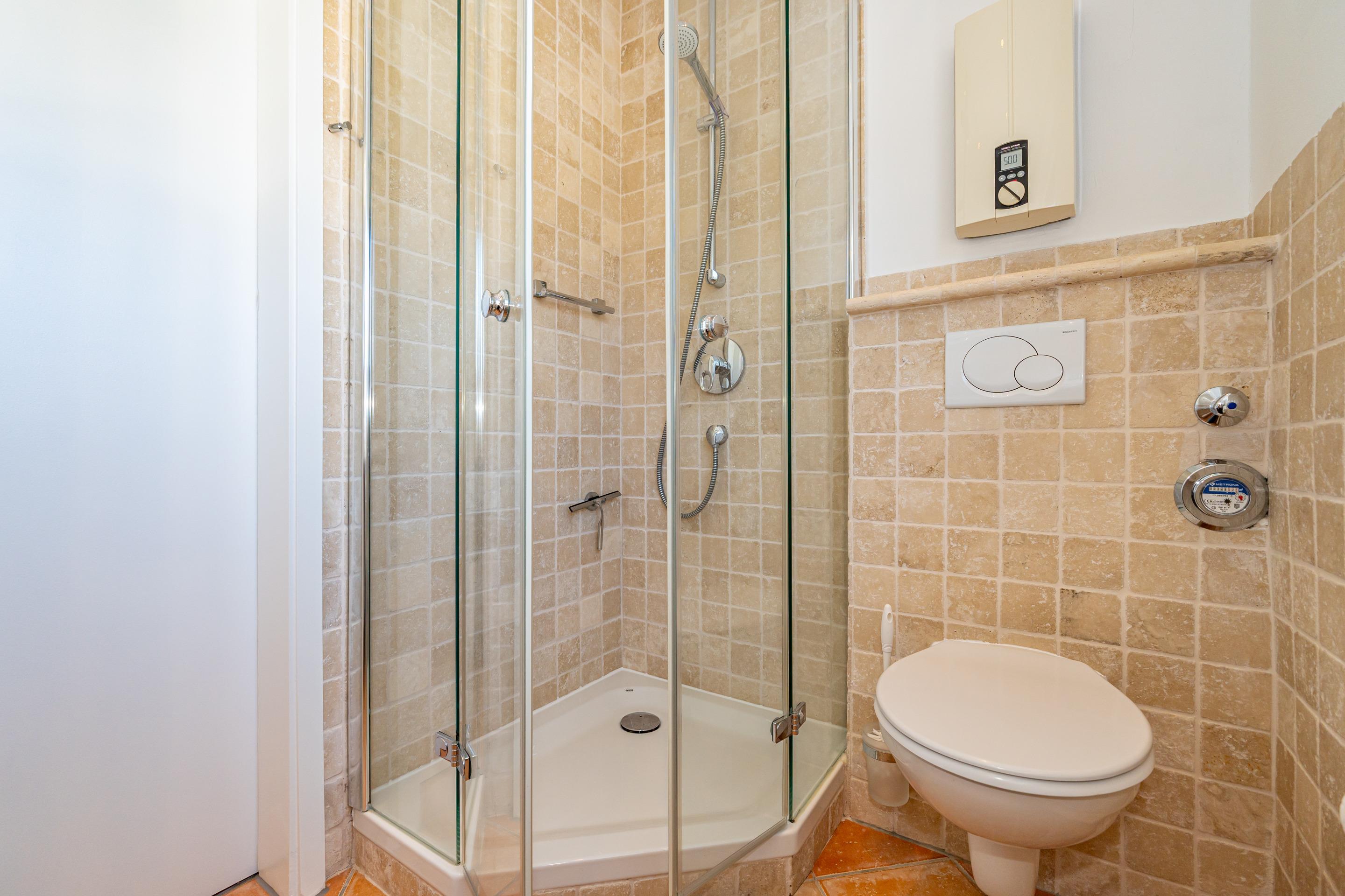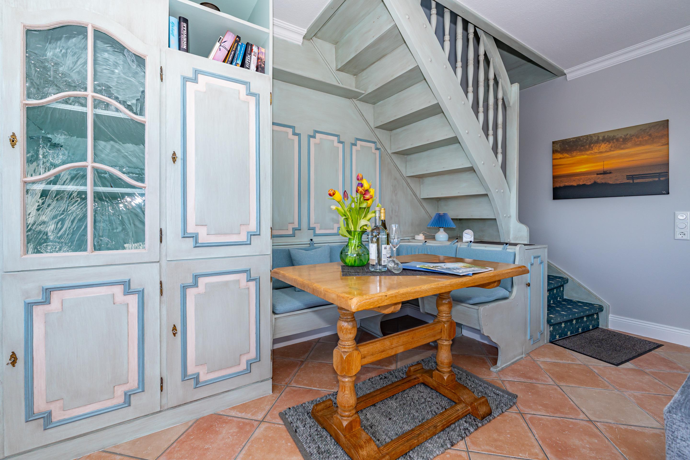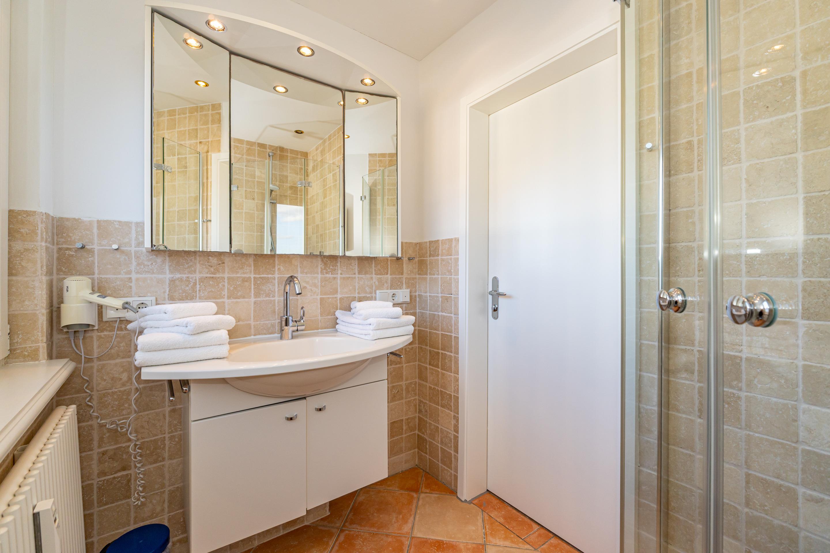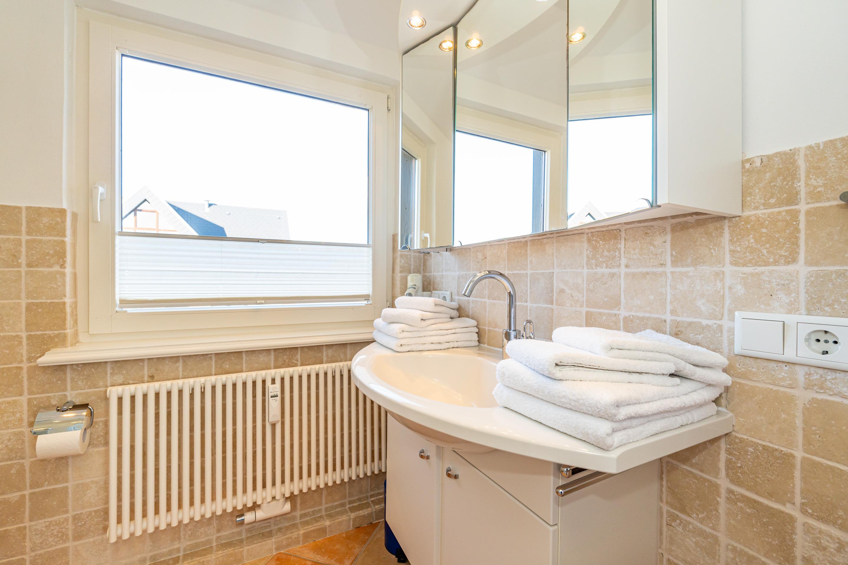 Das neuwertige Badezimmer mit Natursteinboden mit Dusche (extraflacher Einstieg), Waschtisch, Handtuchtrockner, Fön, WC und Fenster lässt Sie perfekt in den Urlaubstag starten. Über eine bequem begehbare Treppe gelangen Sie auf die offene Empore, die mit Teppichboden ausgelegt ist und Ihnen mit einem großzügigen Kleiderschrank sowie kleineren Nebenschränken ausreichend Stauraum bietet – ideal, um Koffer und weiteres Gepäck unterzustellen.