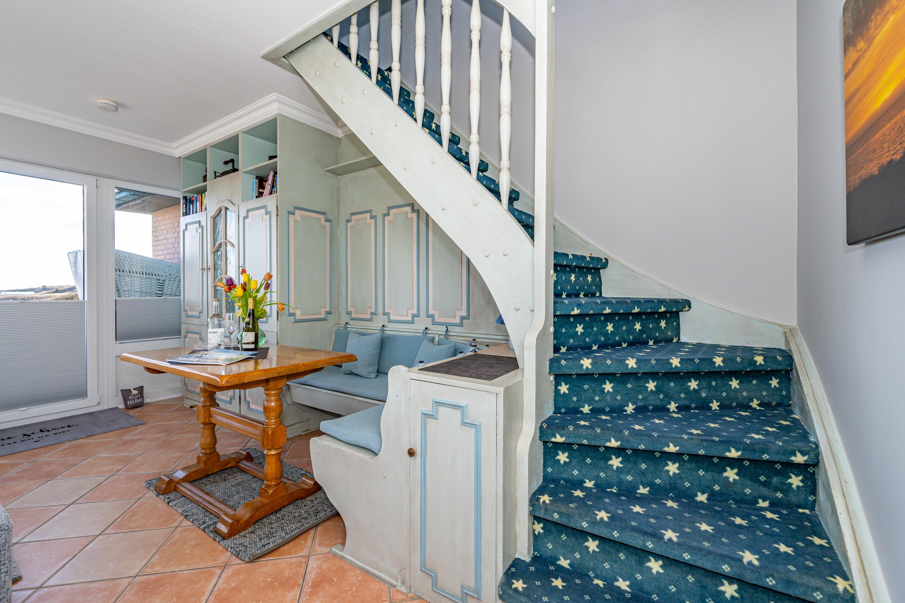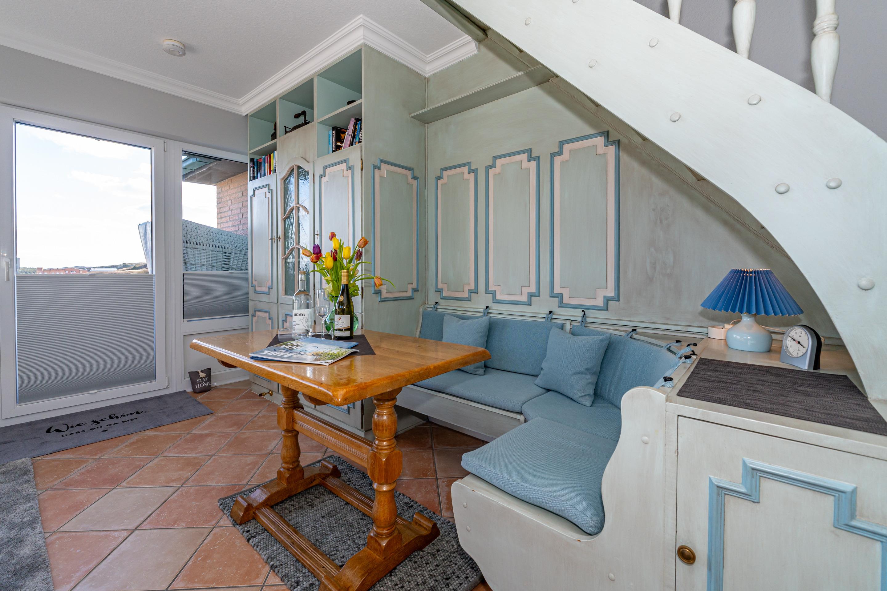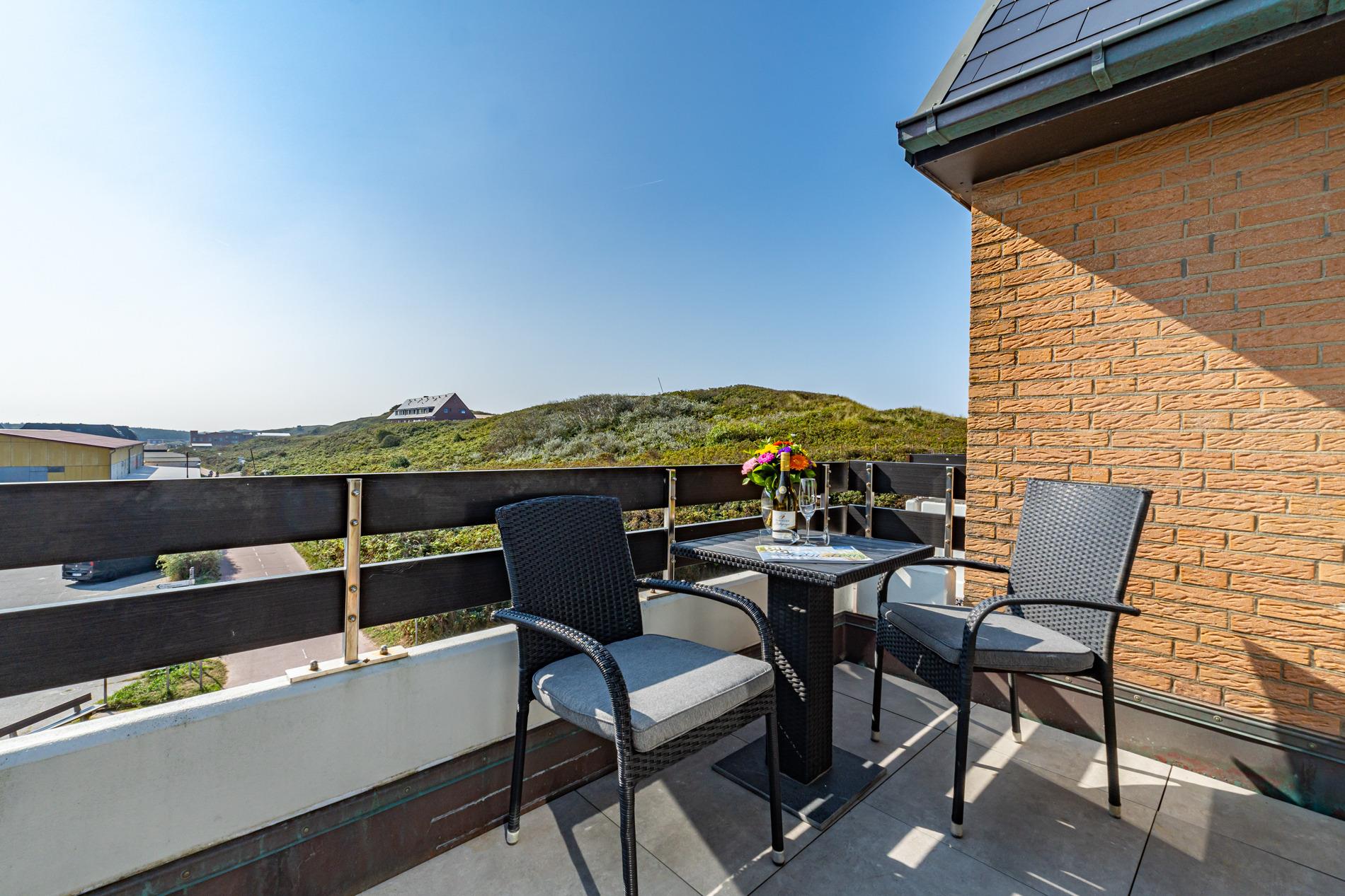 Diese großzügige 1-Zimmer-Nichtraucher-Ferienwohnung mit offener Empore besitzt eine Gesamtfläche von ca. 58 qm und bietet Platz für 2 Personen. Die Wohnung erstreckt sich über zwei Ebenen und befindet sich in der 2. Etage zur Südseite, mit herrlichen Blick auf die Dünen und den Süden Westerlands. Genießen Sie ganztägig entspannte Sonnenstunden auf dem großen Südbalkon, der mit Balkonmöbeln, Auflagen und einem Strandkorb ausgestattet ist.