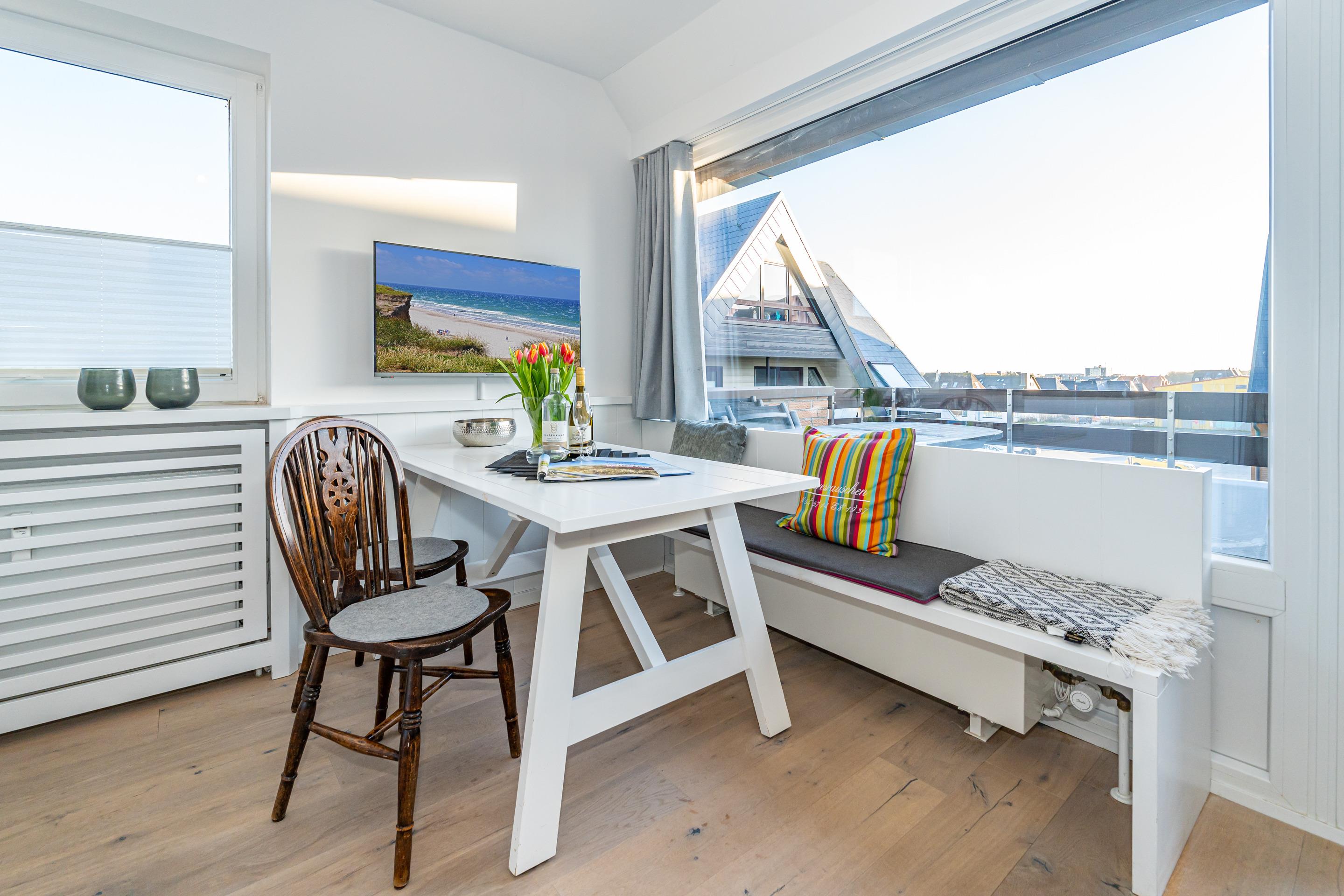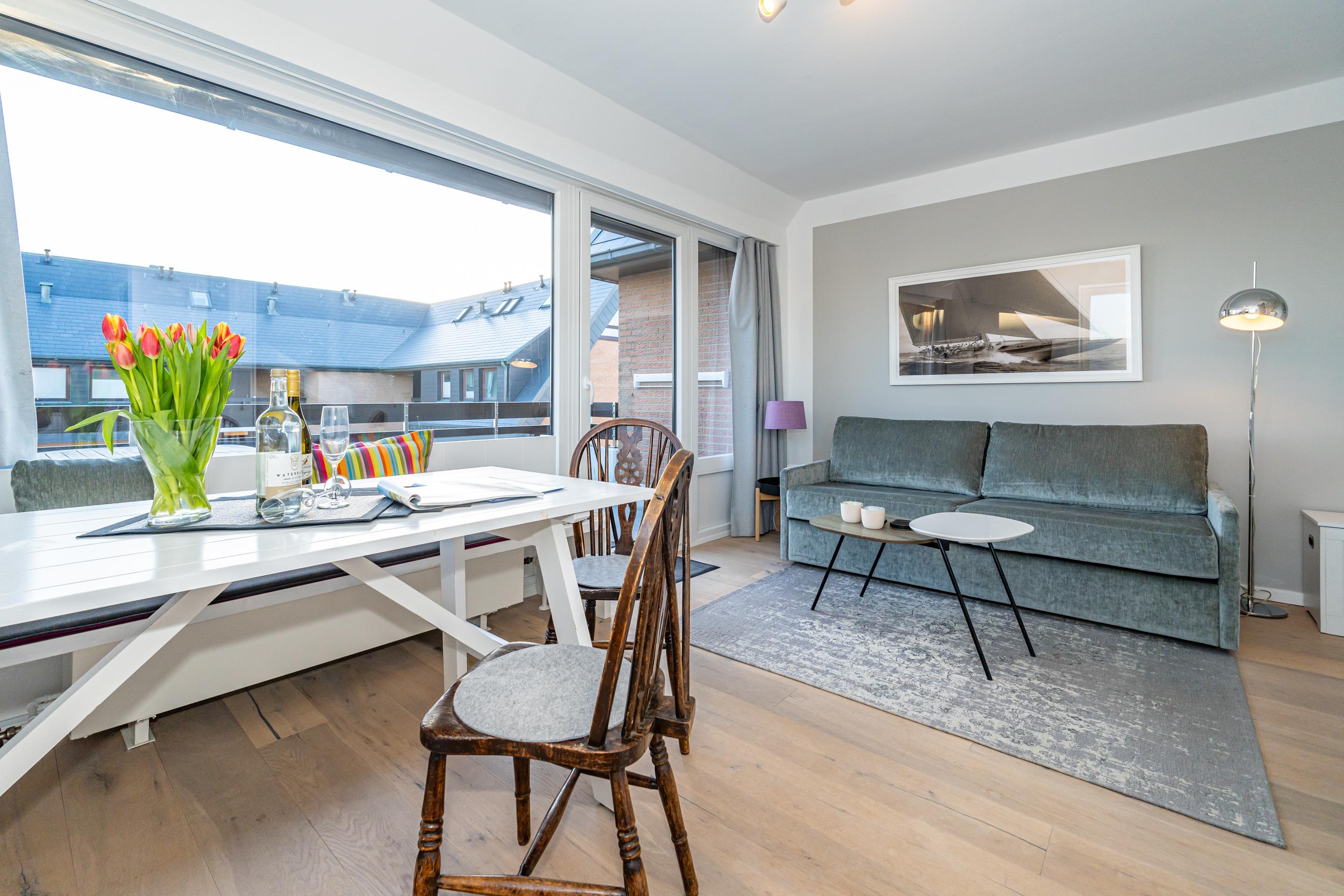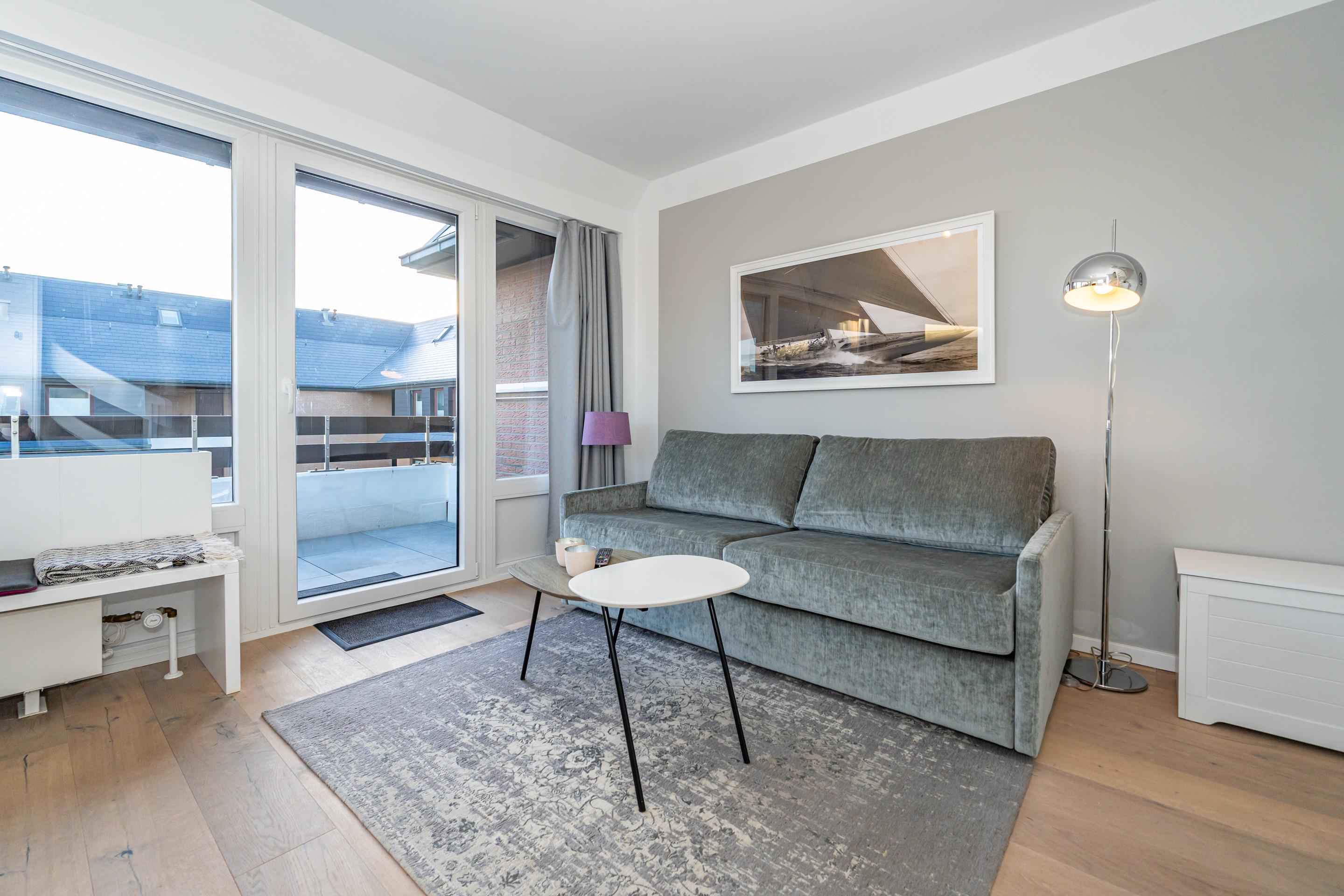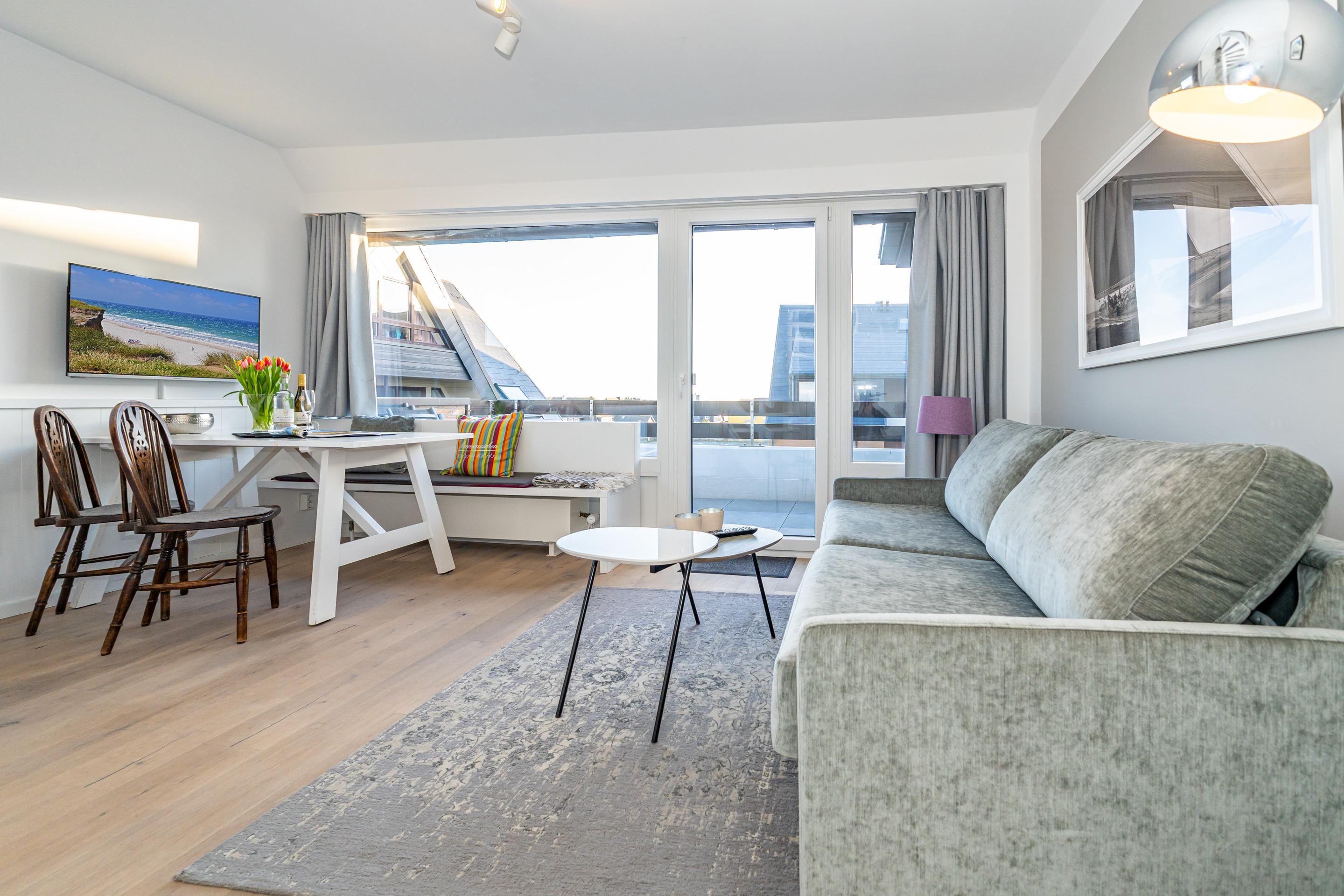 Vom einladenden Vorflur mit Garderobe gelangen Sie in das helle und freundliche Wohnzimmer mit direktem Zugang zum großen Südbalkon, in das neue Duschbad mit Fenster sowie in das separate Einzel-Schlafzimmer. Der lichtdurchflutete Wohnbereich ist mit einem modernen Schlafsofa (Liegefläche 1,60 x 2,00 m), einem separaten Essplatz mit gemütlicher Sitzbank direkt an der großen Fensterfront, einem Kabel-Flachbild-TV und einem Radio ausgestattet. Die offene Küche fügt sich harmonisch in den Raum ein. Vom Balkon genießen Sie einen wunderschönen Weitblick über die umliegenden Häuser, die Dünenlandschaft sowie den Süden Westerlands. Das neue Badezimmer verfügt über eine Eckdusche, einen Waschtisch, ein WC, einen Fön, einen Kosmetikspiegel sowie ein Fenster für angenehmes Tageslicht.