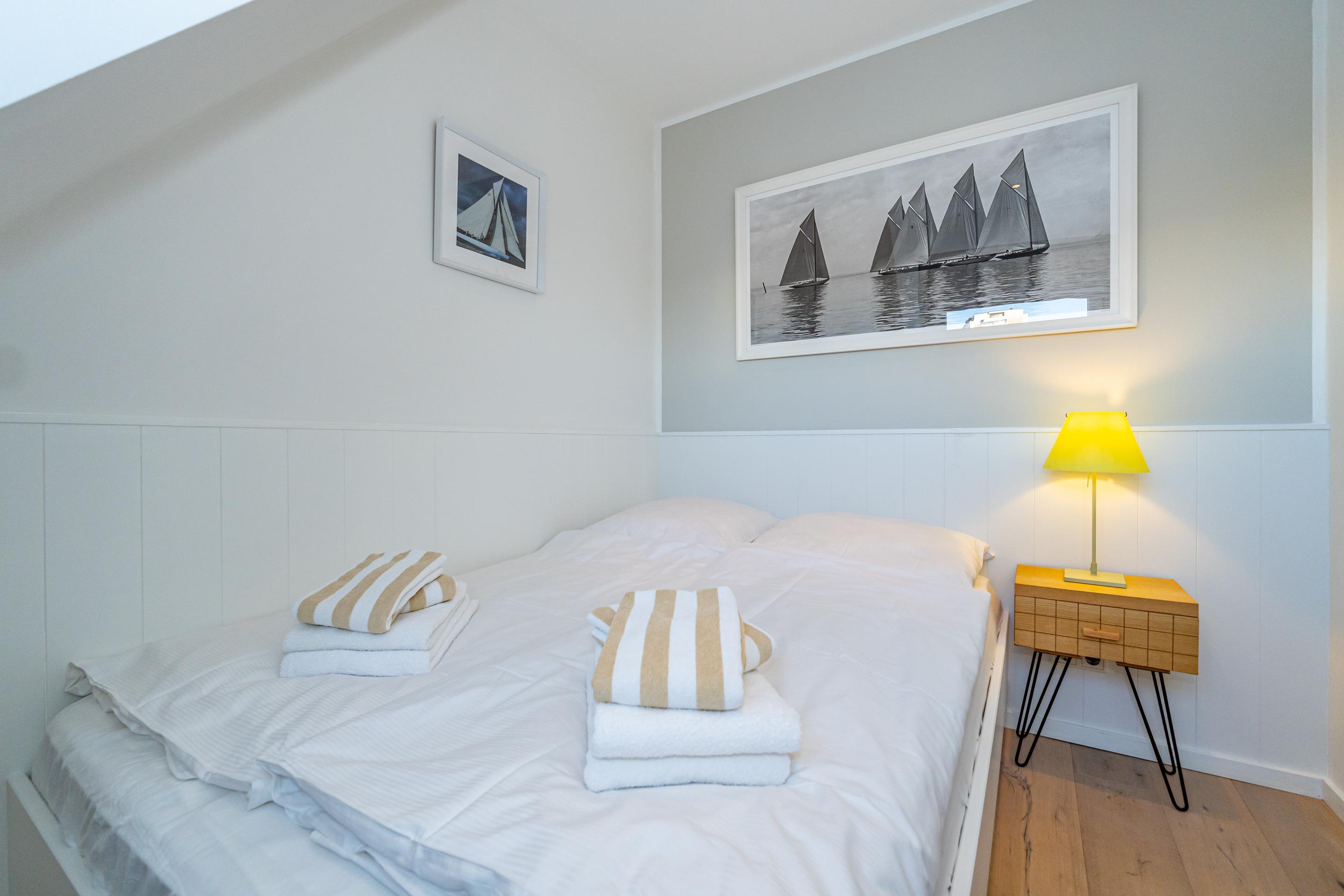 Das separate kleine Schlafzimmer ist mit einem französischen Doppelbett (Liegefläche 1,40 x 2,00 m, durchgehende Matratze) ausgestattet. Die moderne, offene Einbauküche mit Fenster bietet höchsten Komfort und ist mit einem Geschirrspüler, einer Mikrowellen-Backofen-Kombination, einem 4-Platten-Ceranfeld und einem Kühlschrank mit 3-Sterne-Gefrierfach ausgestattet. Zur Grundausstattung gehören zudem eine Kaffeemaschine, ein Wasserkocher und ein Toaster.