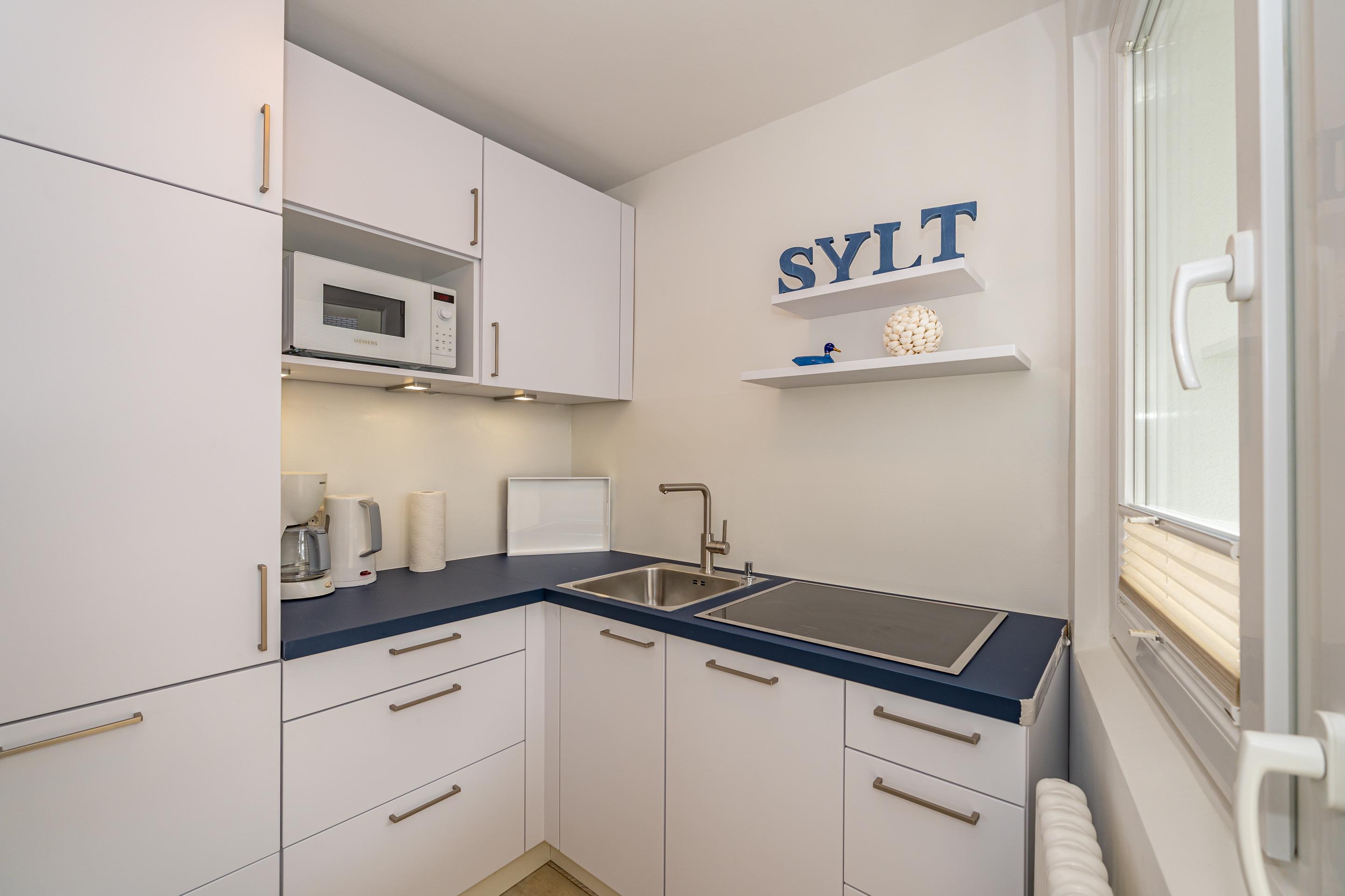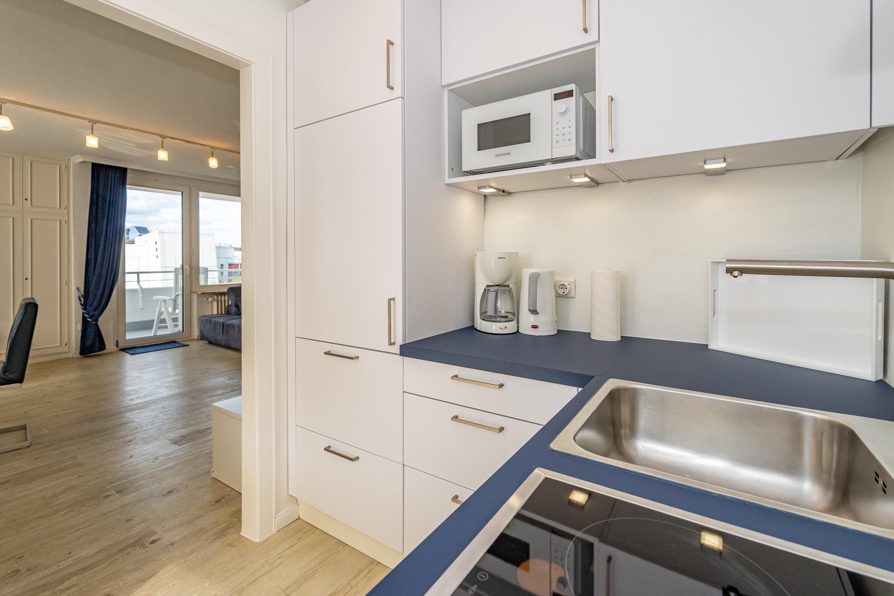 die separate Küche mit Geschirrspüler, Cerankochfeld, Mikrowelle und Austritt zum Südbalkon. Kaffeemaschine, Wasserkocher und Toaster gehören zur Grundausstattung.