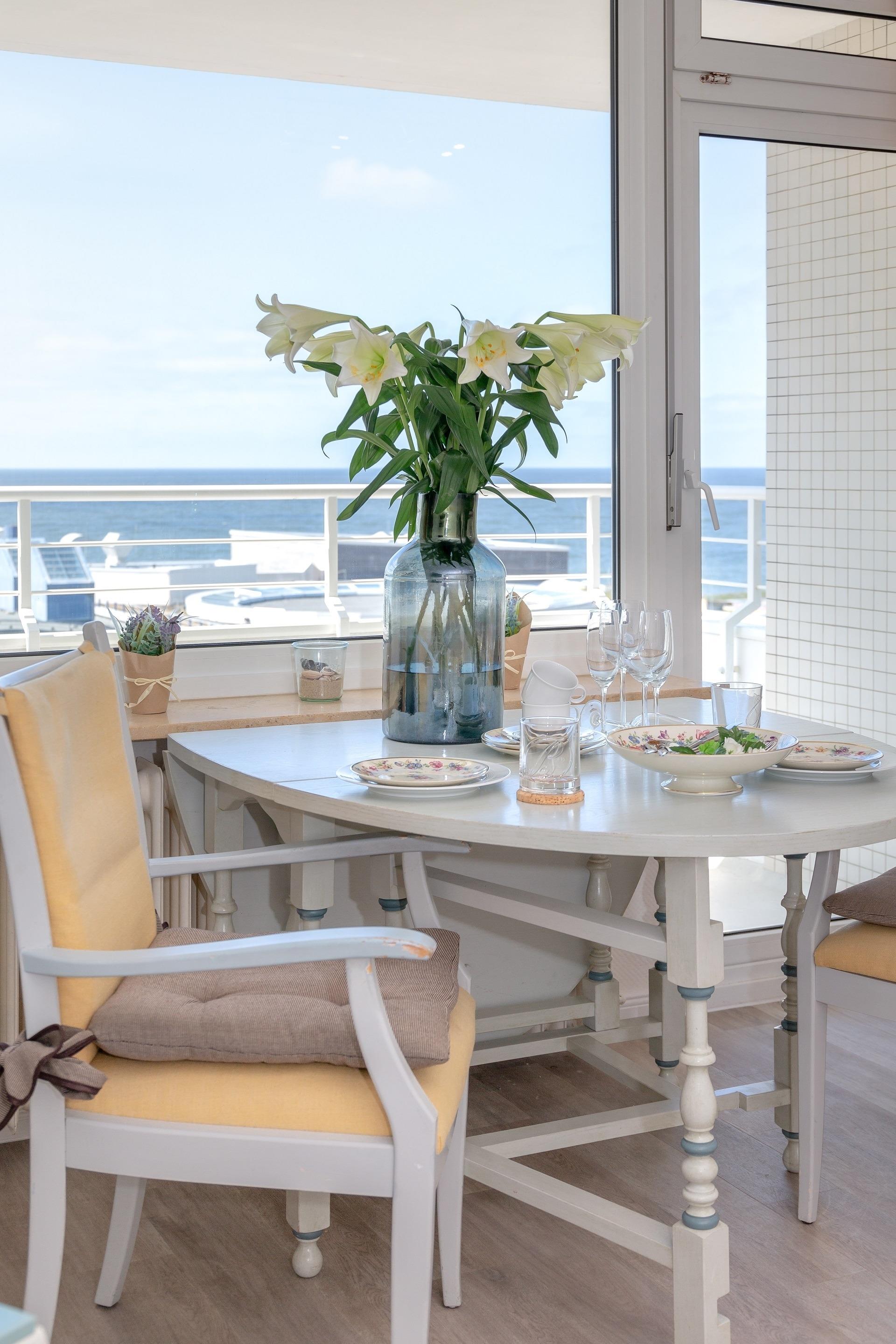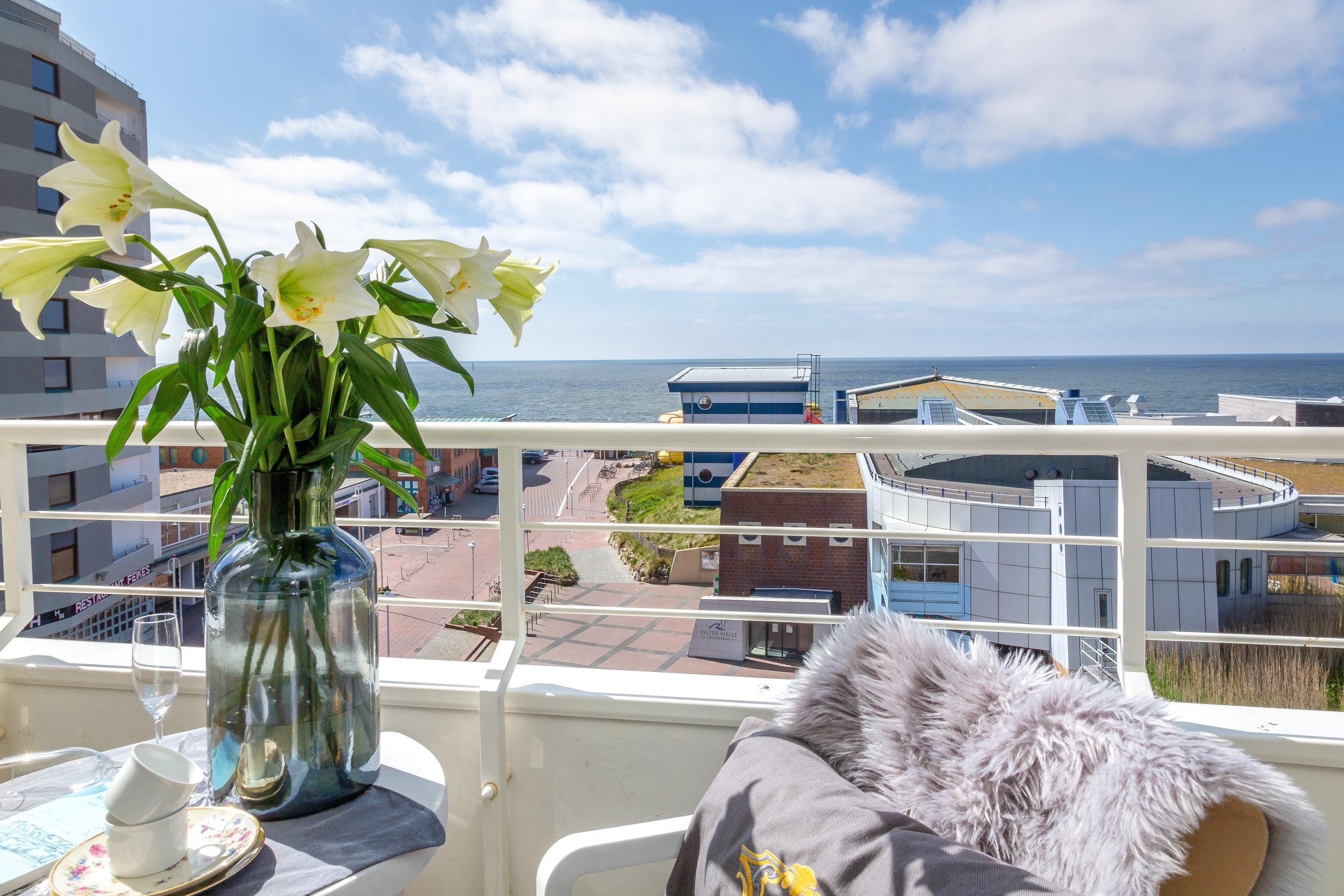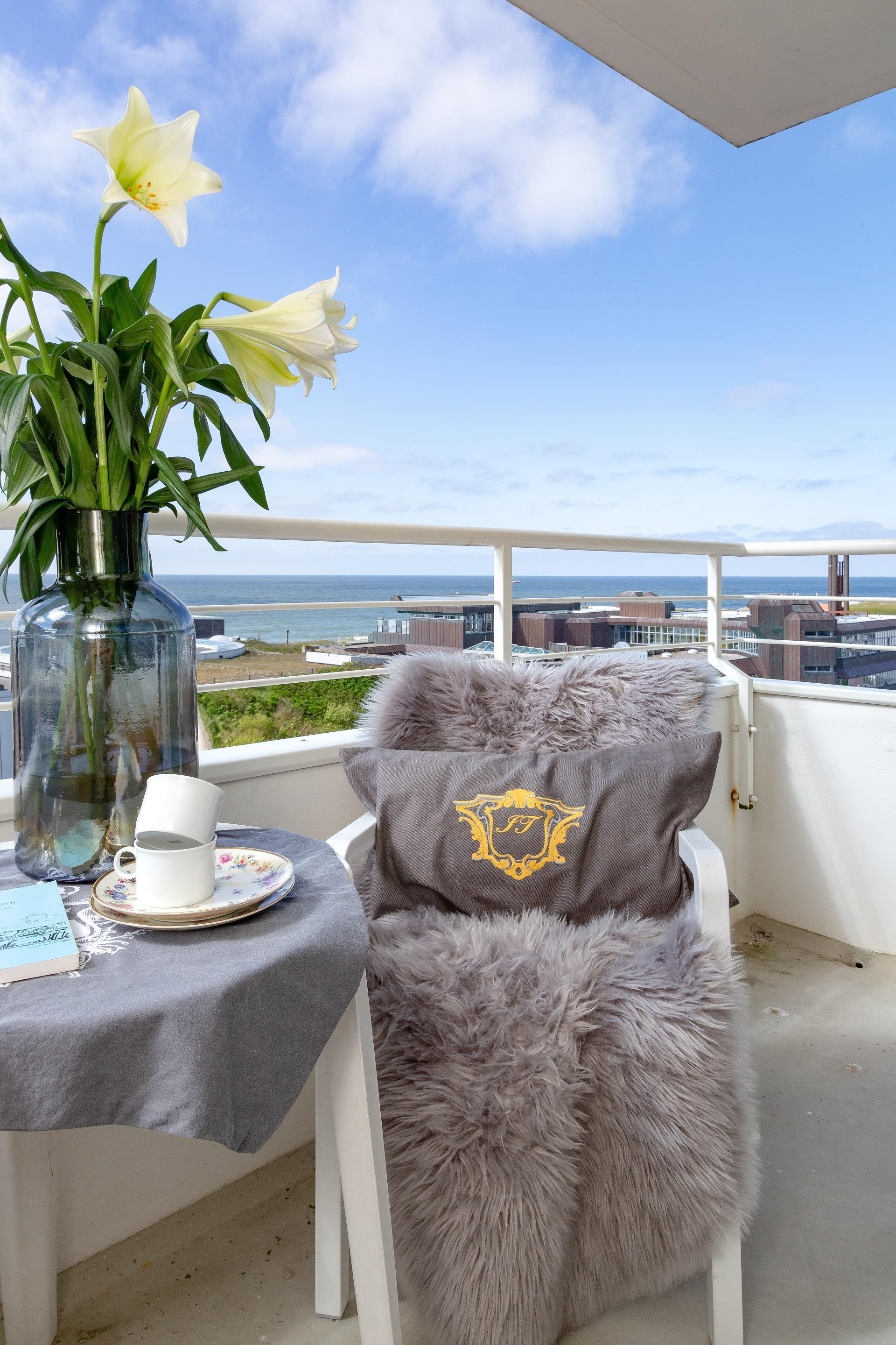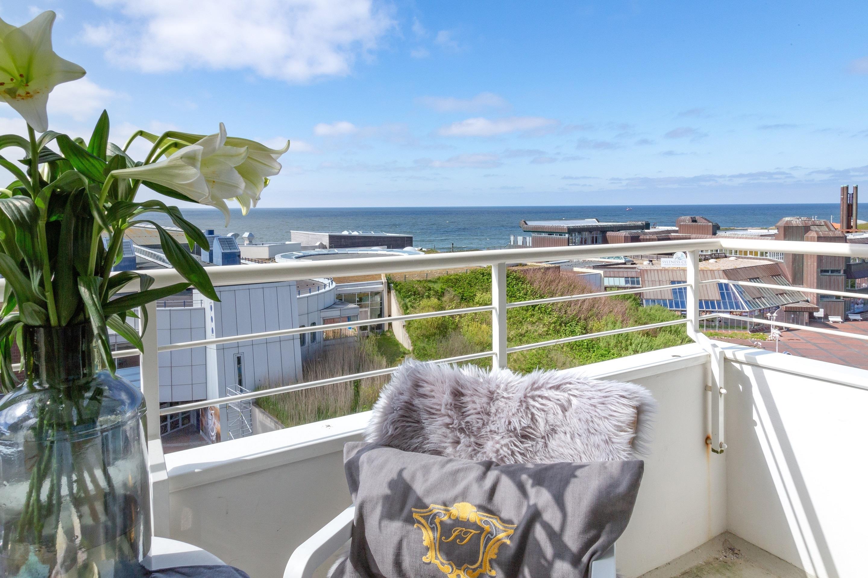2-Zimmer-Nichtraucher-Ferienwohnung (ca. 50 qm) in der 5. Etage mit Meerblick und Westloggia (Seeseite, mit Balkonmöbeln und Auflagen) für max. 4 Personen.
