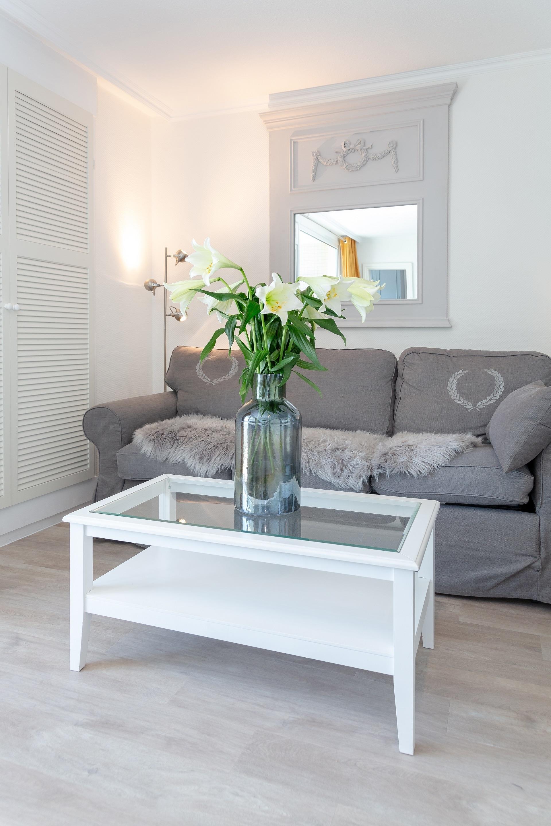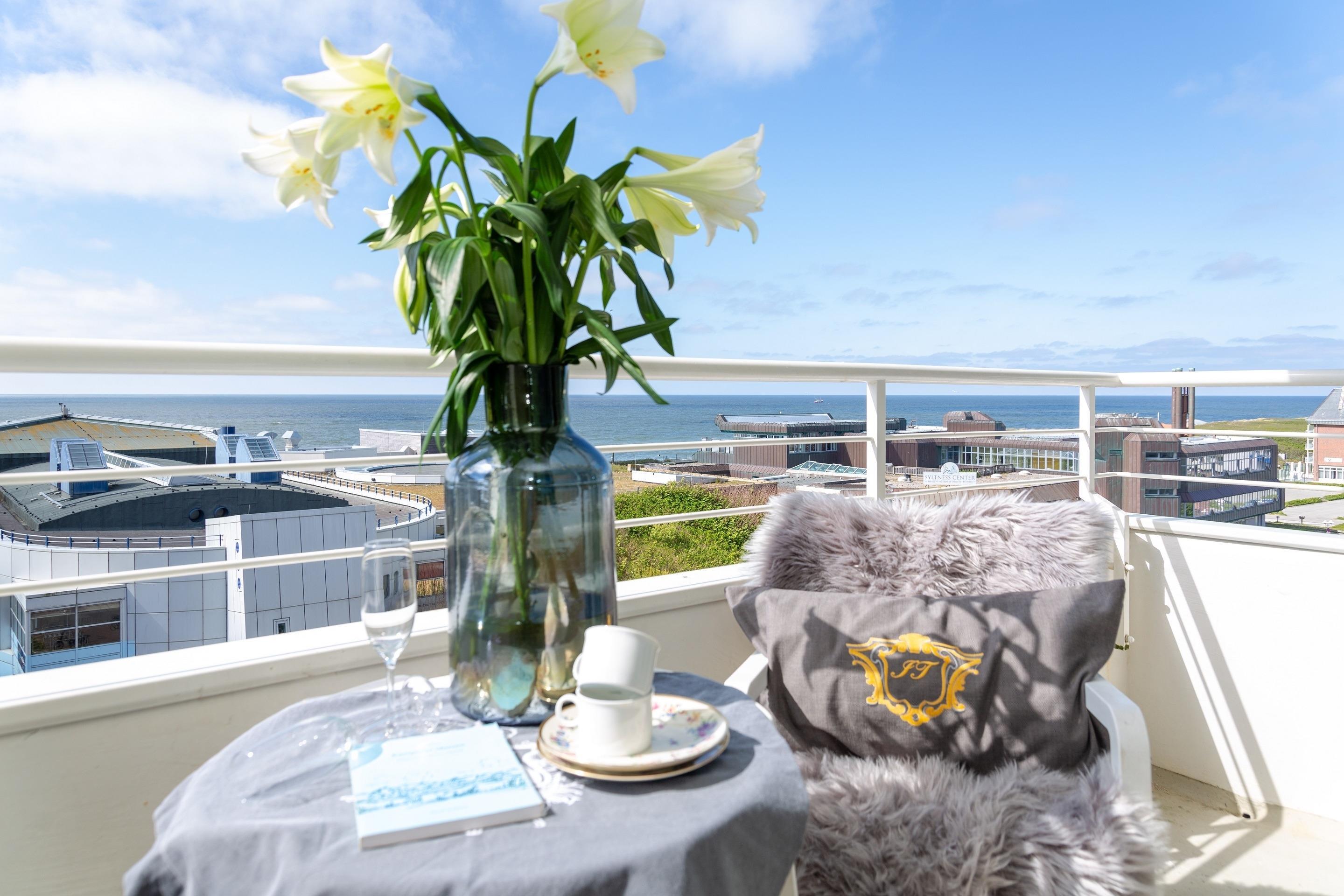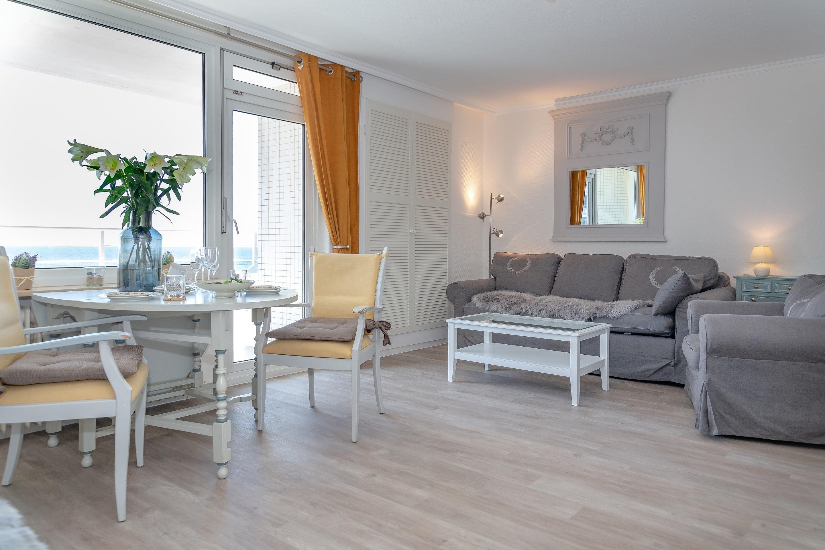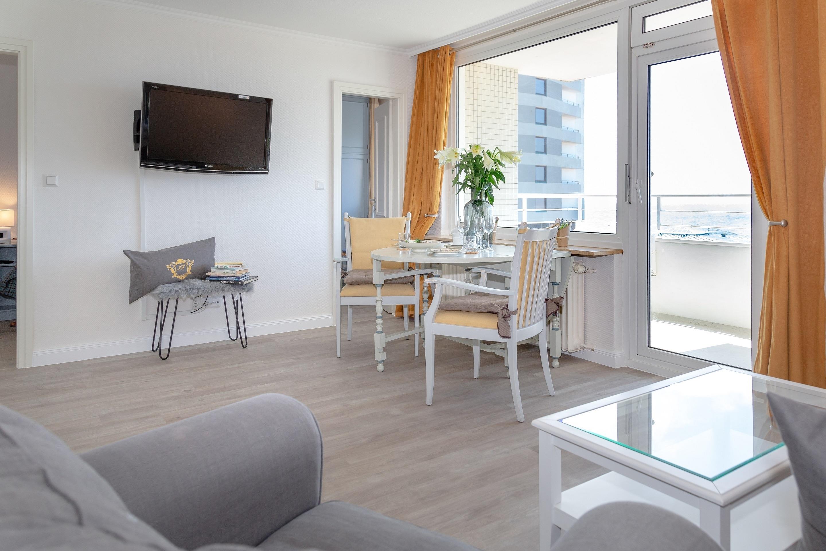 2-Zimmer-Nichtraucher-Ferienwohnung (ca. 50 qm) in der 5. Etage mit Meerblick und Westloggia (Seeseite, mit Balkonmöbeln und Auflagen) für max. 4 Personen.