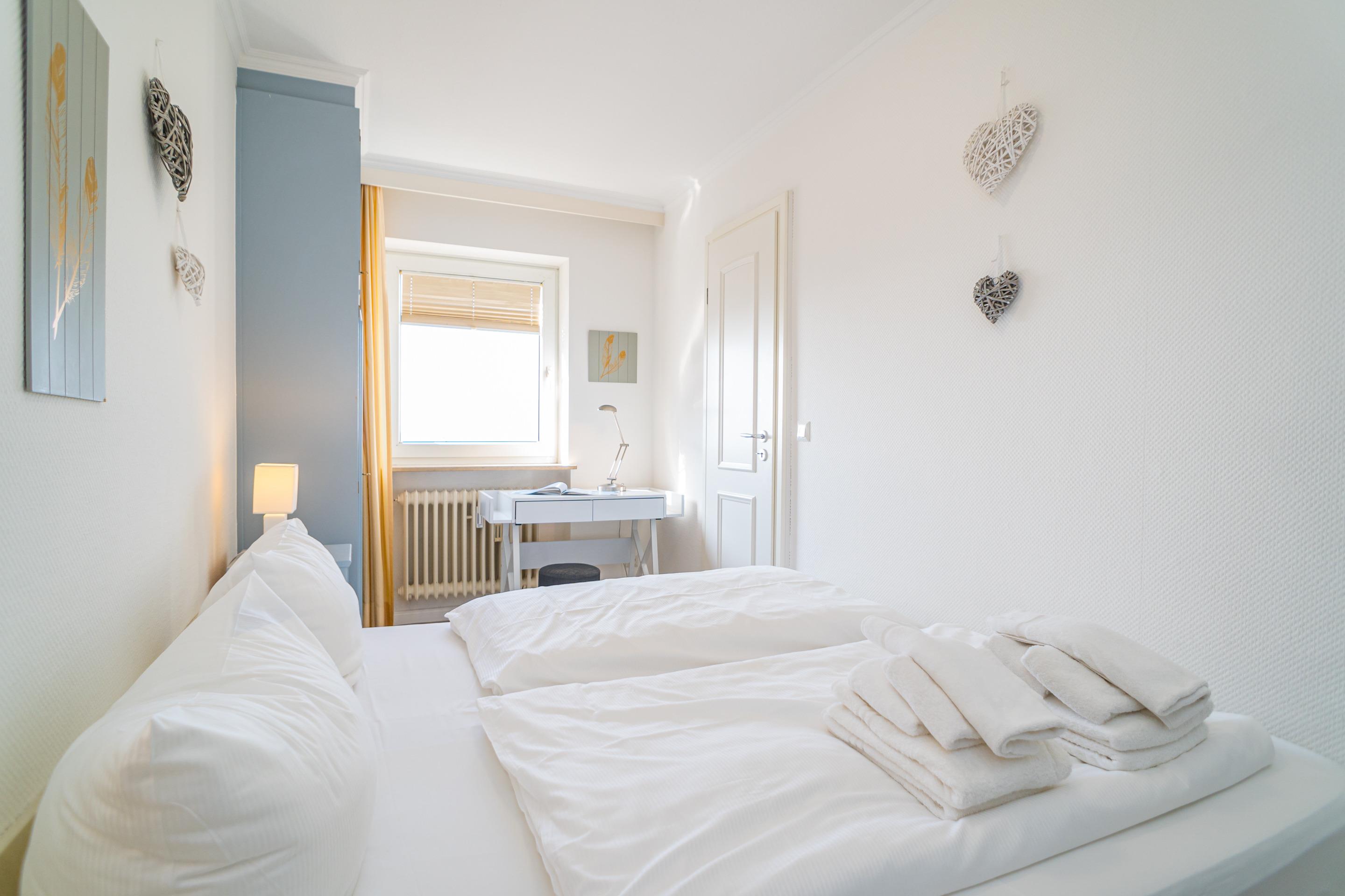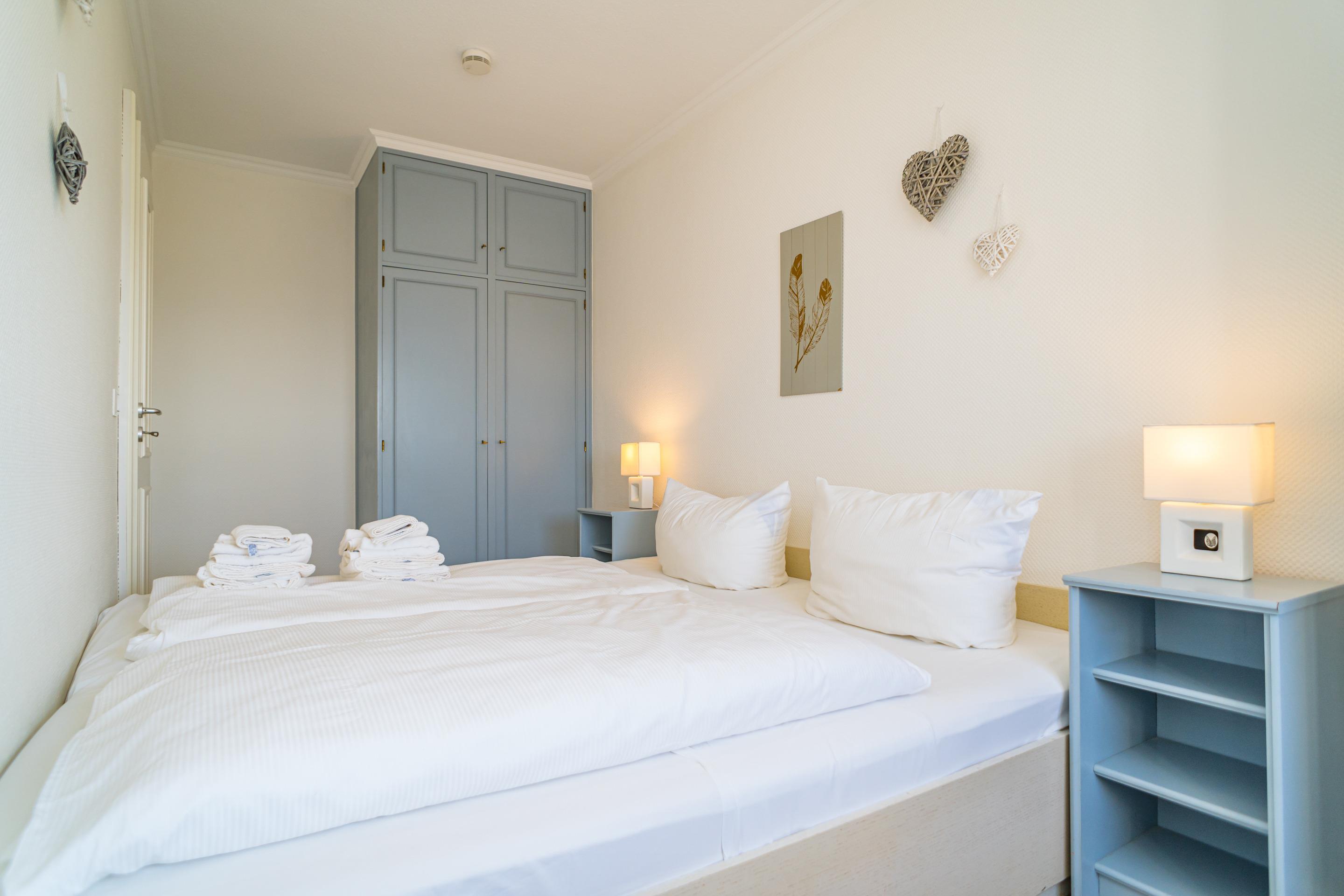 Das Schlafzimmer hat ein Doppelbett.