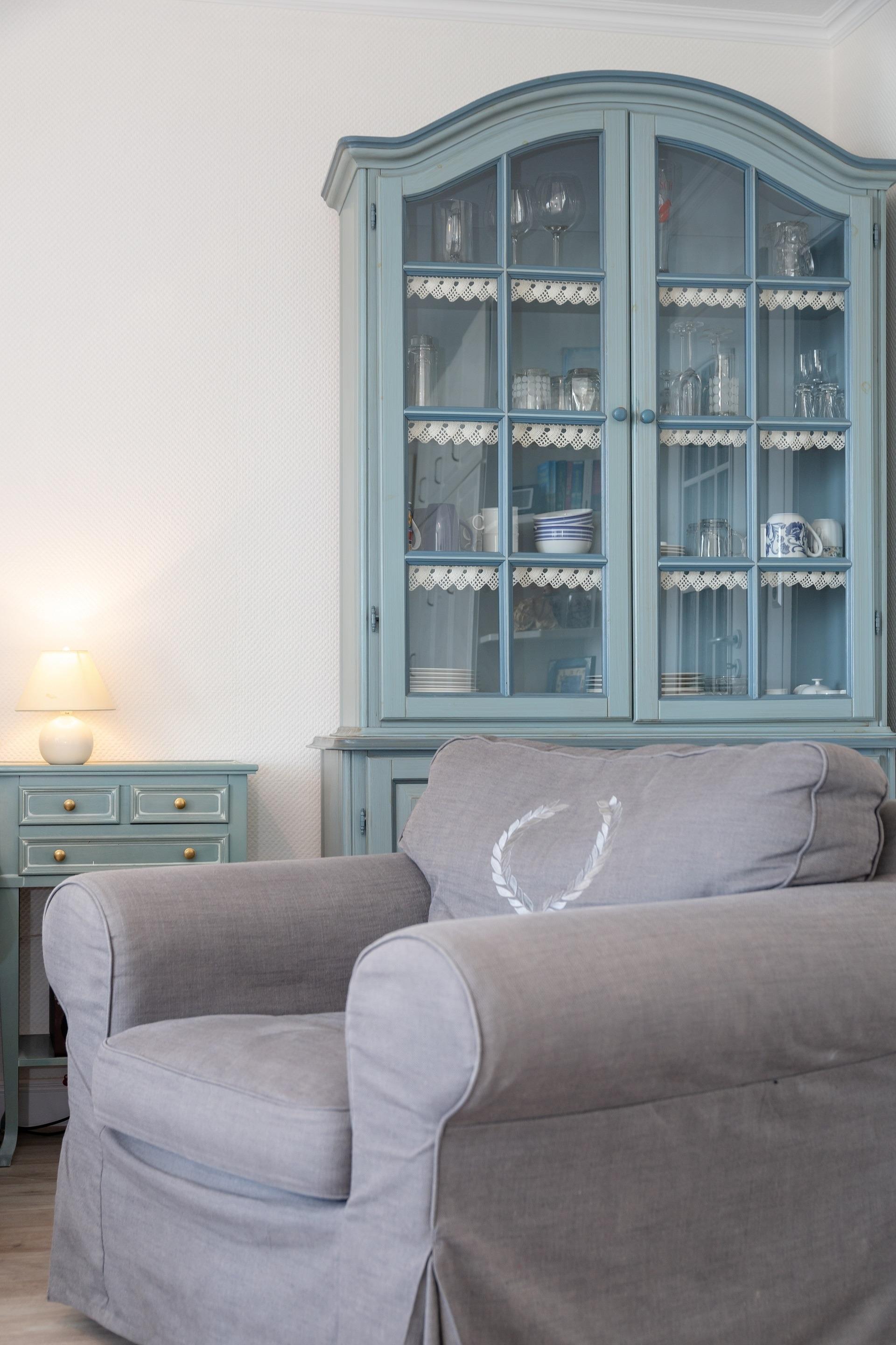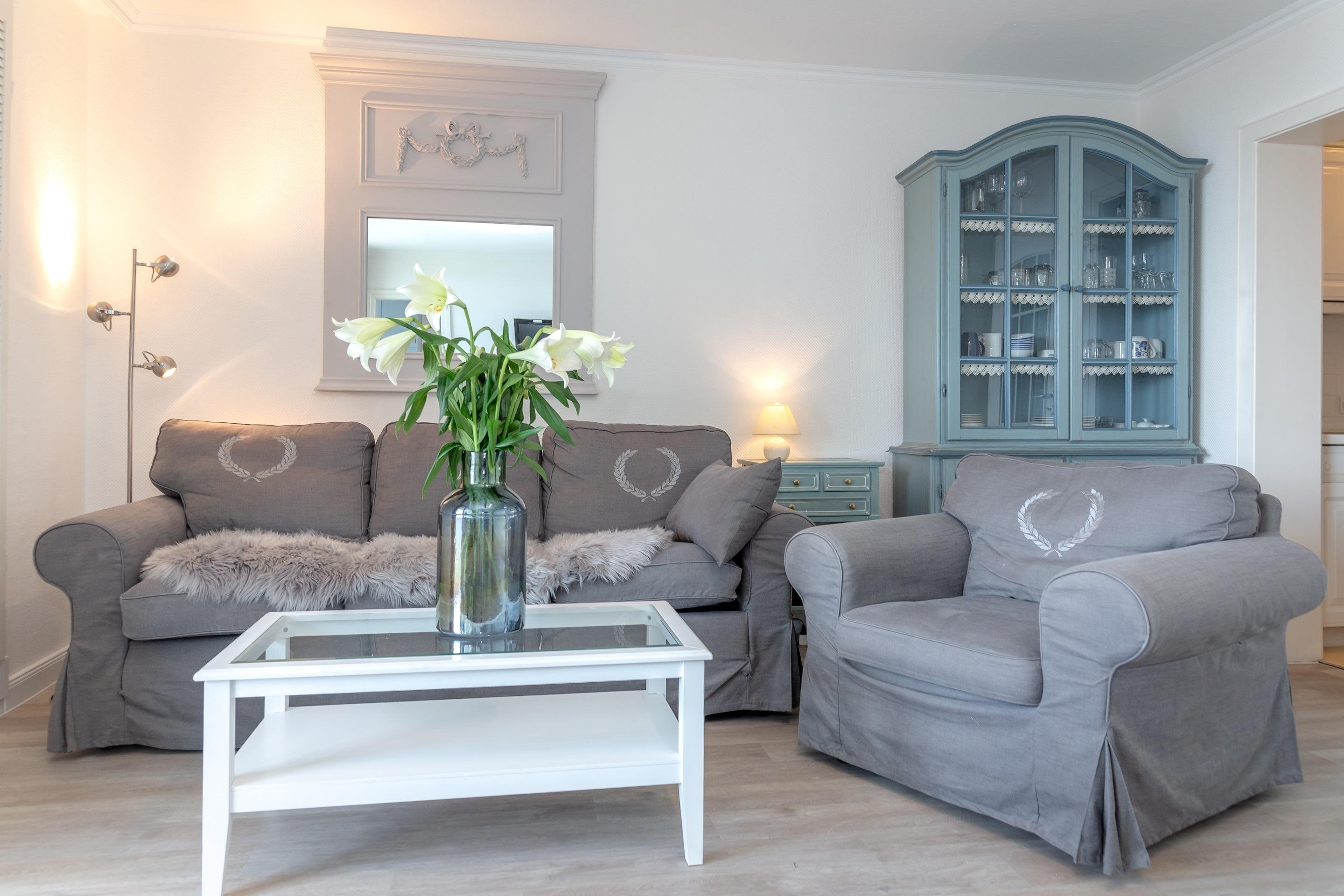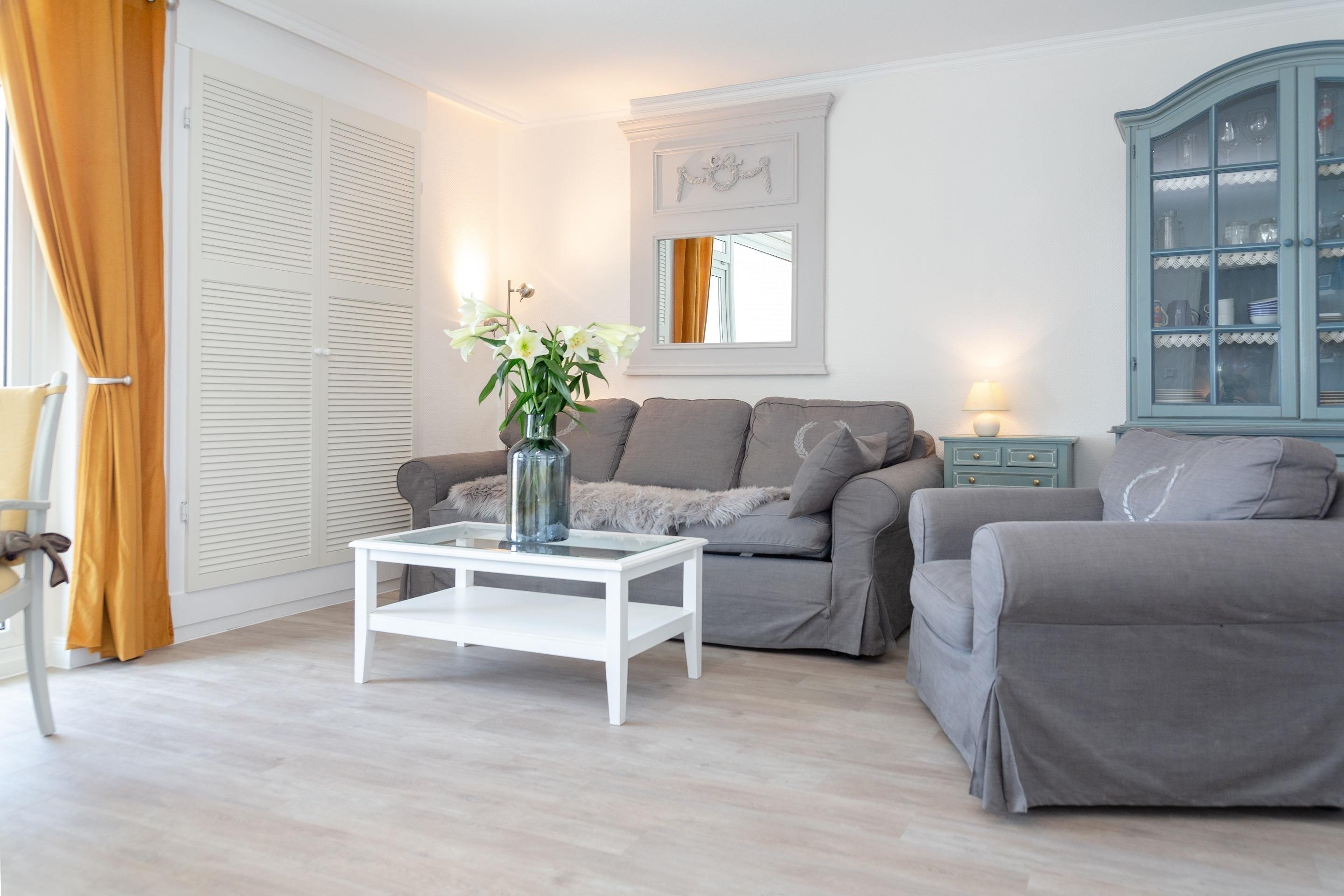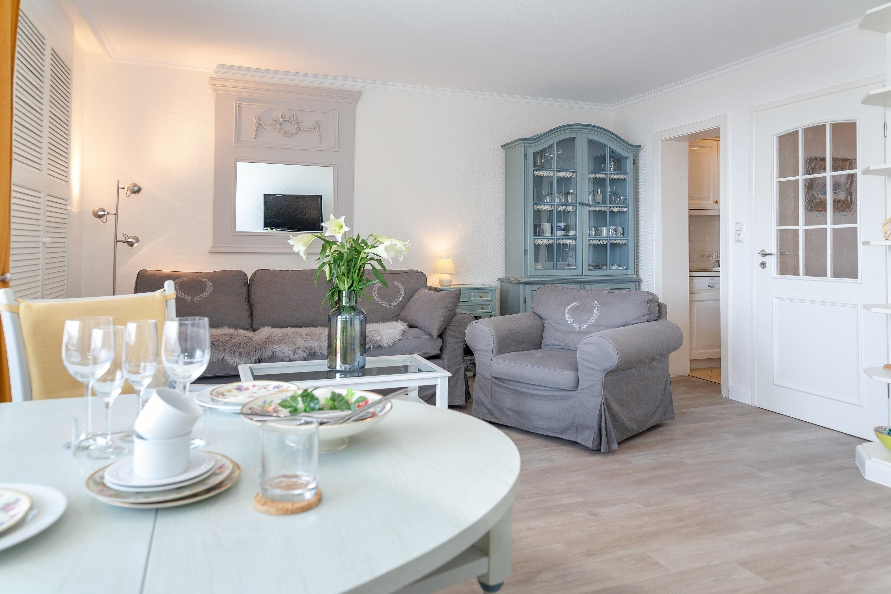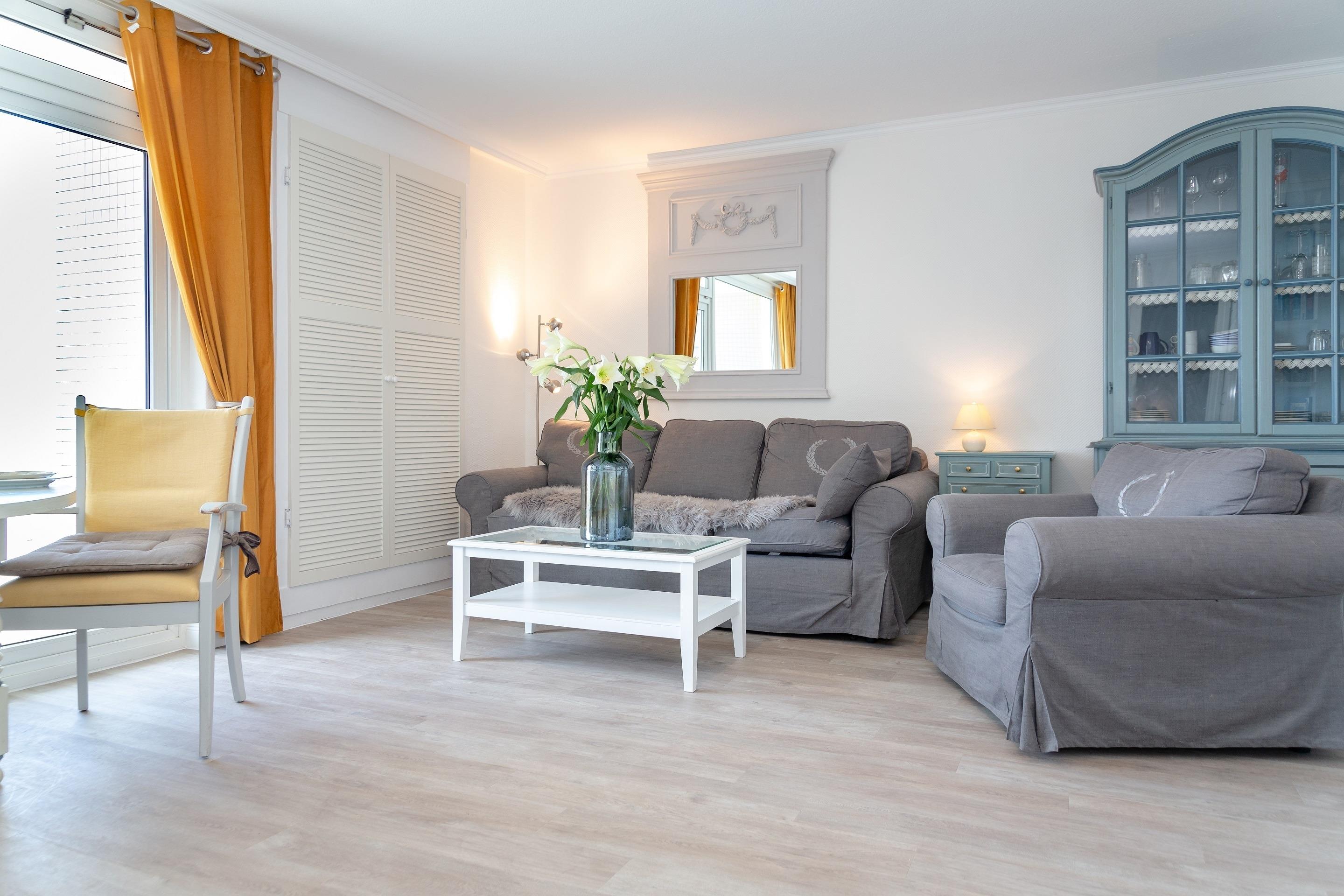 Der Wohnraum besteht aus einer Sitzgarnitur (Drei-Sitzer-Couch und Sessel), einem Doppelschrankbett, einem Essplatz, einem Sat-Flachbild-TV und einem Radio/CD-Anlage.