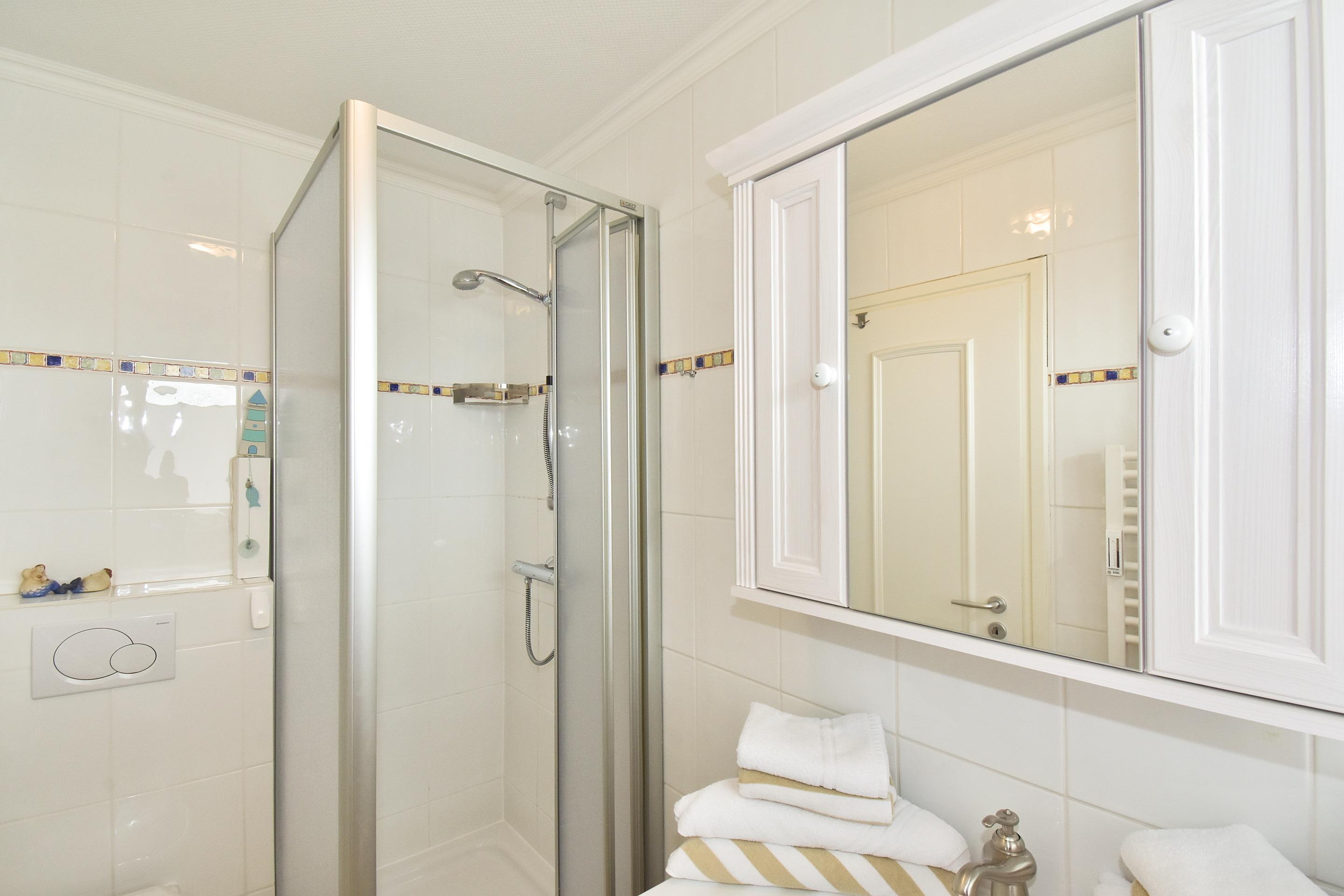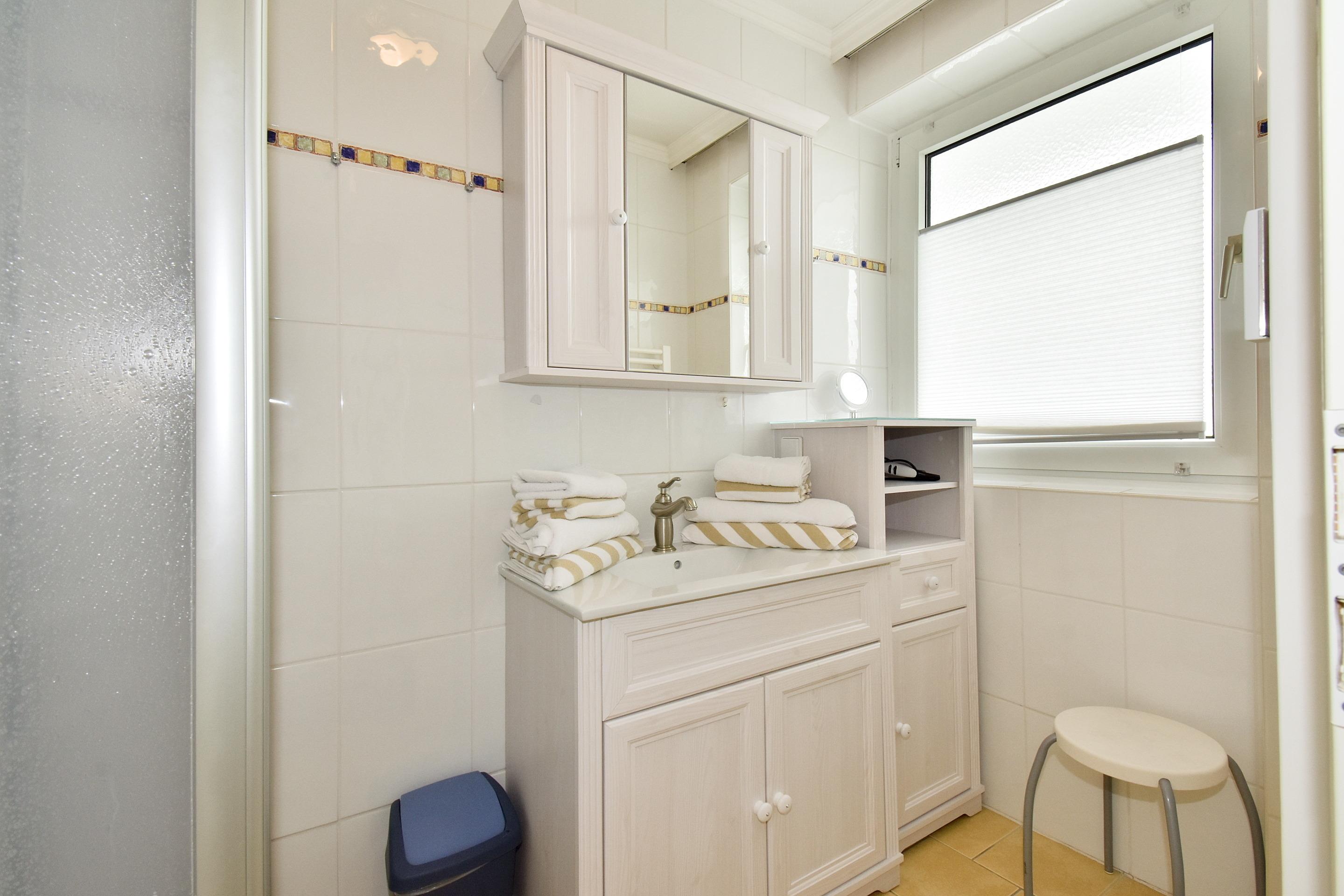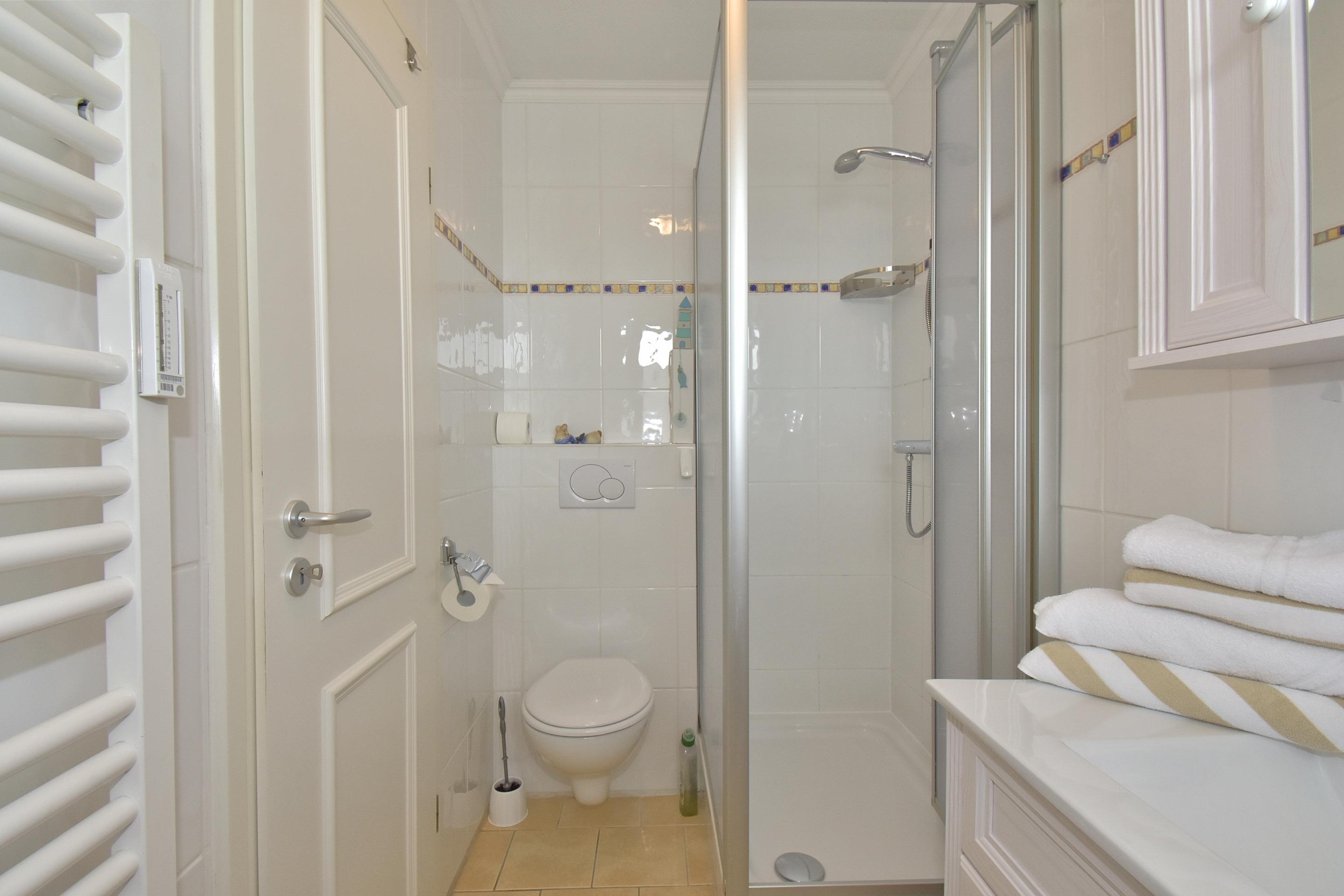 Im Bad befinden sich eine Dusche, ein WC, ein Waschtisch und ein Fenster.
