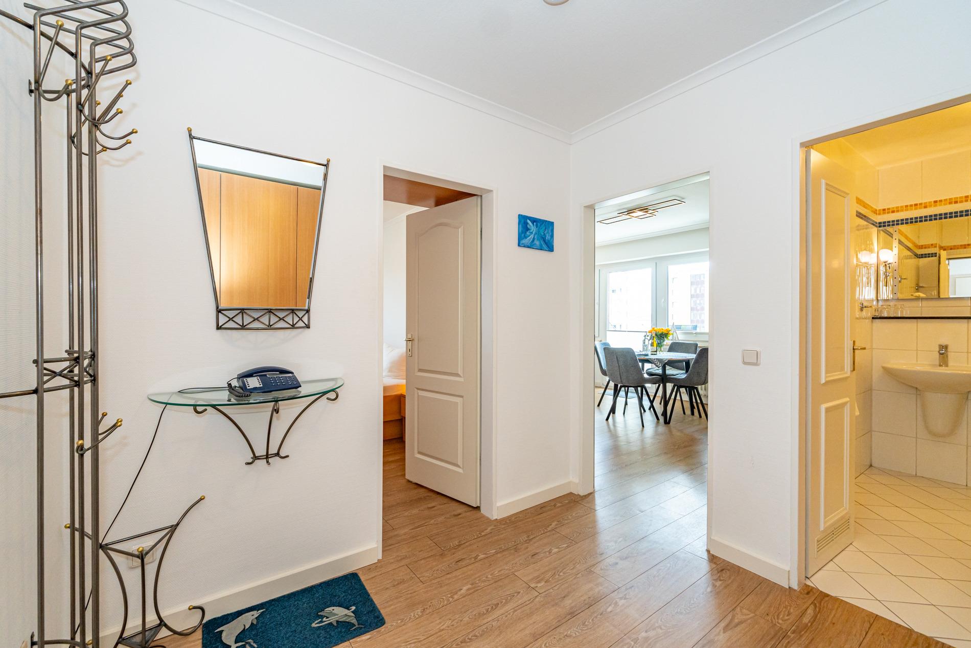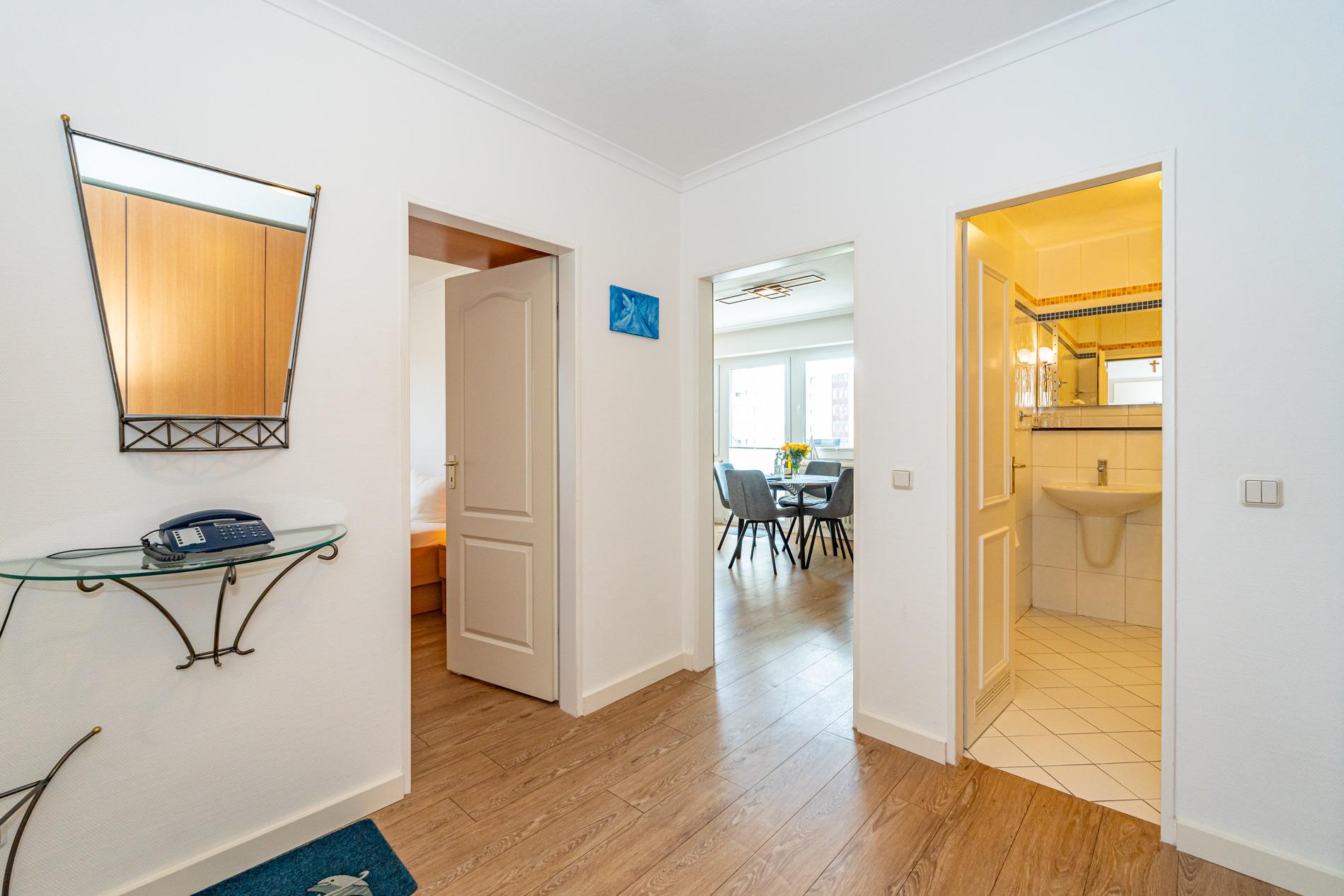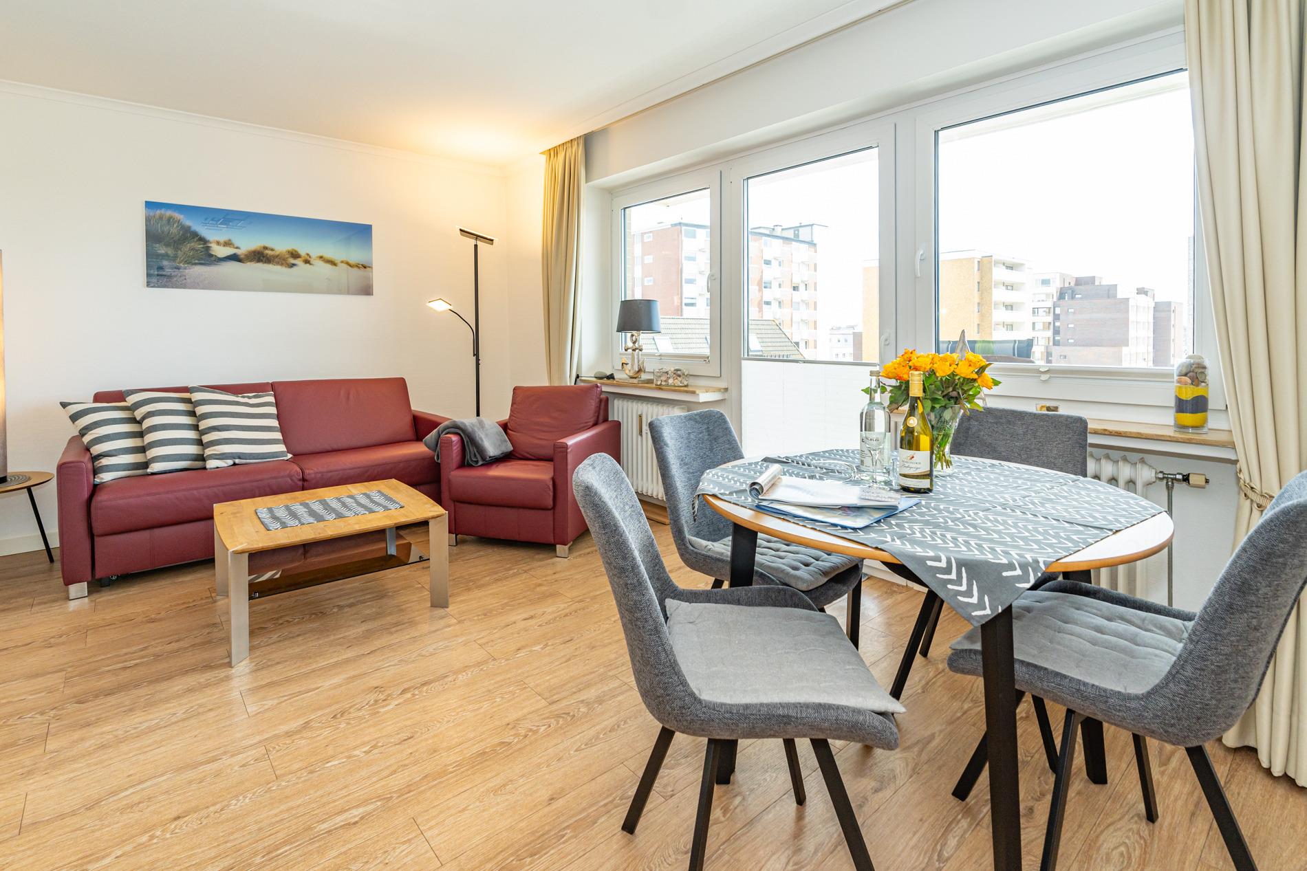 Komfortable 2-Zimmer-Nichtraucher-Ferienwohnung, ca. 52 qm in der 3. Etage mit großzügiger Südloggia (mit Balkonmöbeln und Auflagen) für max. 4 Personen.
