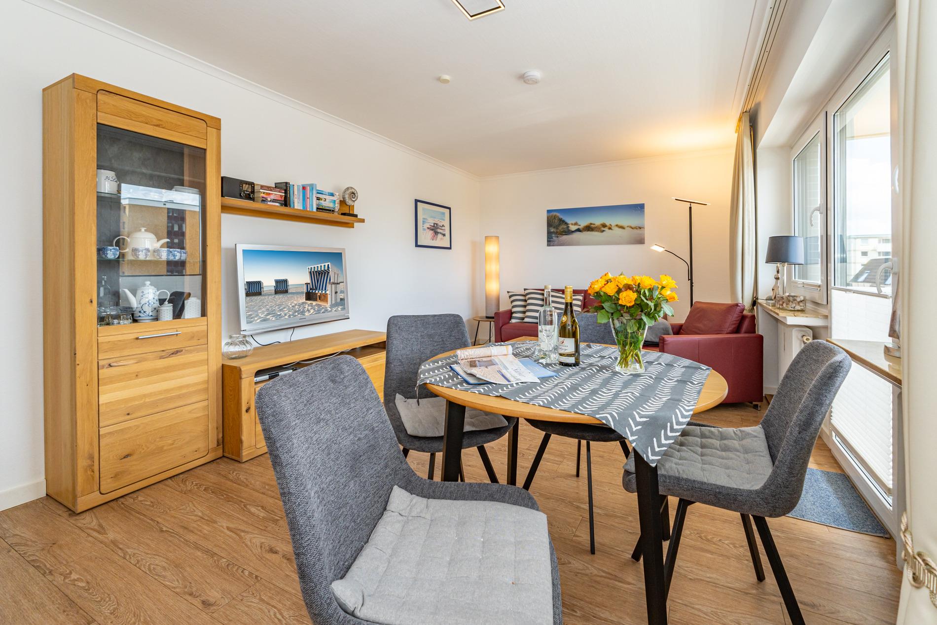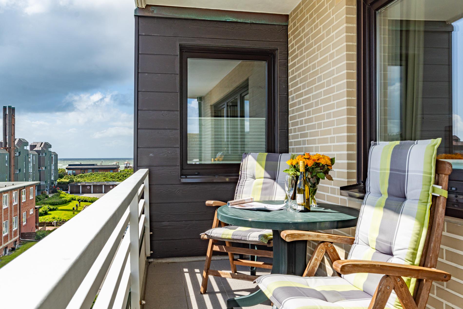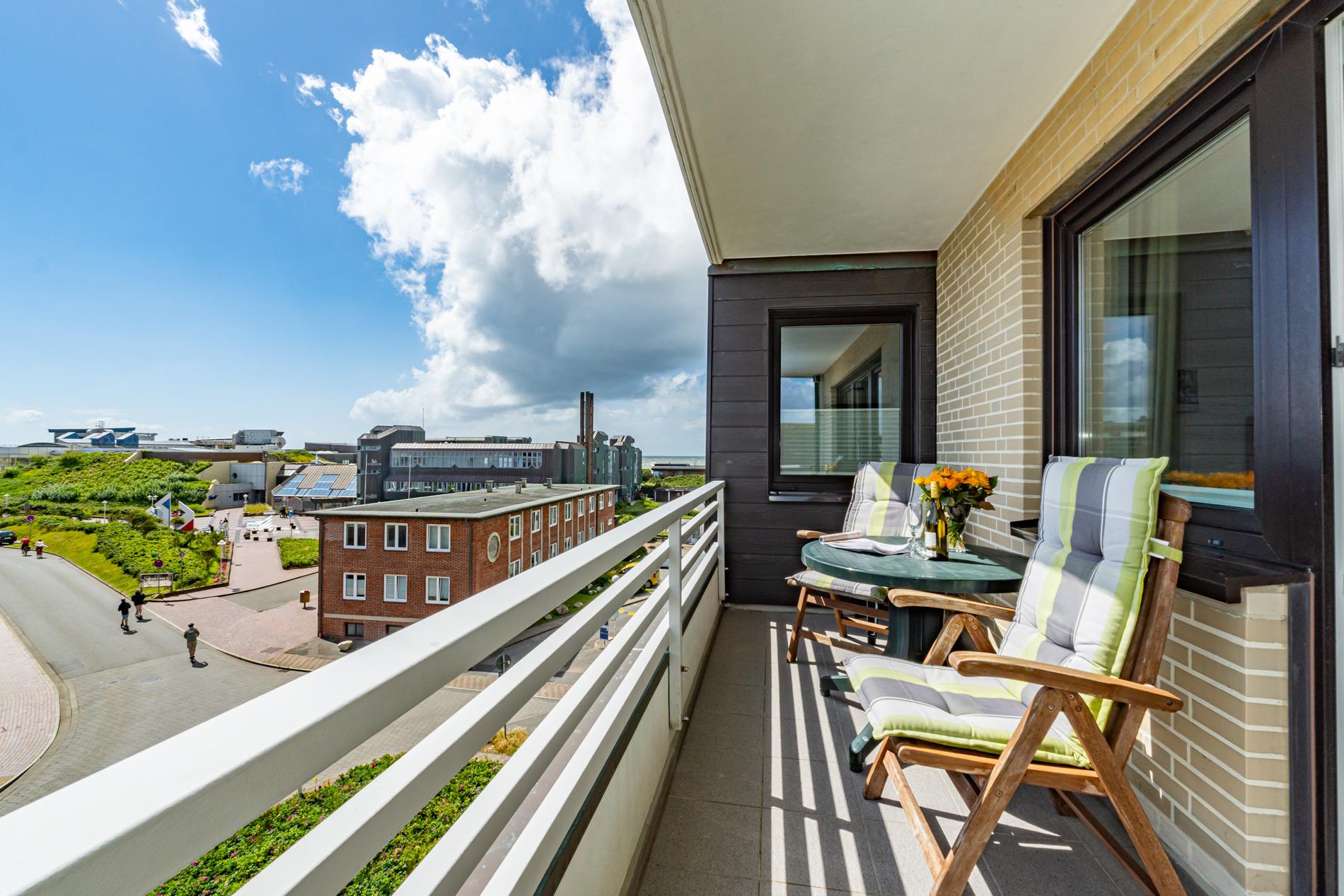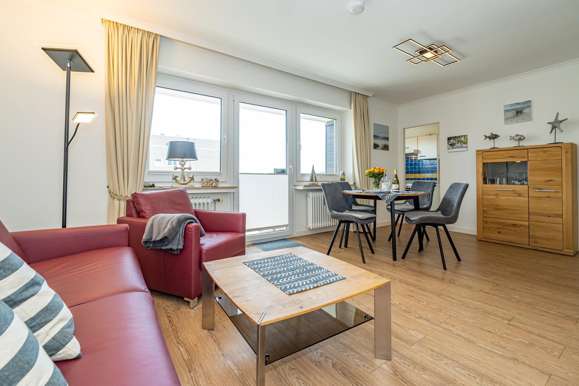 Diese gemütliche Nichtraucher-Ferienwohnung in der 3. Etage bietet auf ca. 52 qm Platz für bis zu 4 Personen. Genießen Sie sonnige Stunden auf der großzügigen Südloggia, ausgestattet mit Balkonmöbeln und Auflagen.