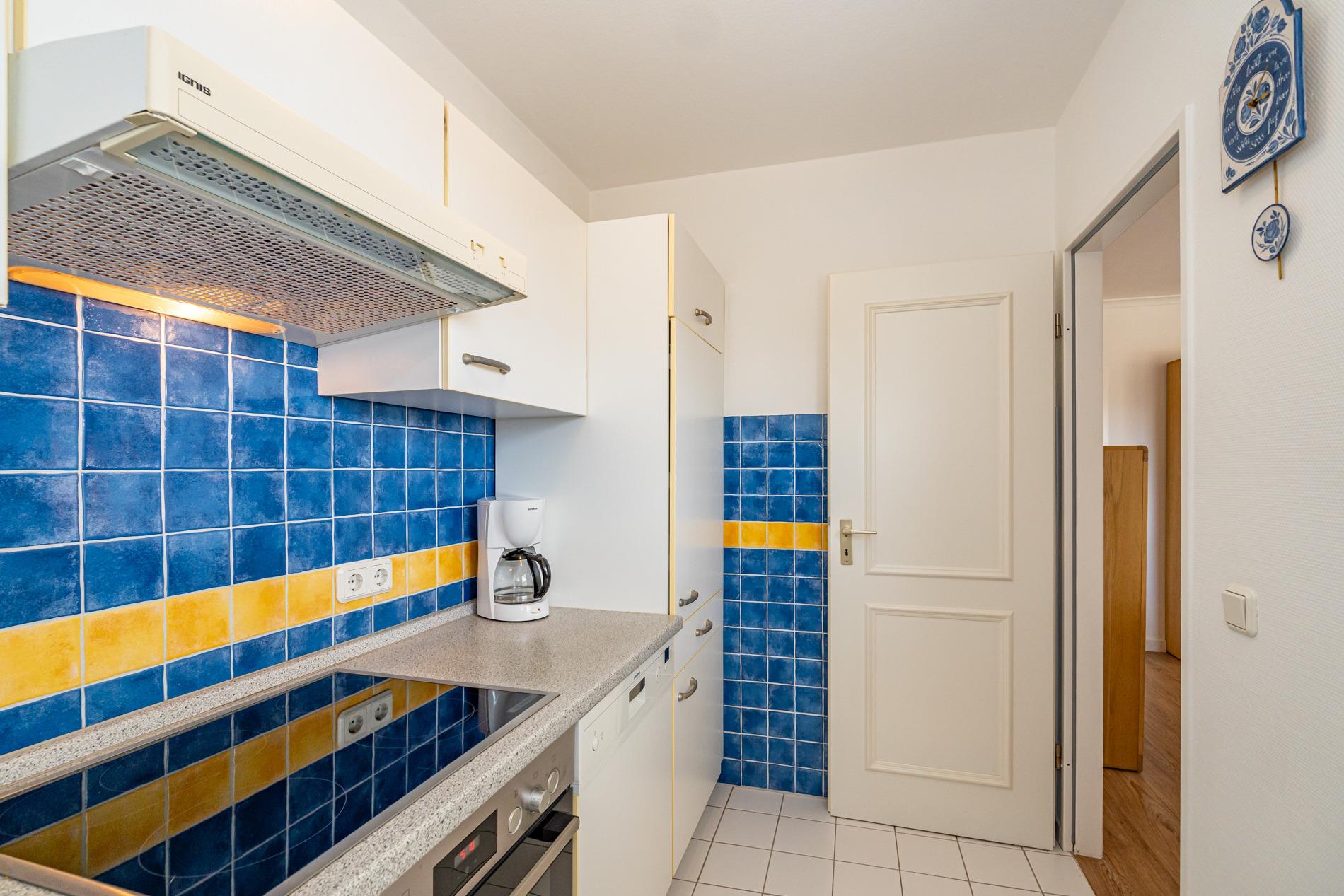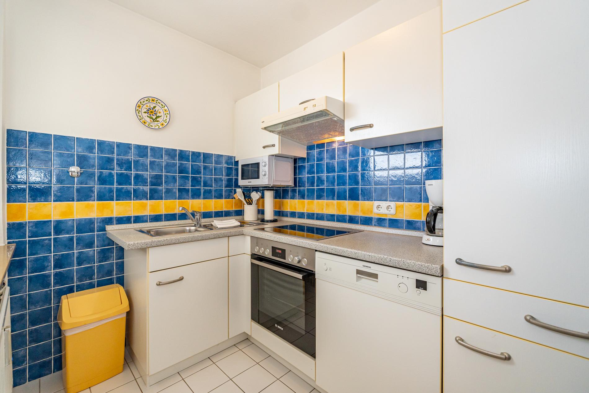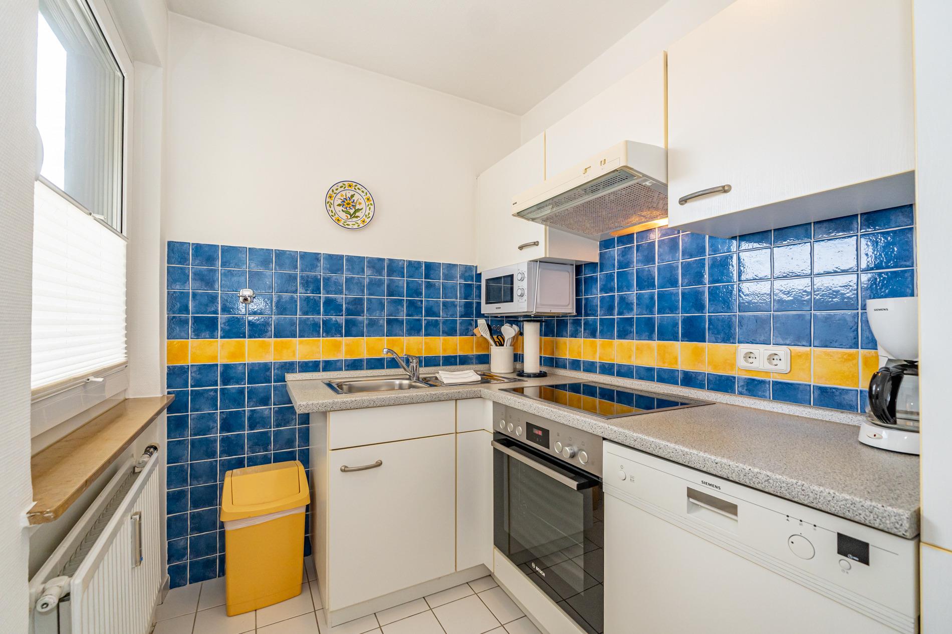Die Küche hat einen Geschirrspüler, ein Ceran-Kochfeld, Backofen, Mikrowelle, einen Kühlschrank mit Gefrierfach und Fenster.