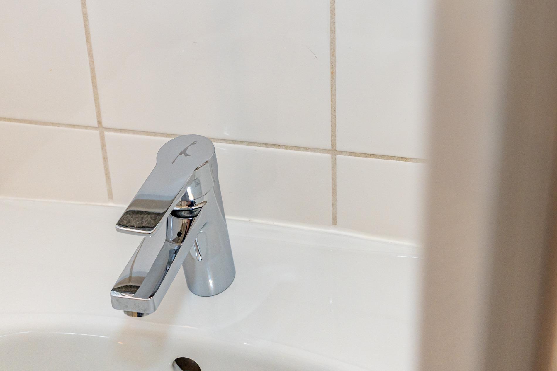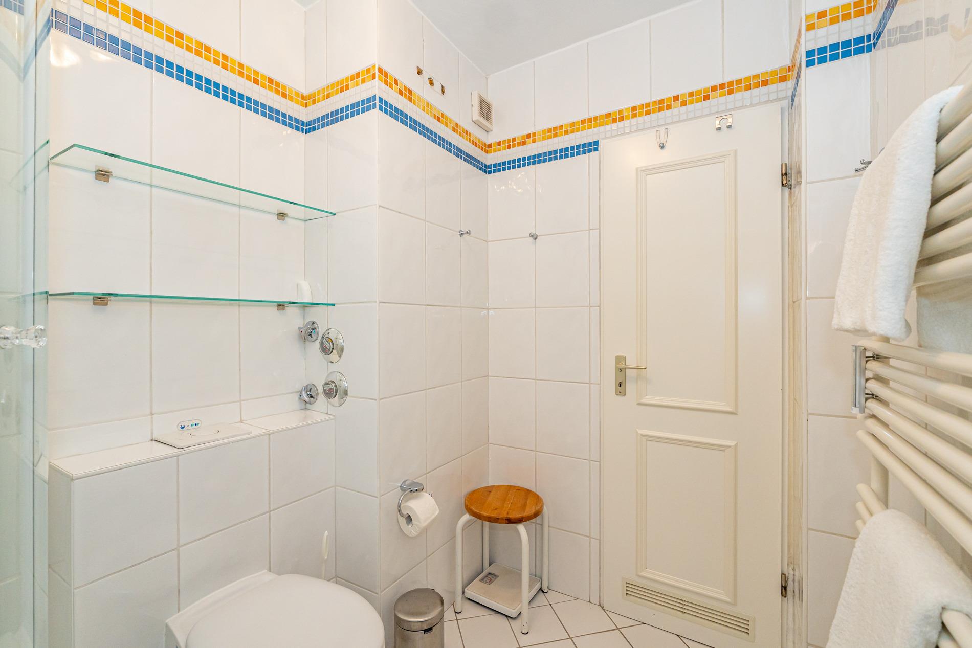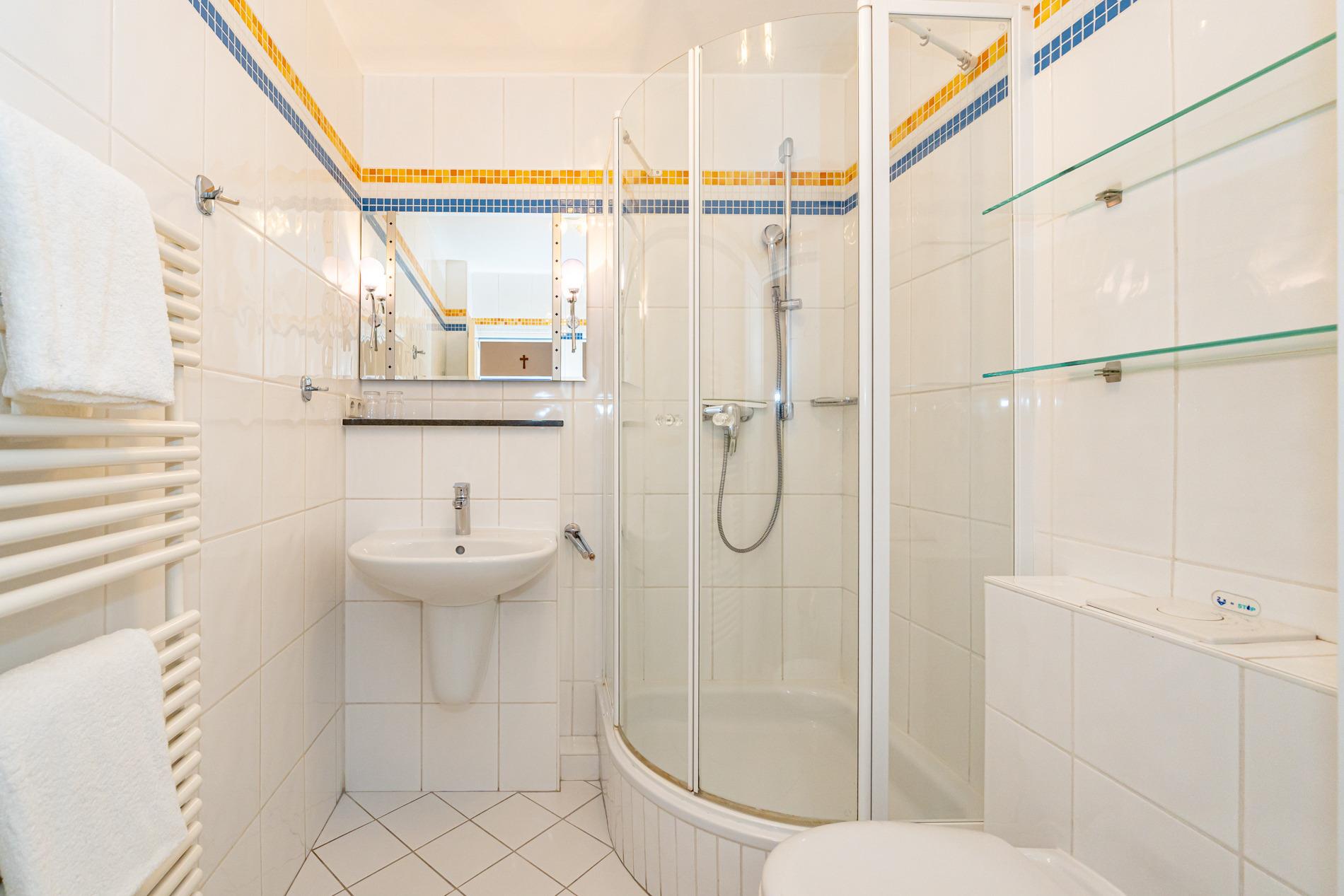 Im Bad befindet sich eine Dusche, ein Waschtisch und ein Handtuchtrockner.