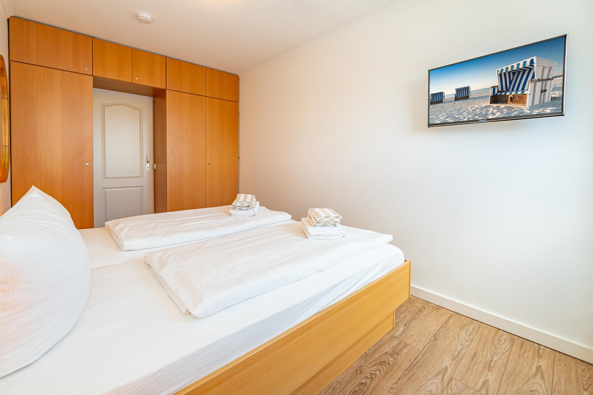 Das Schlafzimmer hat ein Doppelbett (2 m x 1,80 m) mit zwei Einzelmatratzen und einen weiteren Flachbild-TV.