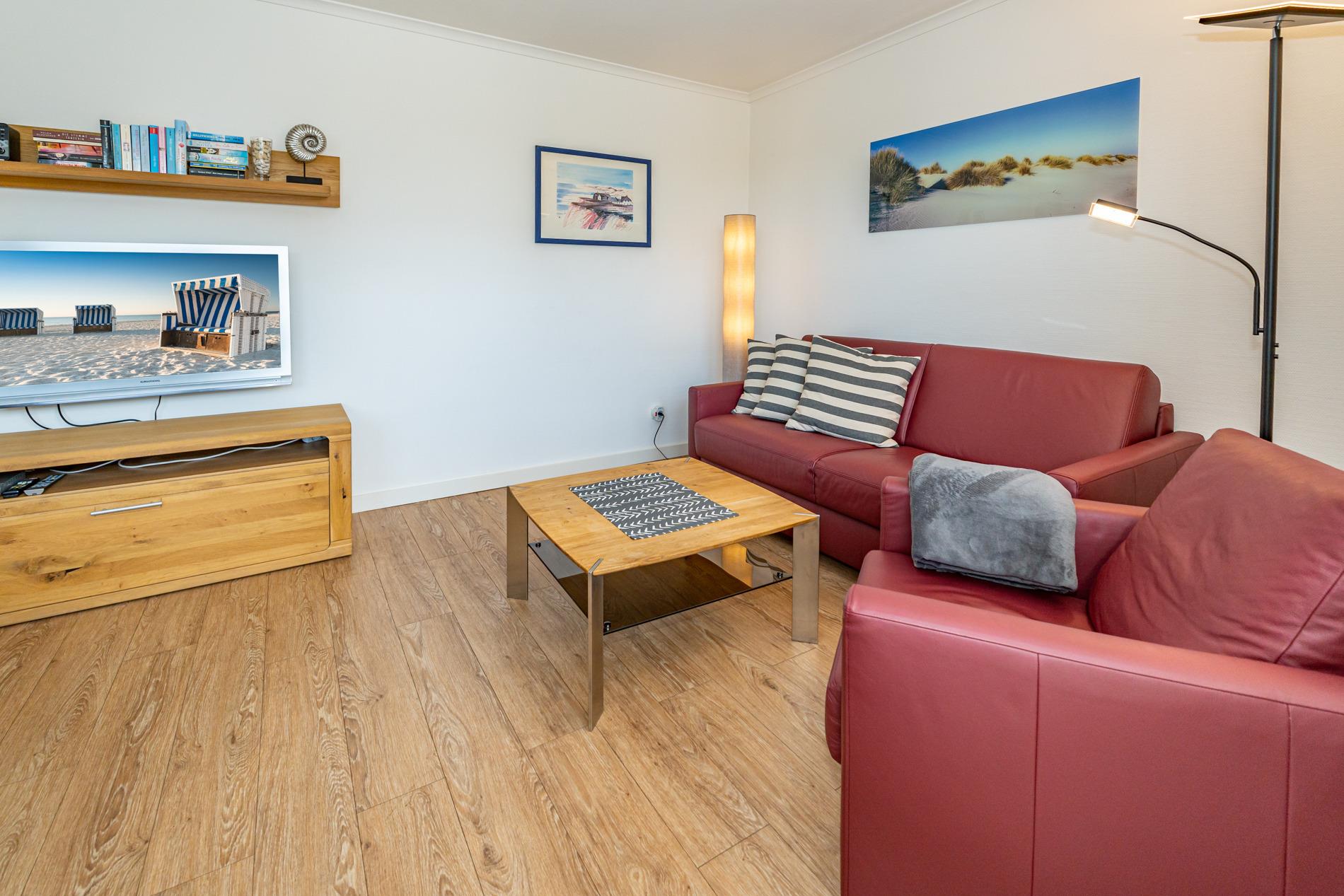 Der Wohnraum besteht aus einer bequemen Sitzgarnitur (eine Schlafcouch, 1,60 x 2 m), einem Essplatz, Kabel-TV, HiFi-Anlage und Telefon.