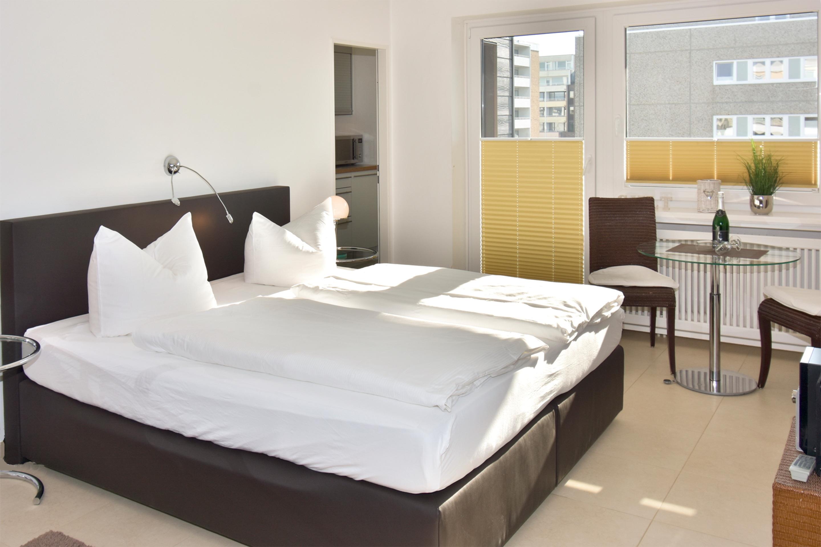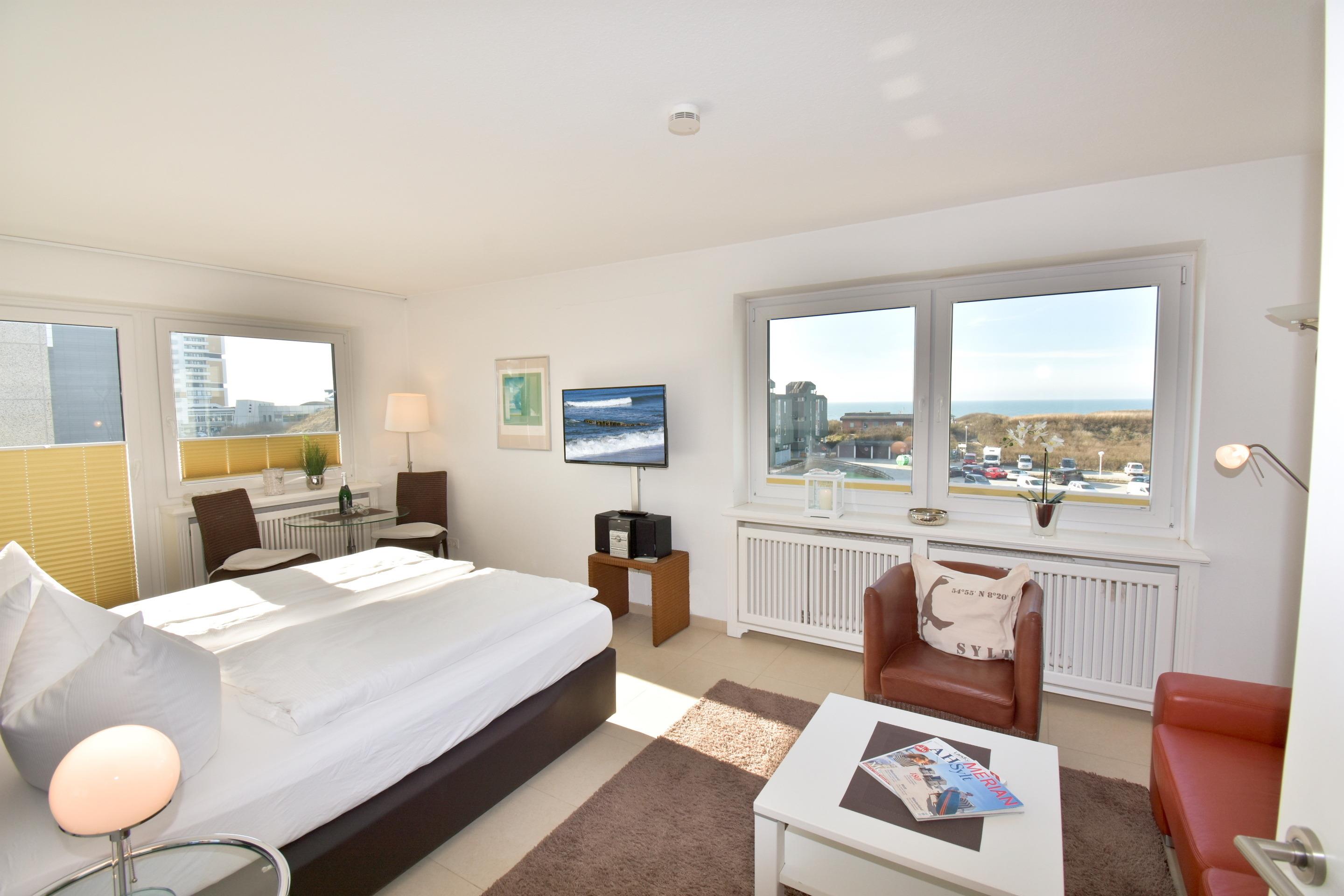 Großzügige 1-Zimmer-Ferienwohnung (ca. 40 qm) mit schönem Meerblick in der 3. Etage für 2 Personen.