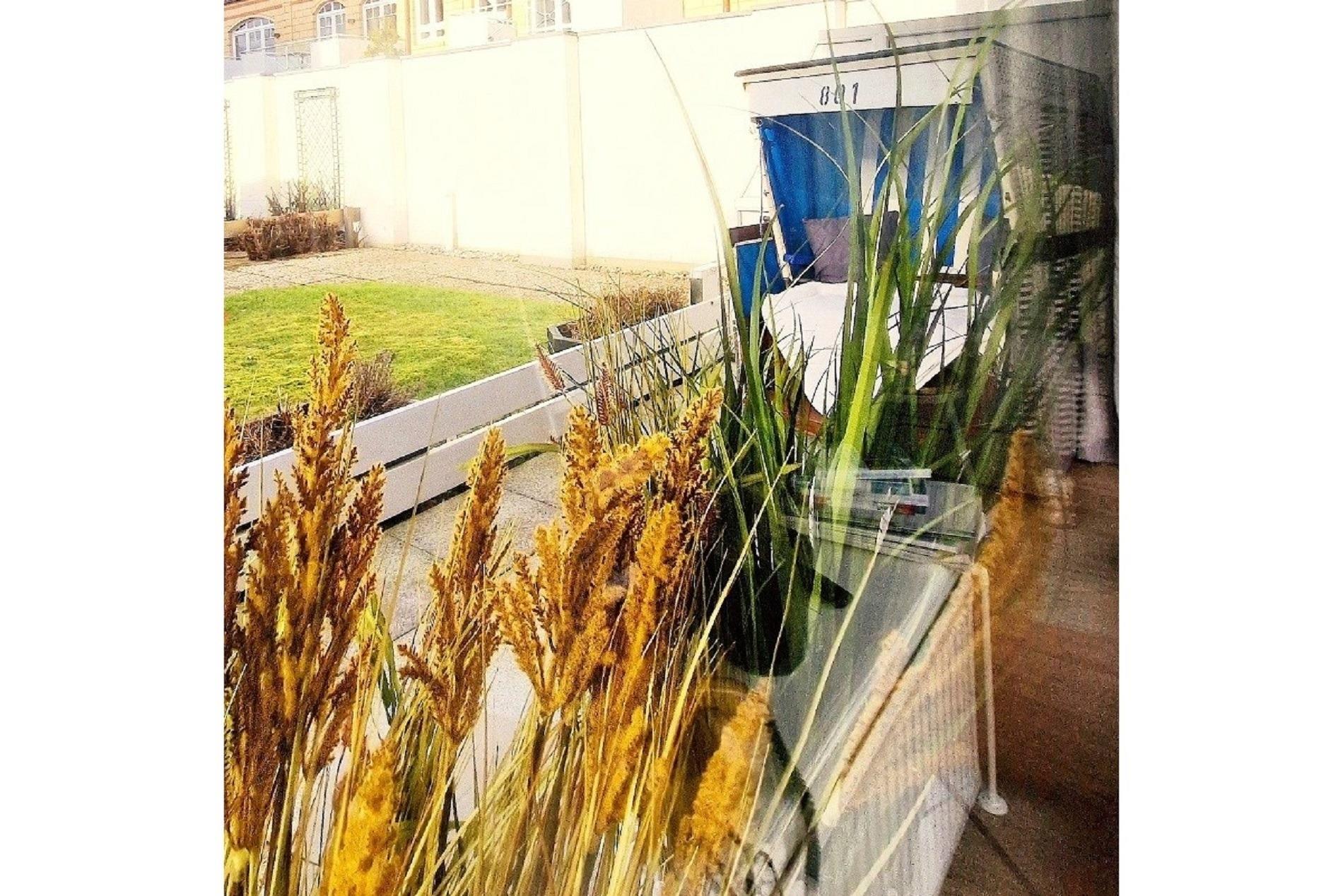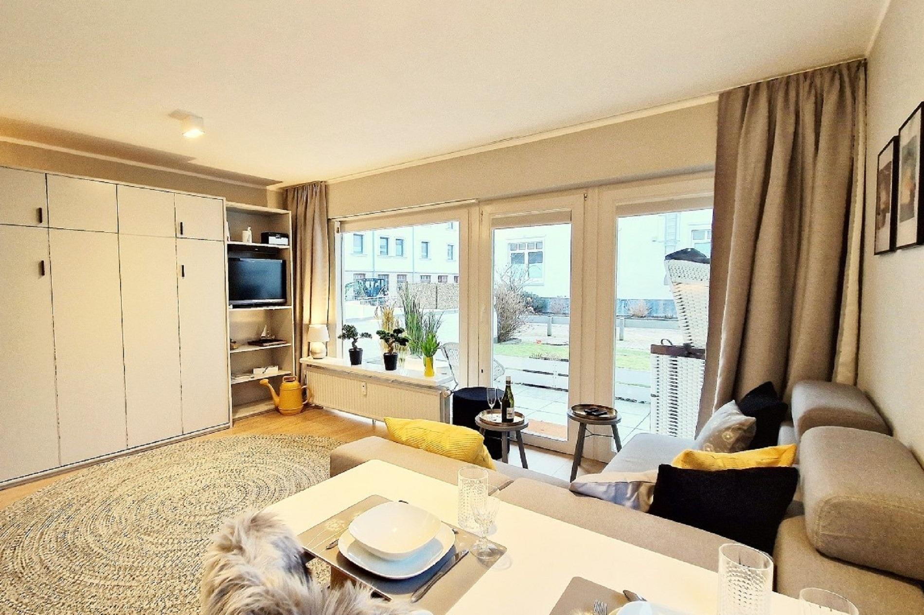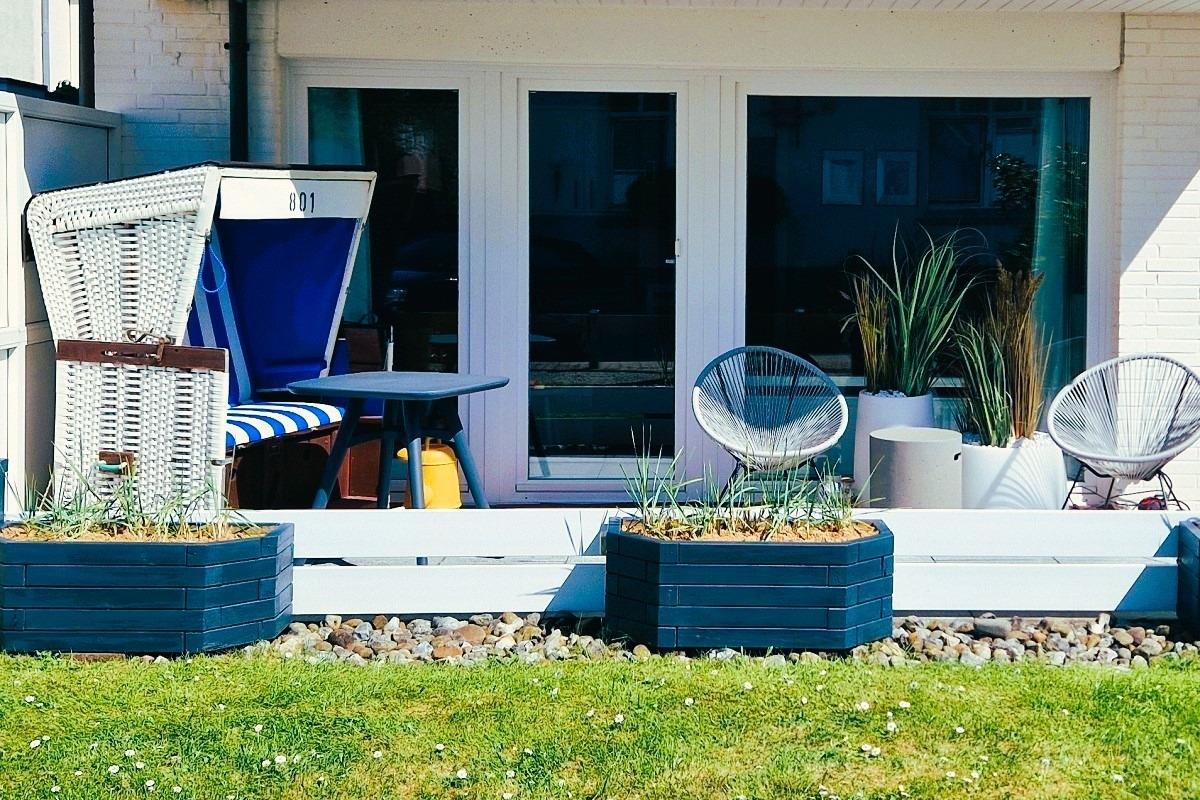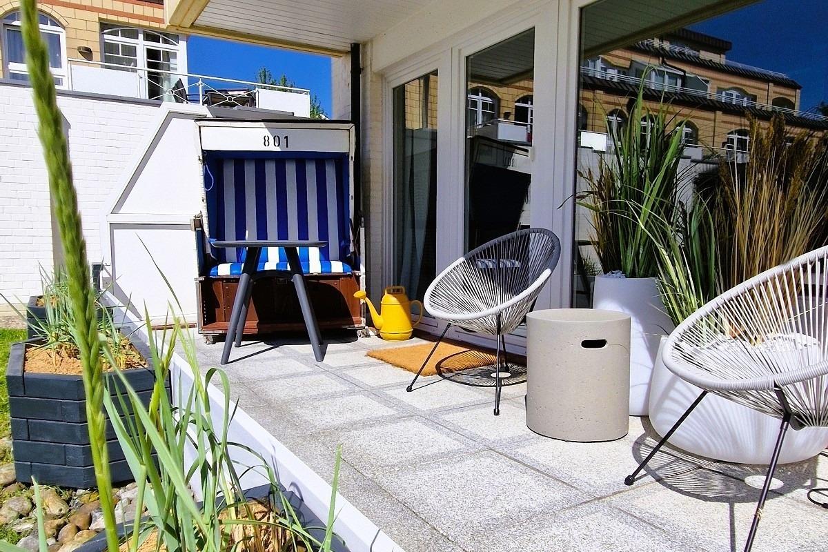 Großzügige 1-Zimmer-Ferienwohnung (ca. 32 qm) im EG für 2 Personen mit Westterrasse (Nachmittagssonne, mit Strandkorb und Terrassenstühlen) und eigenem PKW-Stellplatz in der Tiefgarage.