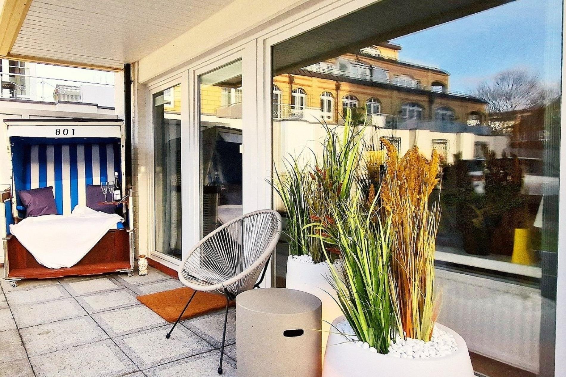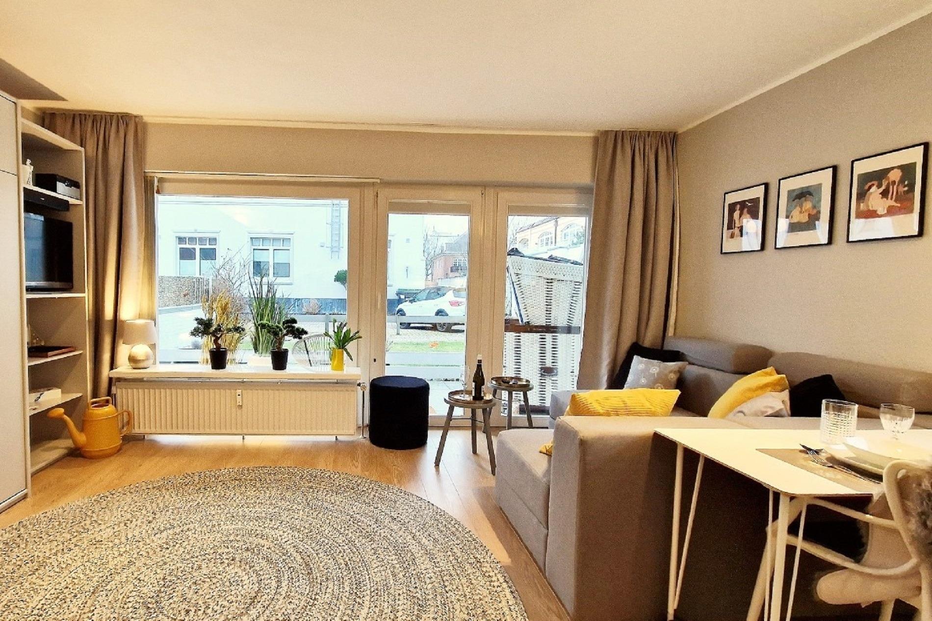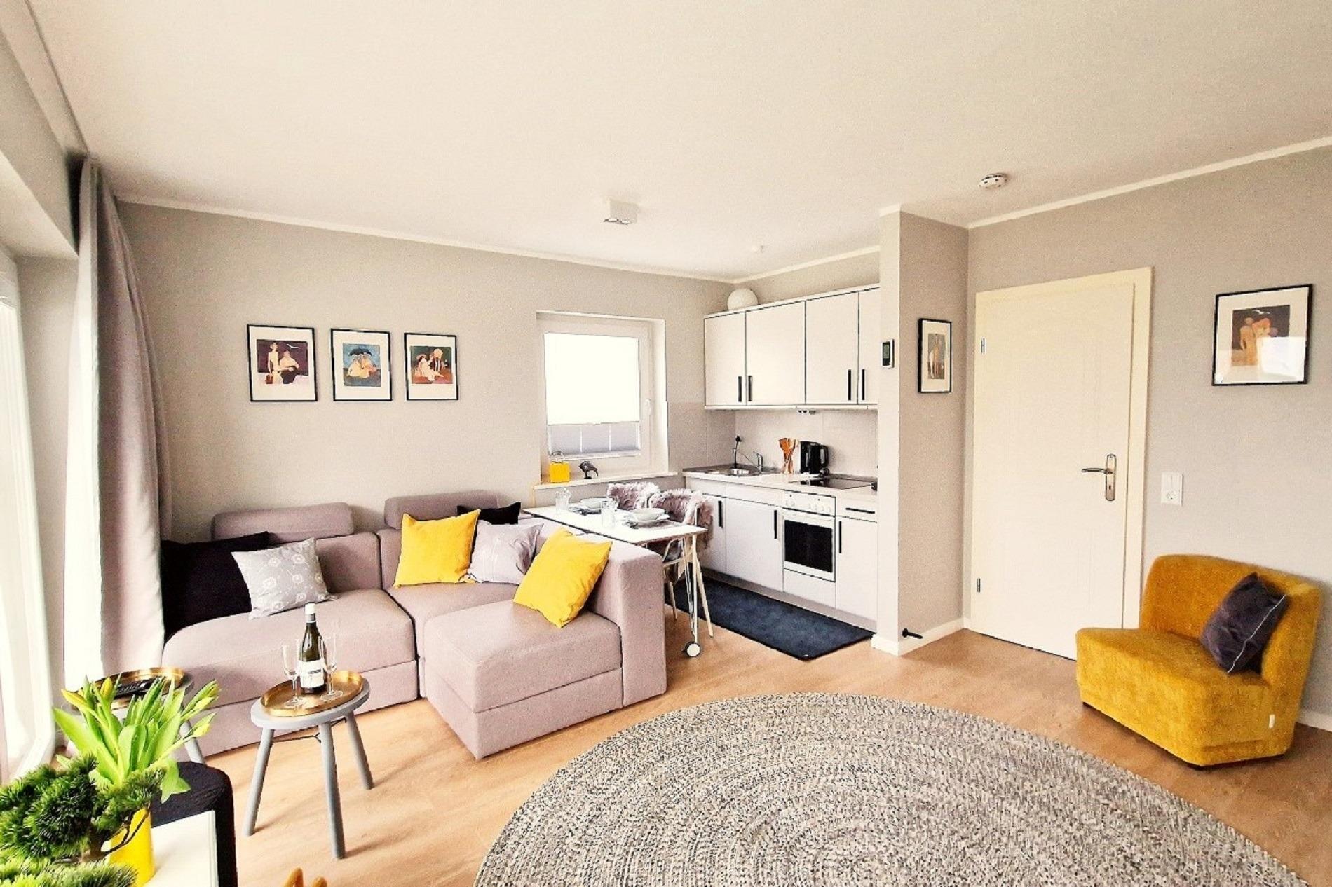 Großzügige 1-Zimmer-Ferienwohnung (ca. 32 qm) im EG für 2 Personen mit Westterrasse (Nachmittagssonne, mit Strandkorb und Terrassenstühlen) und eigenem PKW-Stellplatz in der Tiefgarage.