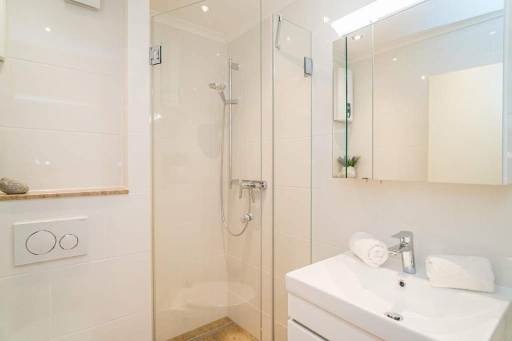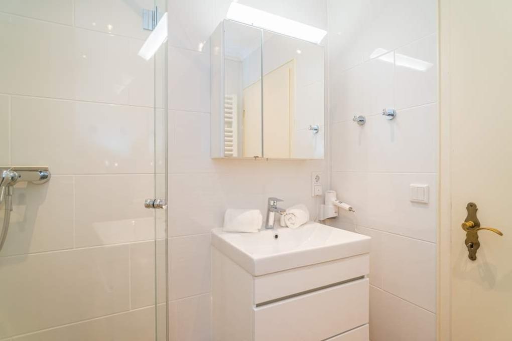 Das Badezimmer ist mit einer Dusche, einem Waschtisch, einem WC und einem Fön.