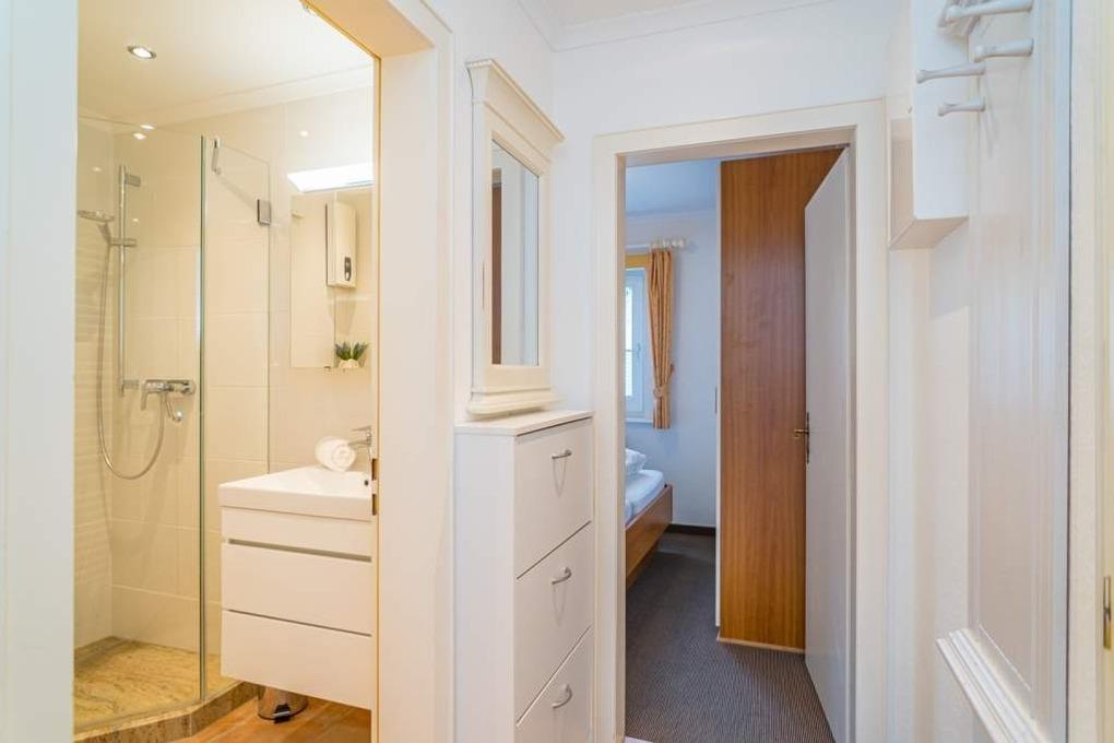 Vom Vorflur mit Garderobe gelangt man in das Wohnzimmer (mit Austritt zum Balkon), das Schlafzimmer und das neue Duschbad/WC.