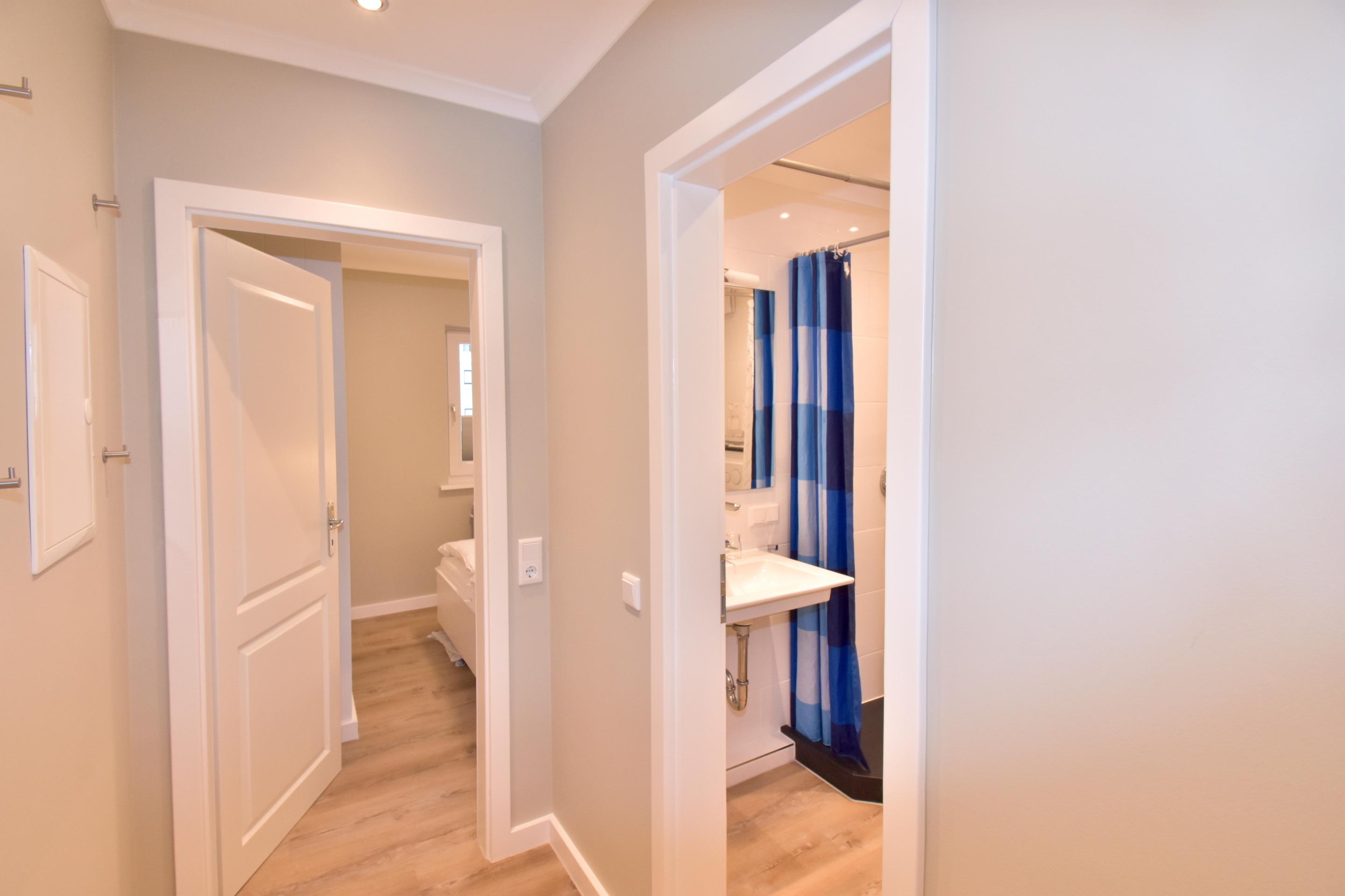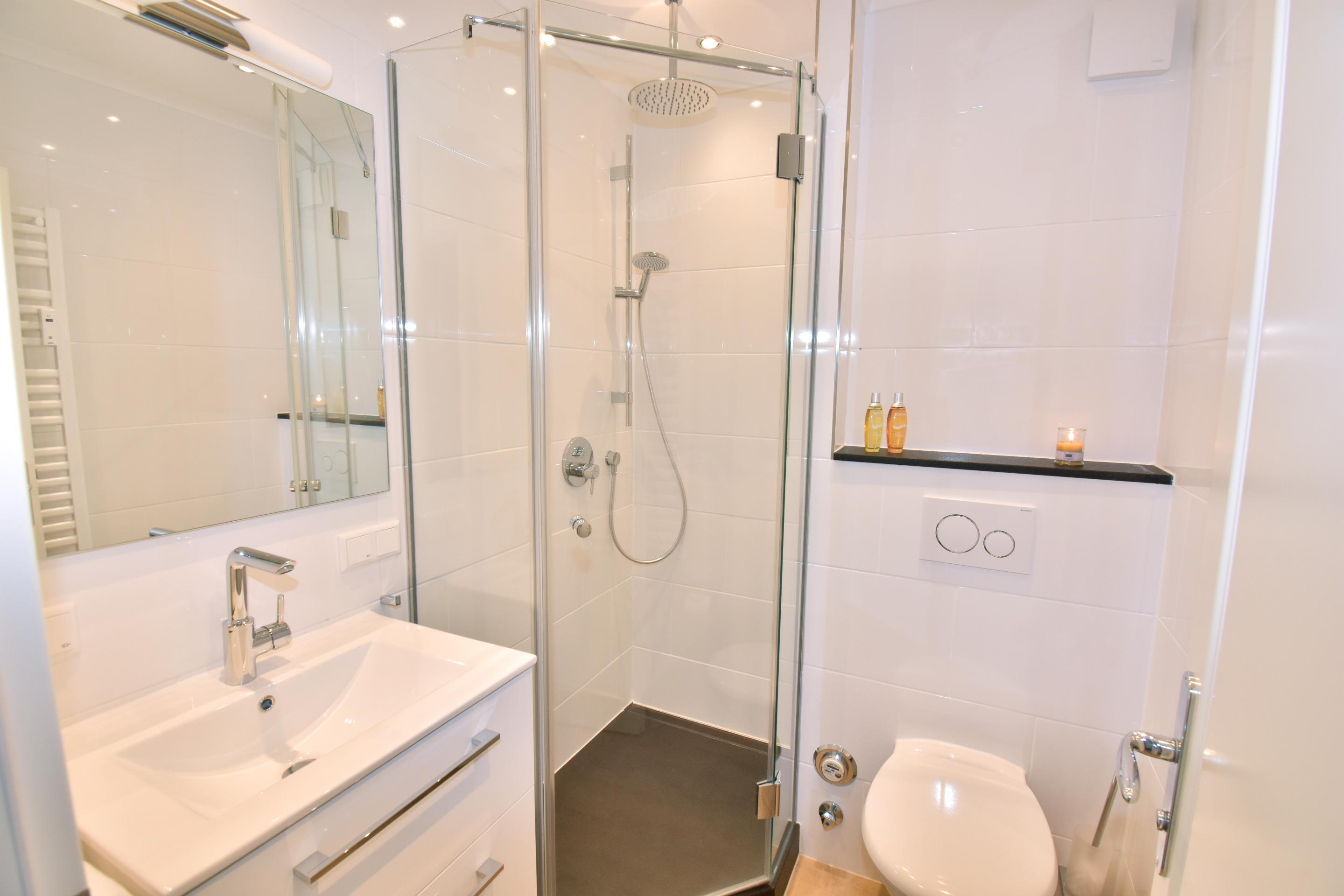 Das moderne neue Badezimmer bietet eine Dusche mit extraflachem Einstieg, einen Handtuchheizkörper, einen Waschtisch, Fön und WC und ist perfekt für den Start in einen entspannten Urlaubstag.