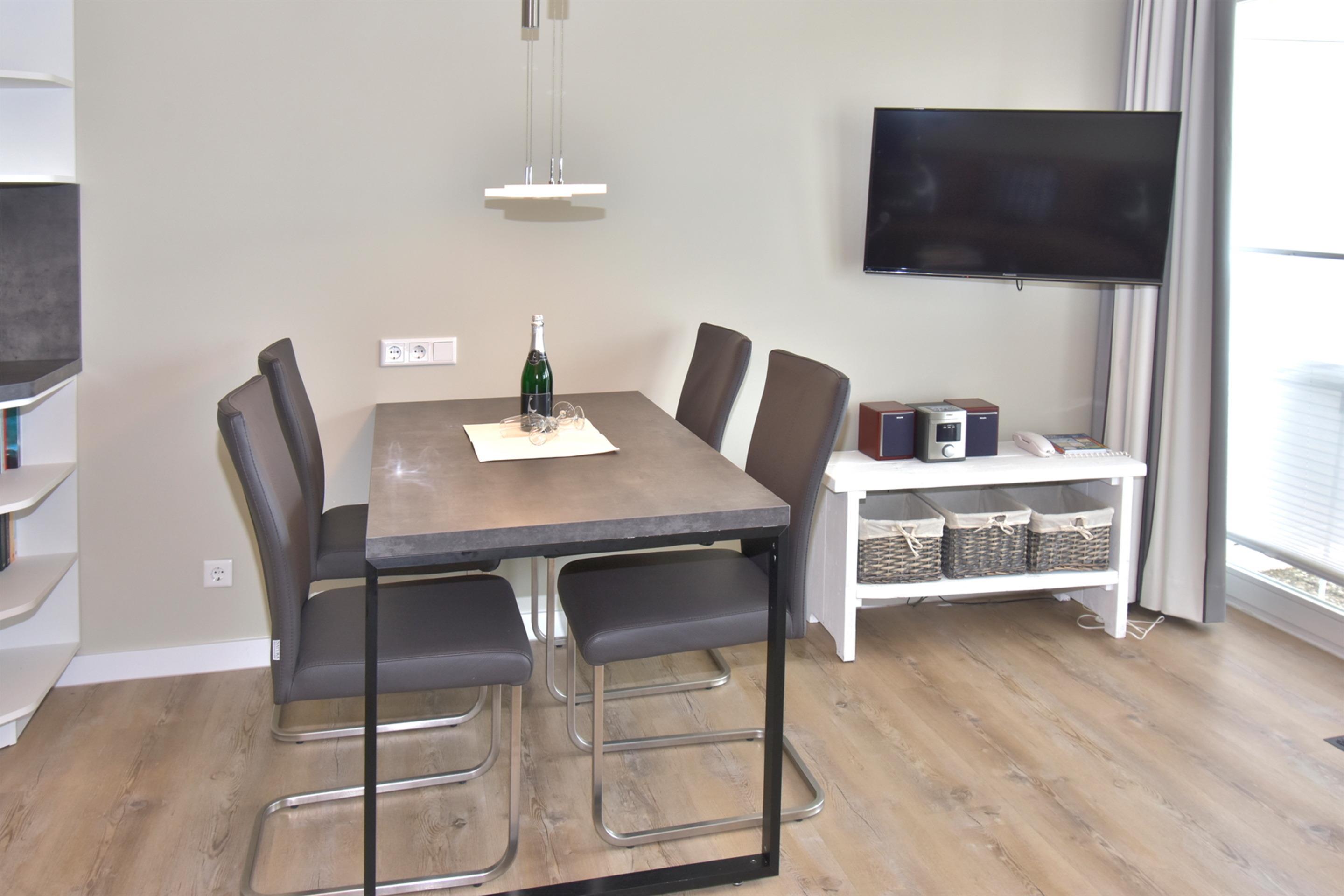 Im Wohnraum lässt die Ausstattung mit einem 49-Zoll-Flachbild-TV keine Wünsche offen. Des weiteren sorgt eine hochwertige Schlafcouch von Bielefelder Werkstätten mit einer Liegefläche von 1,40 x 1,98 m in Komforthöhe für optimalen Schlafkomfort. Ein gemütlicher Cocktailsessel lädt zum relaxen ein.