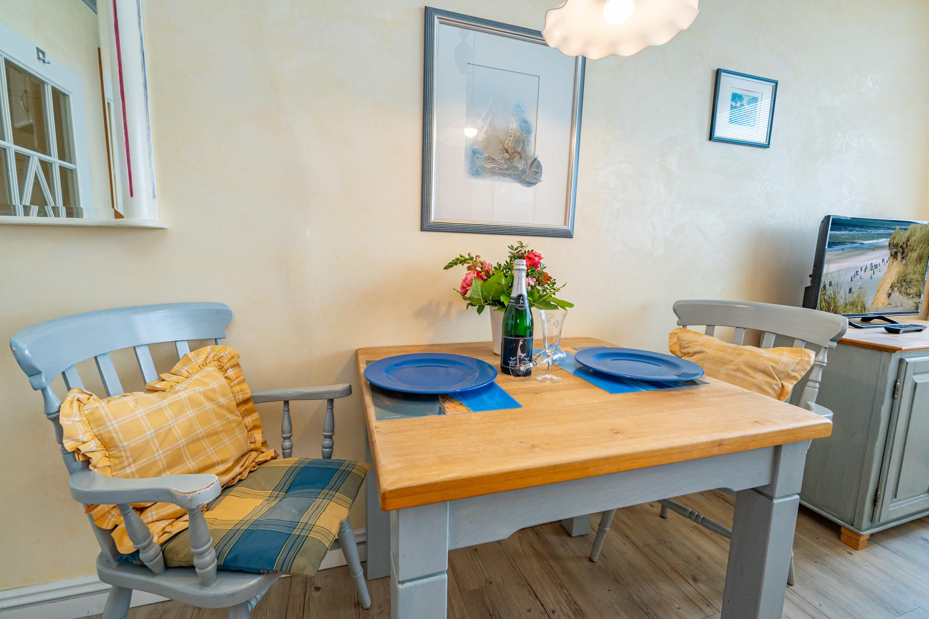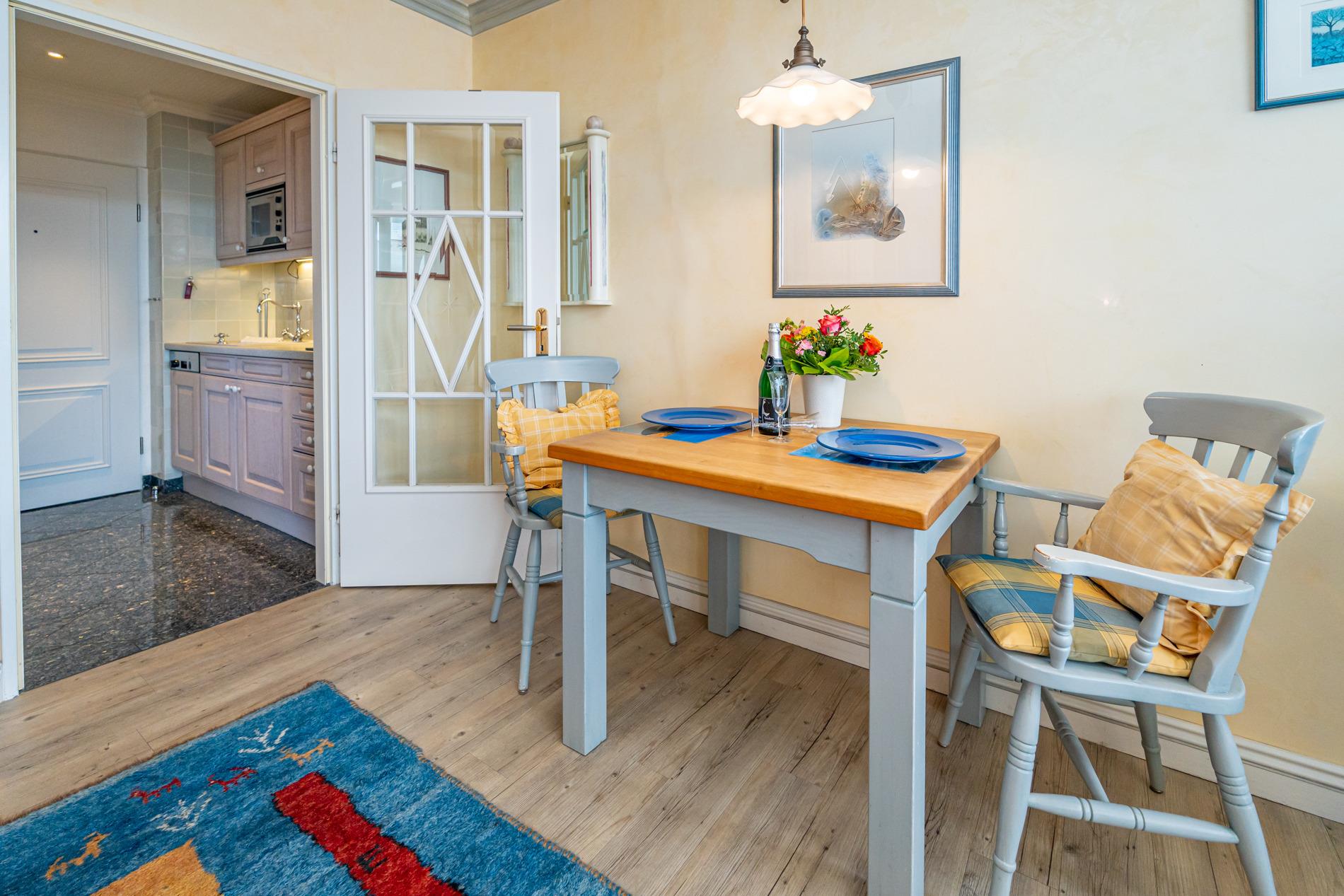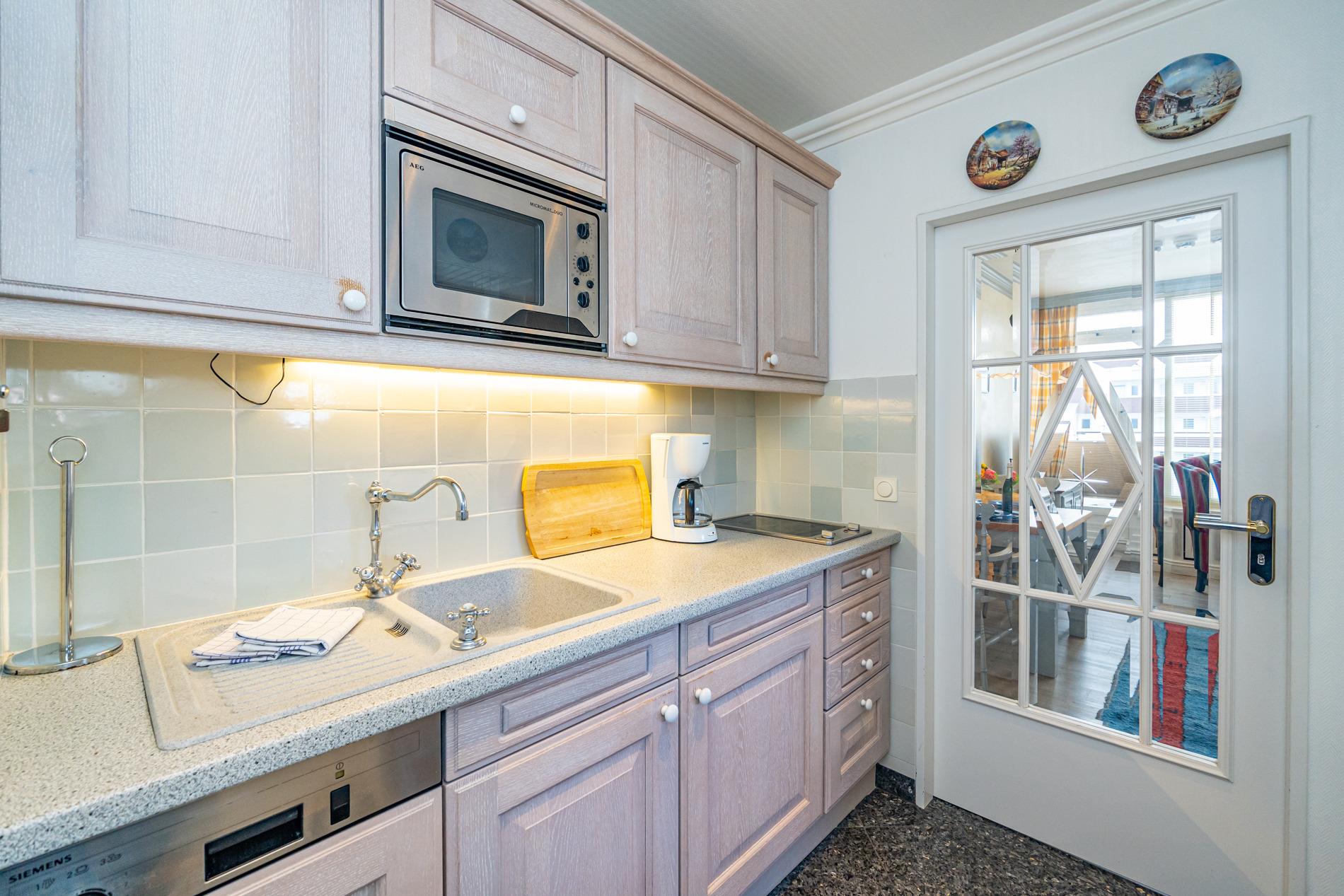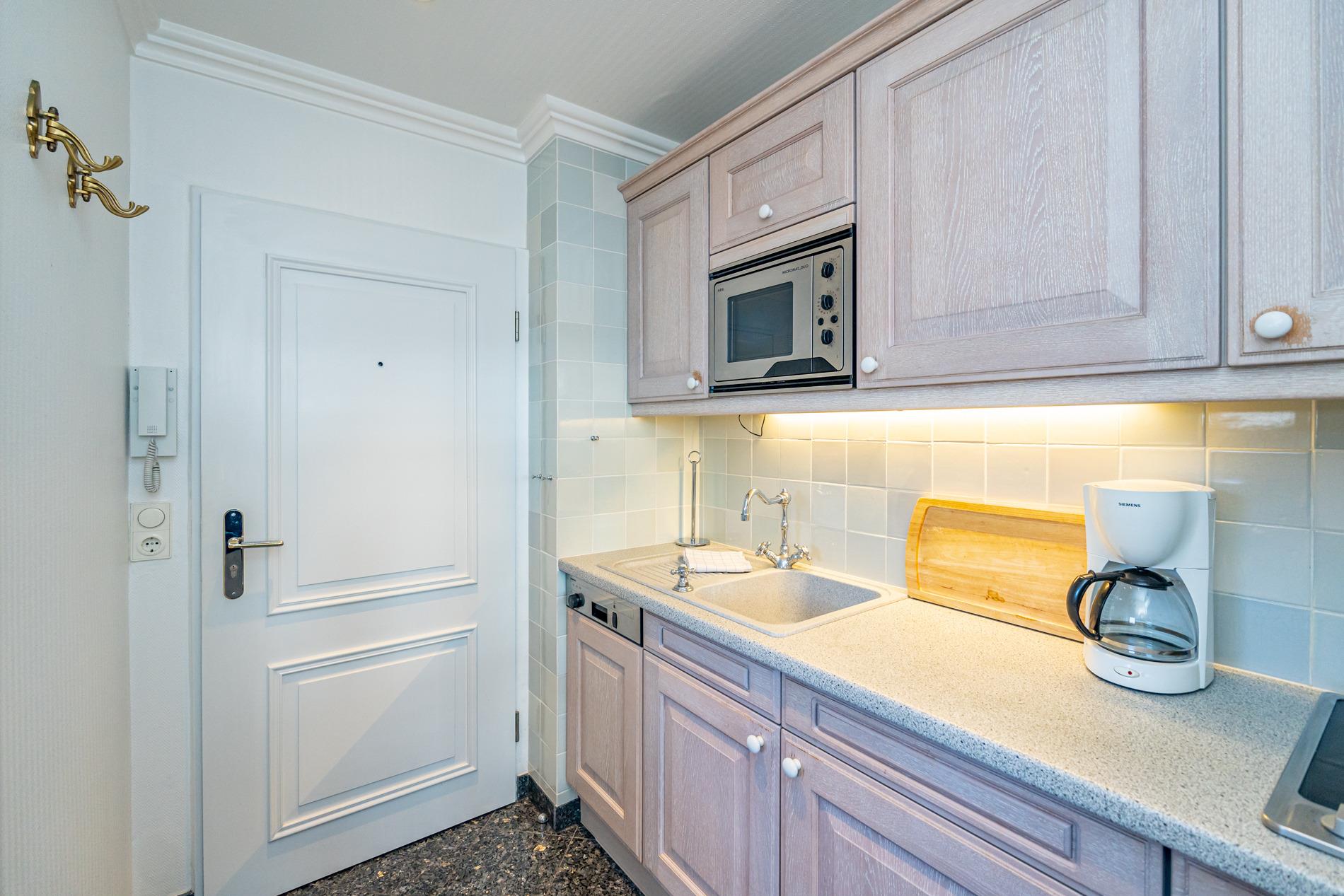 Die Küchenzeile ist funktional ausgestattet mit Geschirrspüler, 2-Felder-Cerankochfeld, Mikrowelle und Kühlschrank. Kaffeemaschine, Wasserkocher und Toaster gehören zur Grundausstattung.