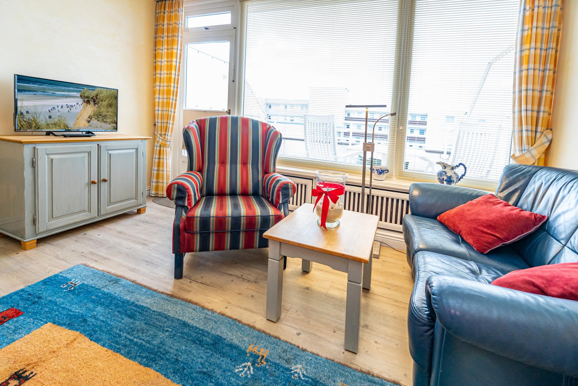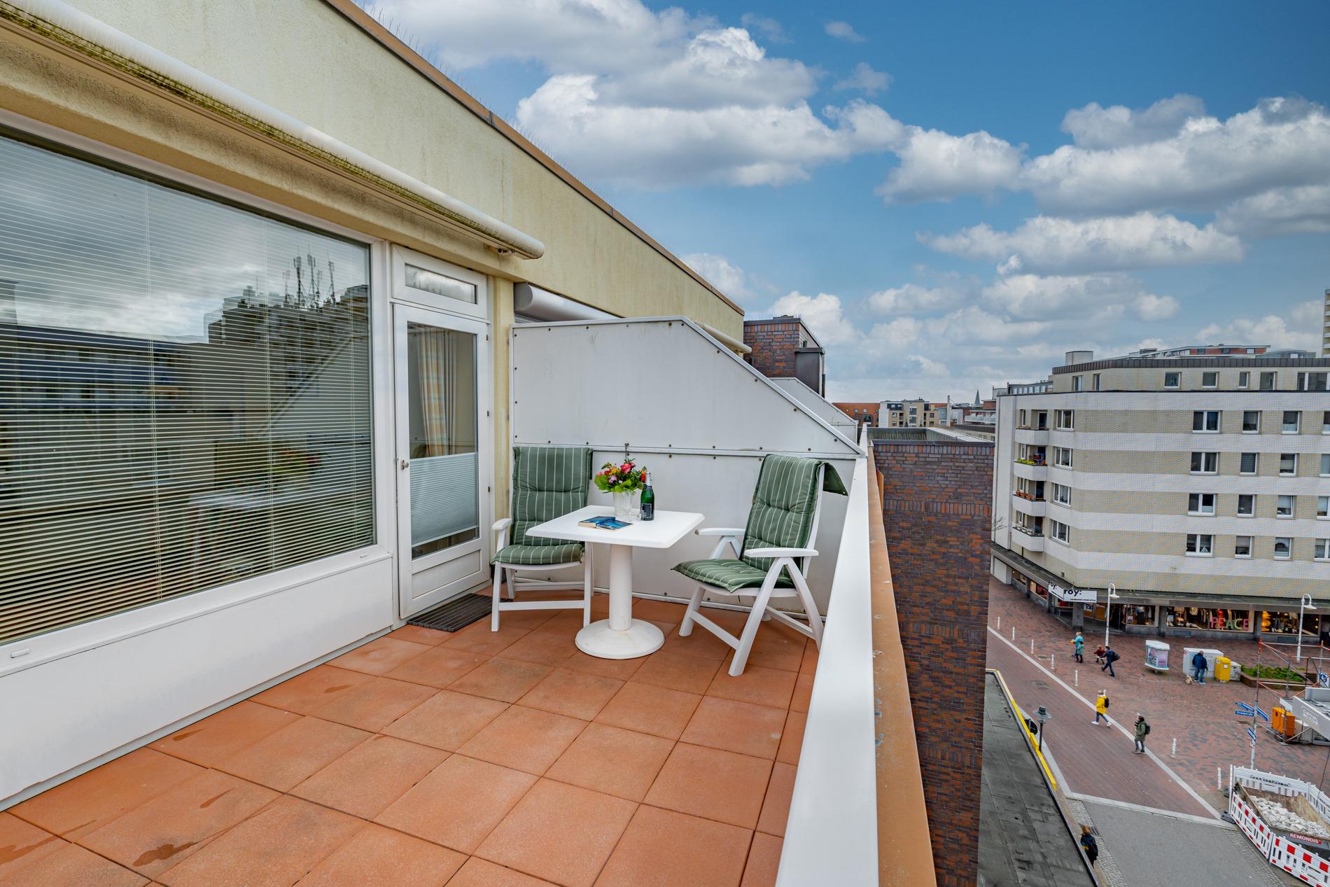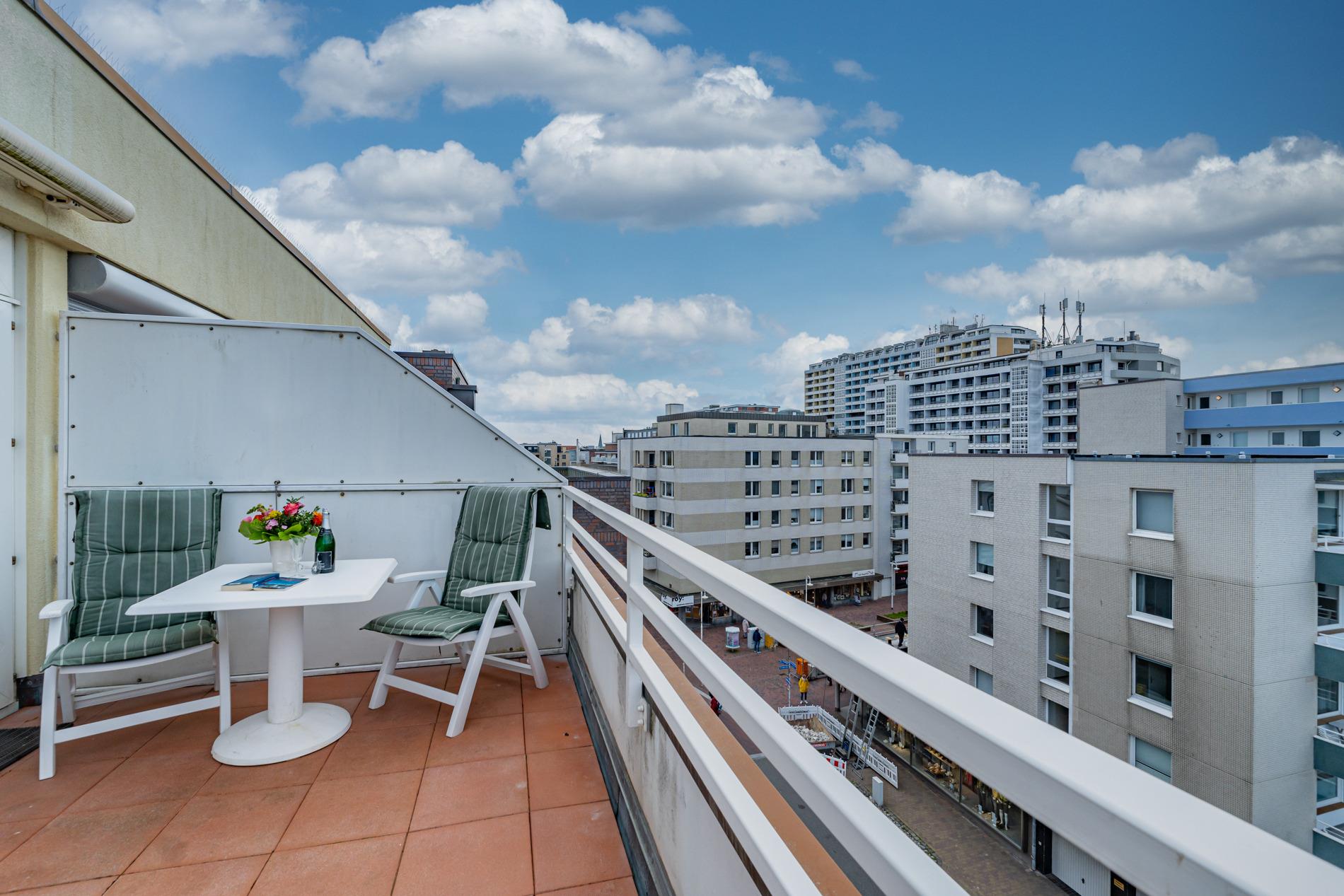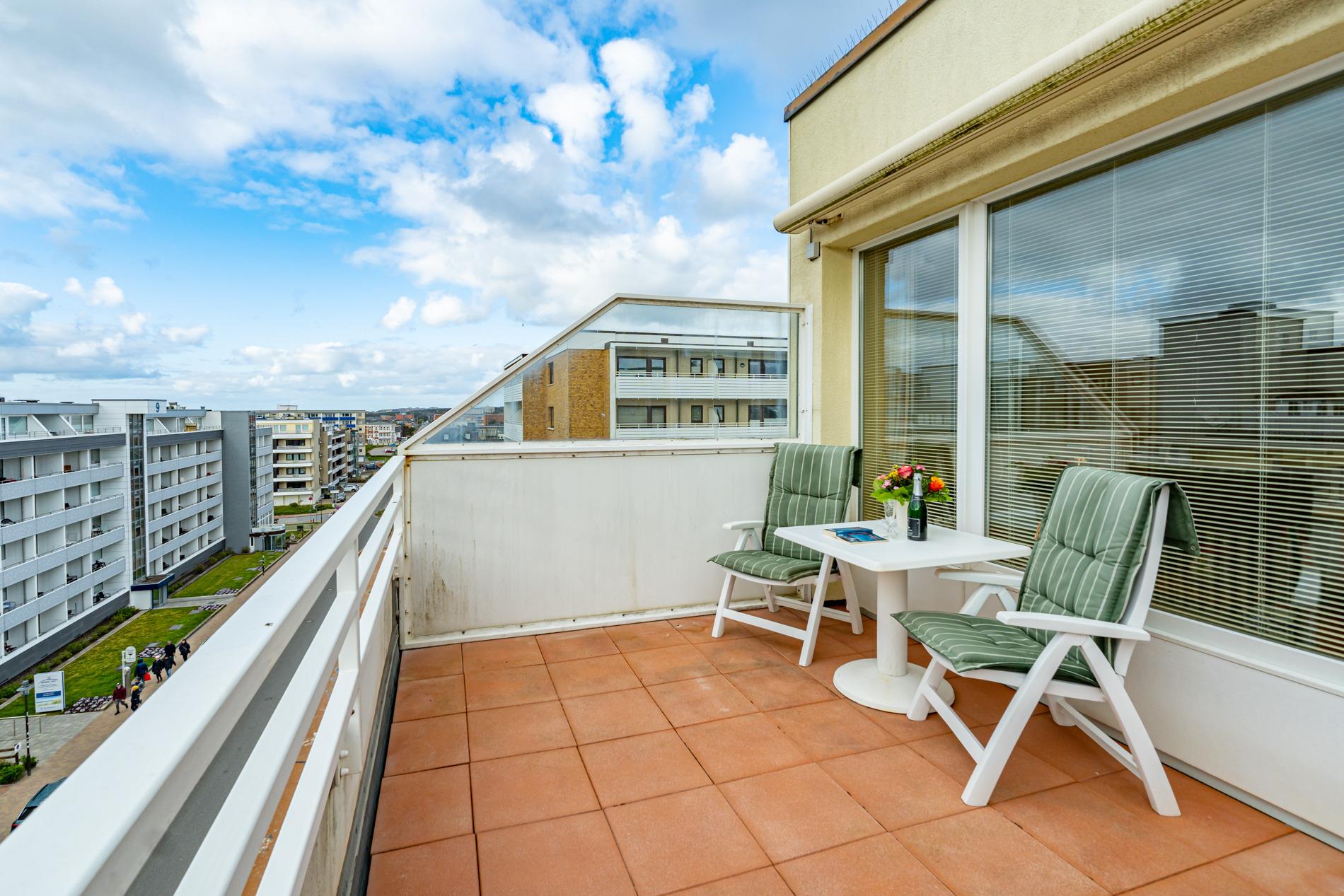 Diese helle Nichtraucher-Ferienwohnung (ca. 30?qm) befindet sich in der 5. Etage – ganz oben – und bietet einen sonnigen Westbalkon mit Ausblick, Balkonmöbeln und ausfahrbarer Markise. Ideal für 2 Personen, lädt sie zum Entspannen am Nachmittag ein.