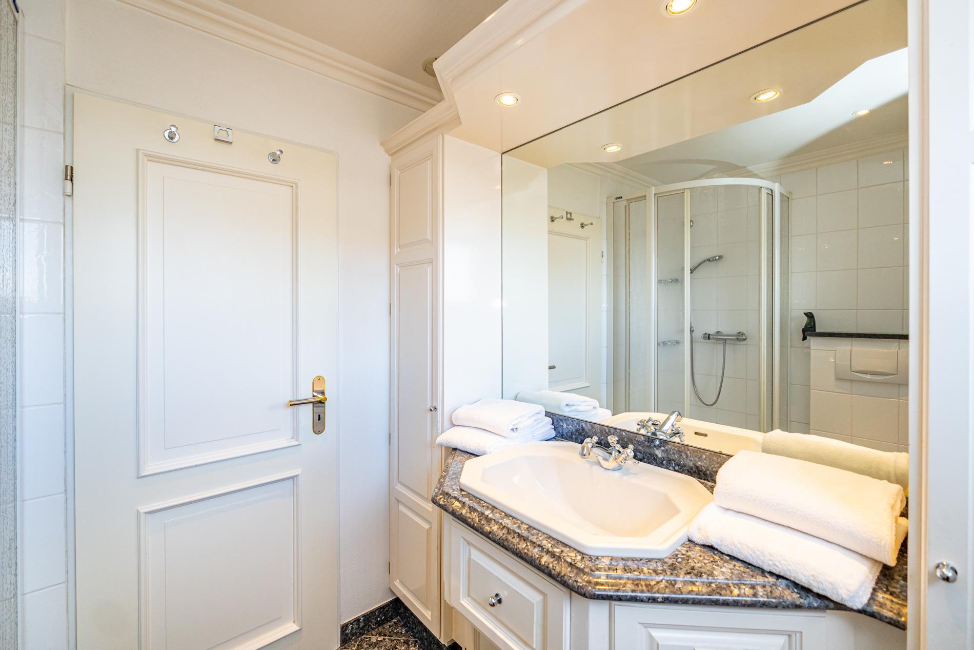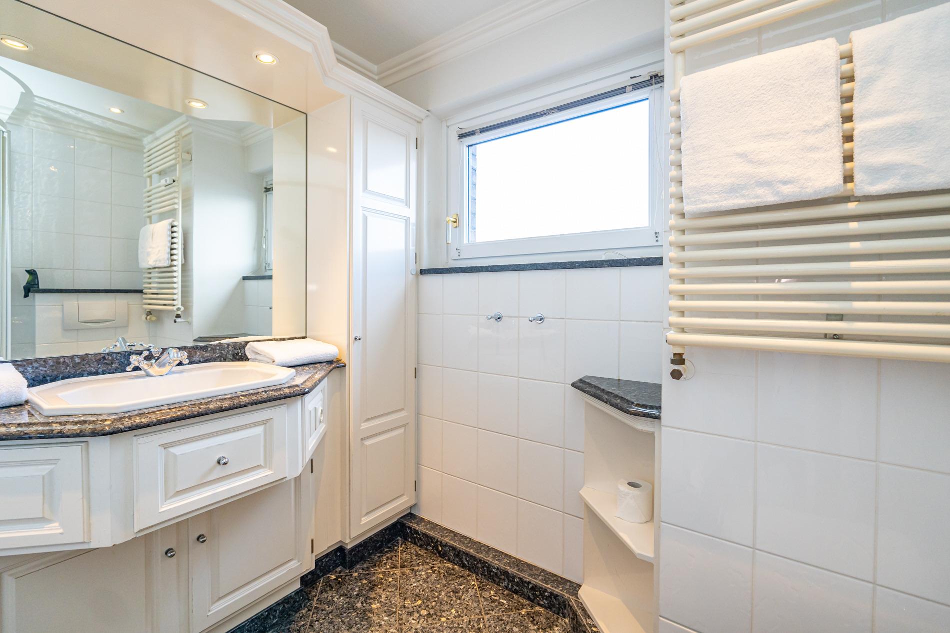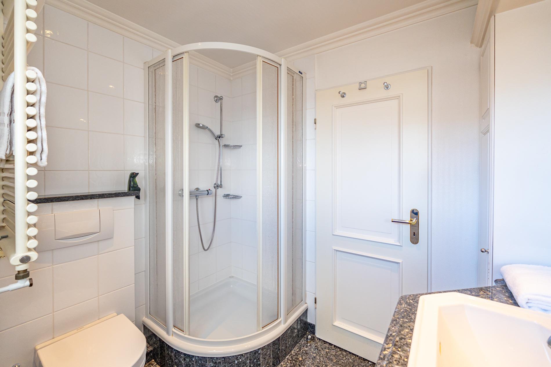 Das neuwertige Badezimmer verfügt über eine Dusche, Waschtisch, Handtuchtrockner, Fön und WC.