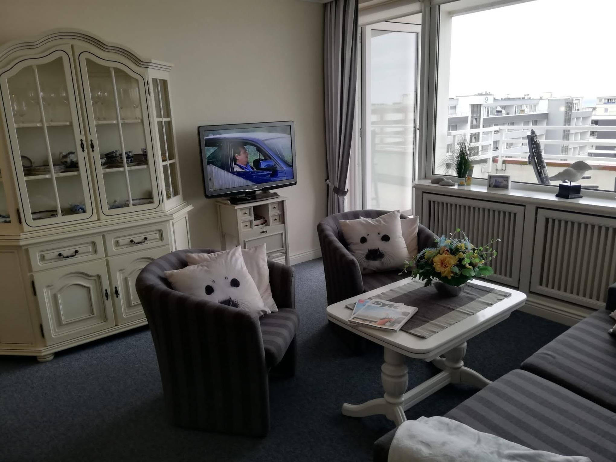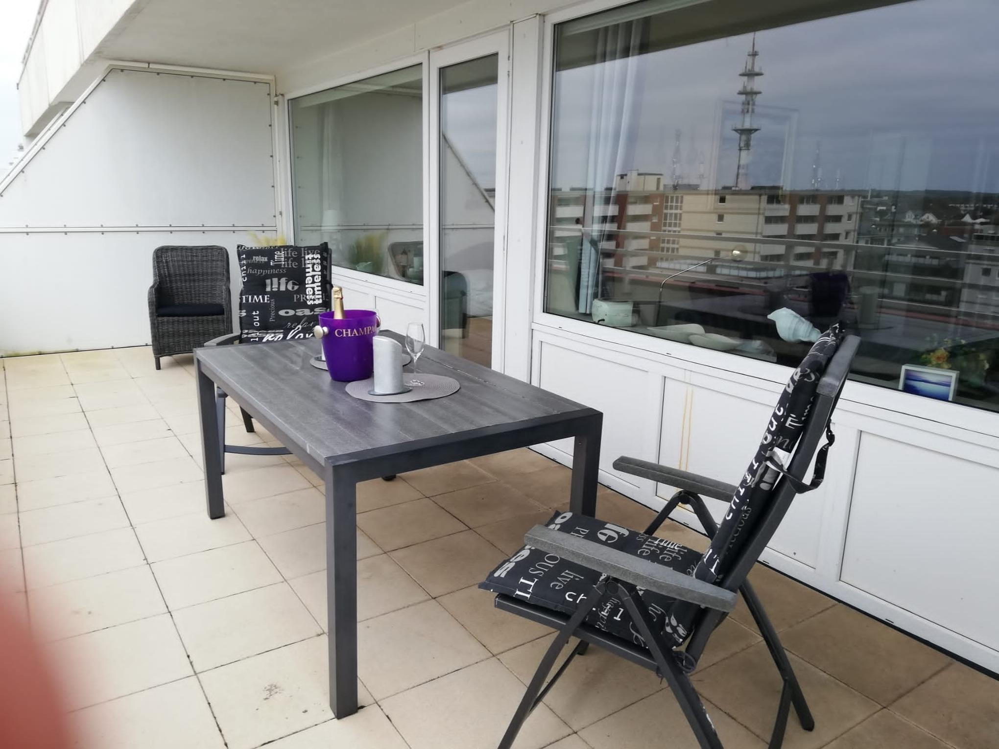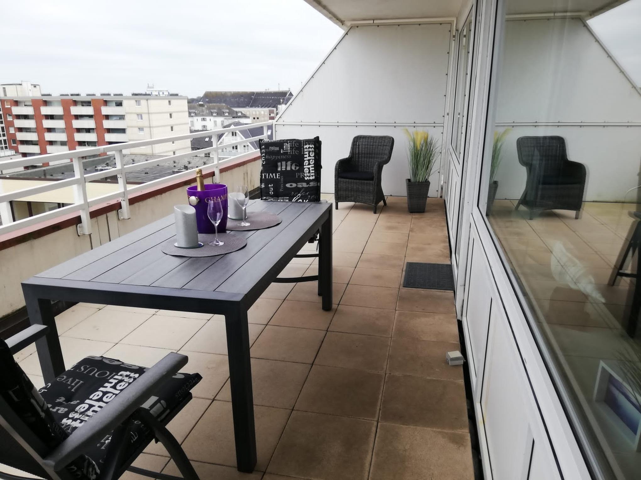 Gut ausgestattete 2-Zimmer-Nichtraucher-Ferienwohnung (ca. 58 qm) in der 5. Etage mit großem Nord-Balkon (mit Balkonmöbeln und Auflagen) mit weiter Sicht von Ost nach West inklusive eigenem Tiefgaragenstellplatz.
