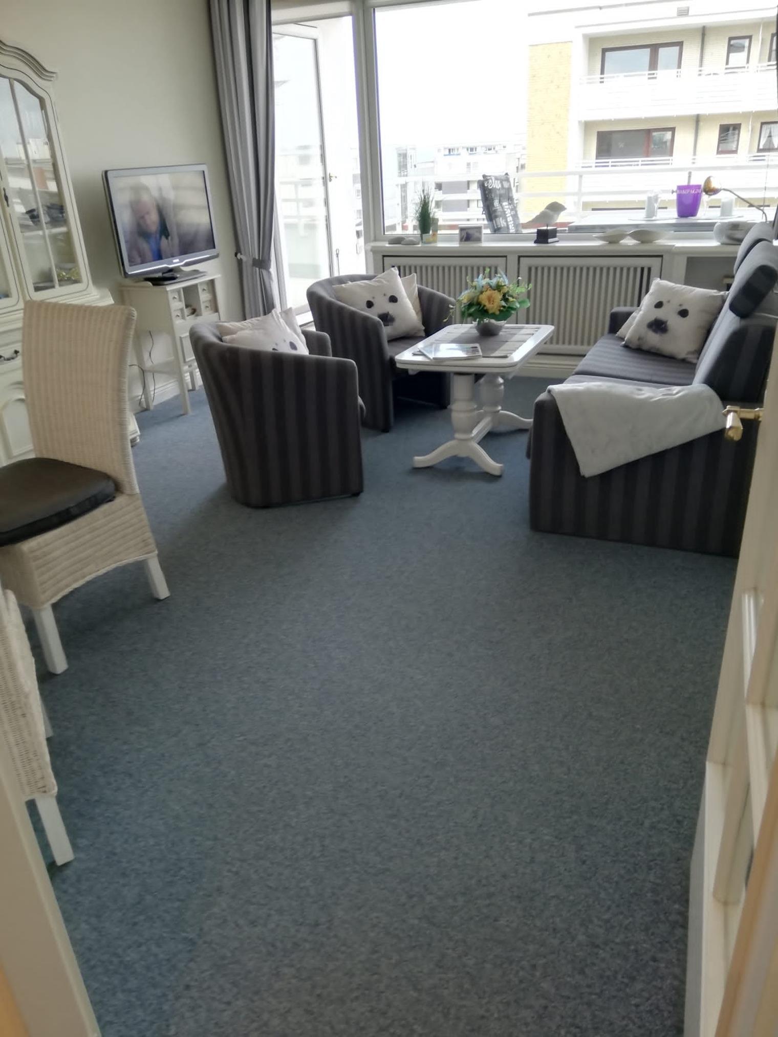 Der Wohnraum besteht aus einer hochwertigen Schlafsofa (Liegefläche 1,50 m x 1,95 und 2 Cocktail-Sesseln, separatem Essplatz, Kabel-TV (Bildschirmdiagonale ca. 94 cm), Radio und Telefon.