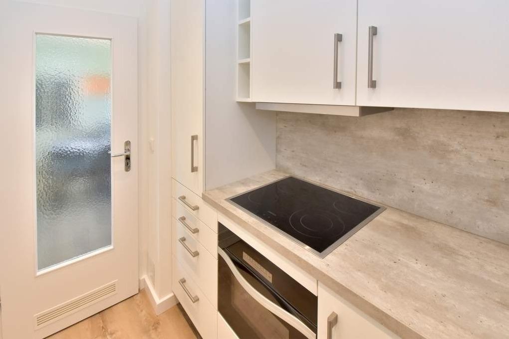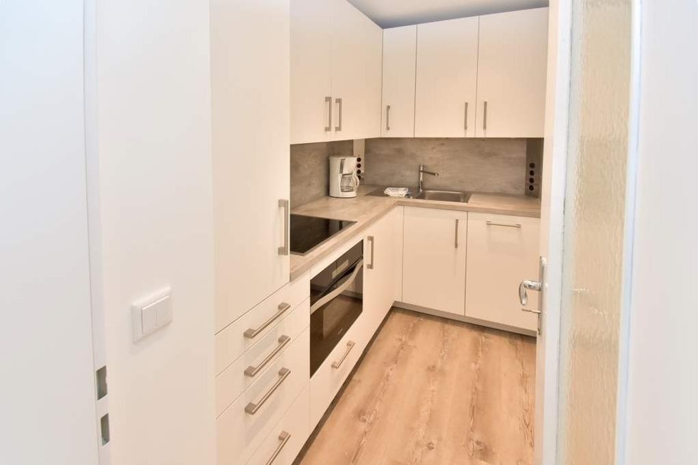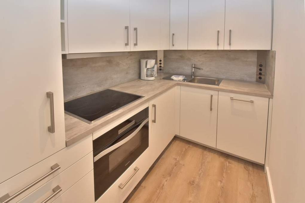 Vom Wohnraum gelangt man in die neue, separate Küche mit Geschirrspüler, Backofen, Ceranfeld (4 Kochfelder) und Kühlschrank mit 3-Sterne-Gefrierfach. Kaffeemaschine, Wasserkocher und Toaster gehören zur Grundausstattung.