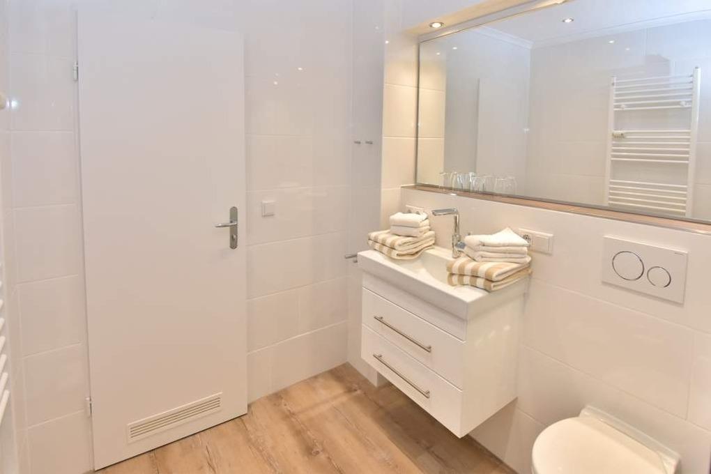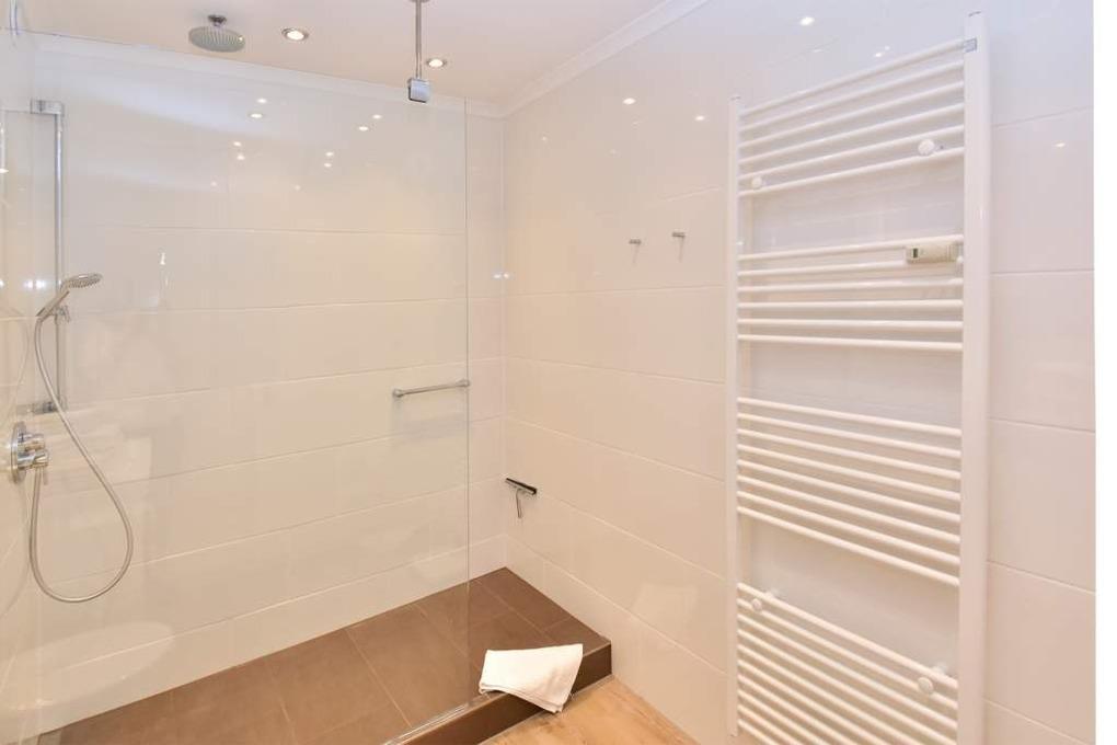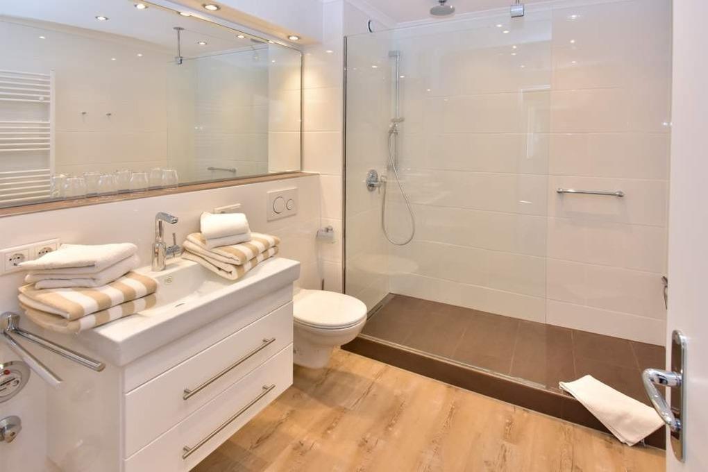 Im neuen Badezimmer befindet sich eine extragroße Dusche mit flachem Einstieg, ein Waschtisch, Handtuchtrockner und das WC.