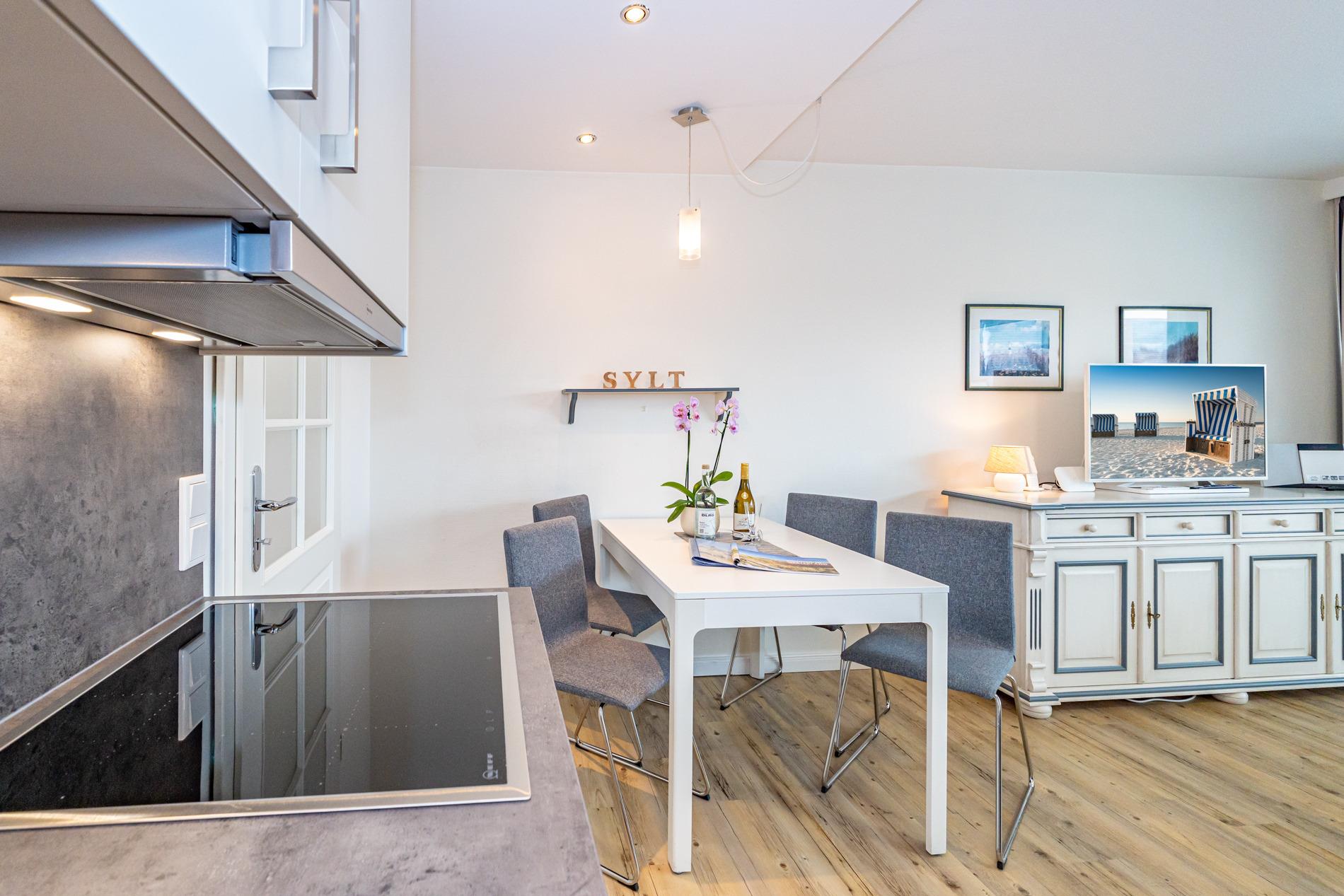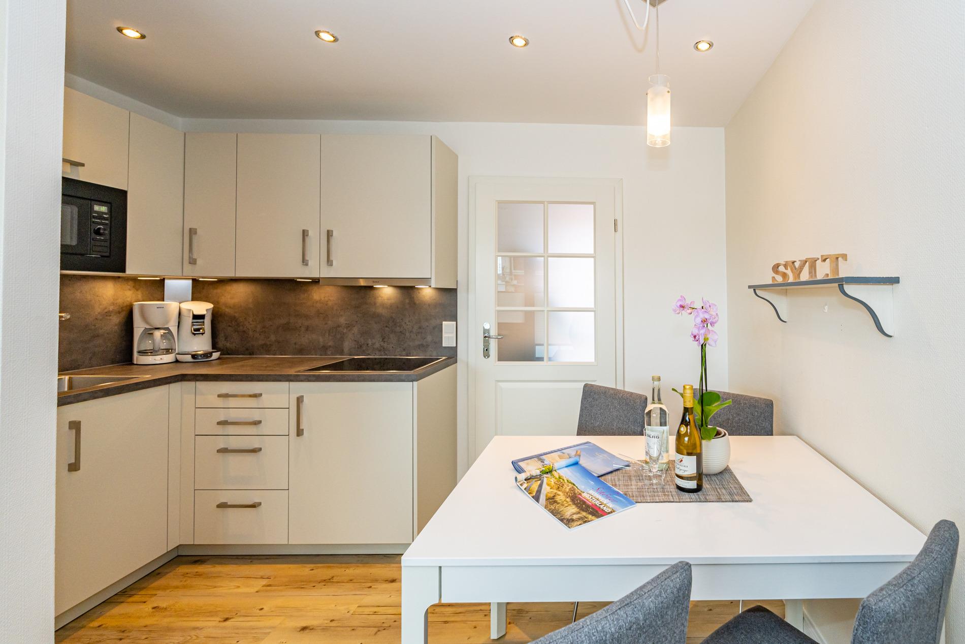 Die neue Küchenzeile verfügt über ein modernes Ceranfeld, Mikrowelle und einen Geschirrspüler, eine Kaffeemaschine, einen Wasserkocher und einen Toaster – ideal für ein gemütliches Frühstück oder eine Tasse Tee zwischendurch.