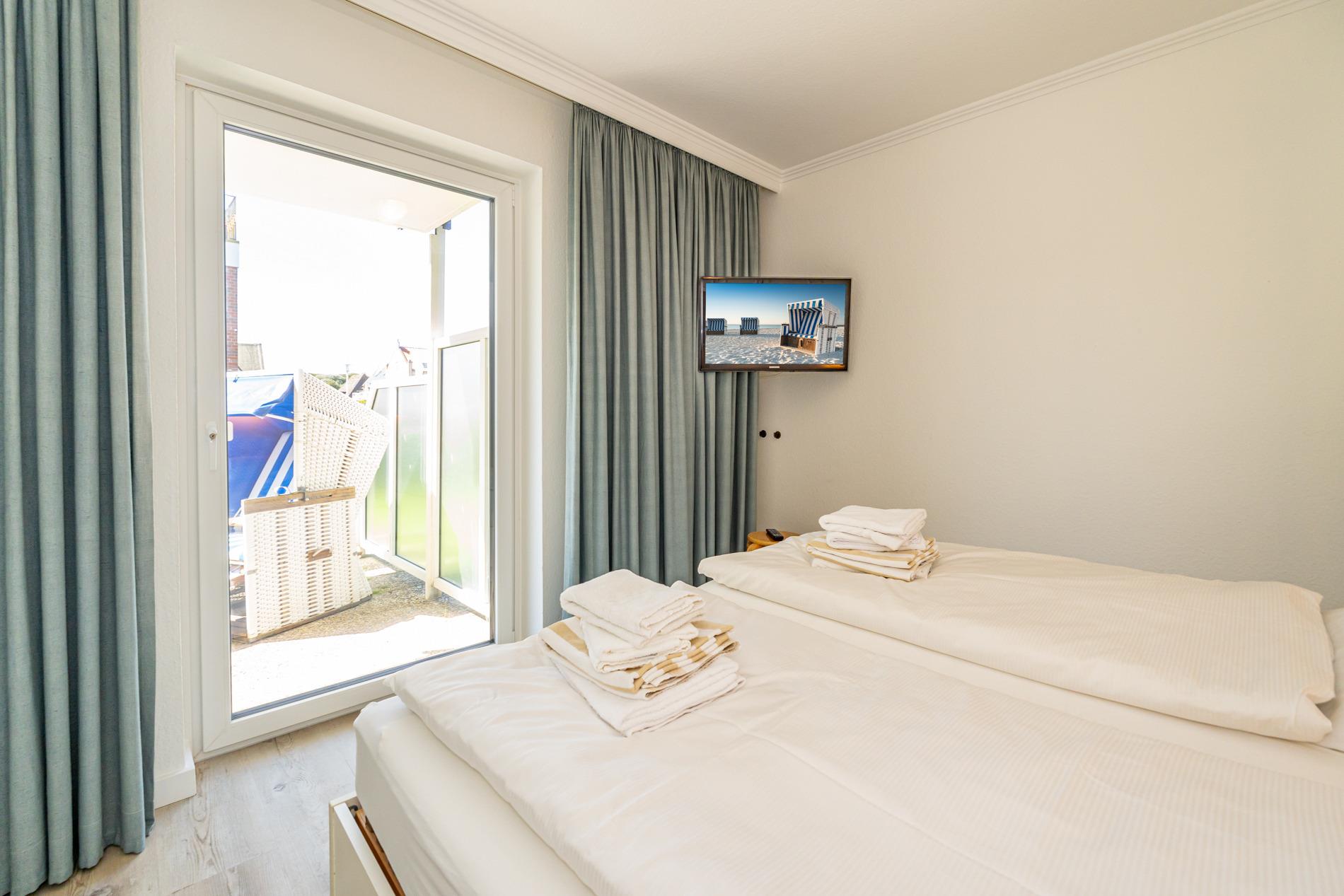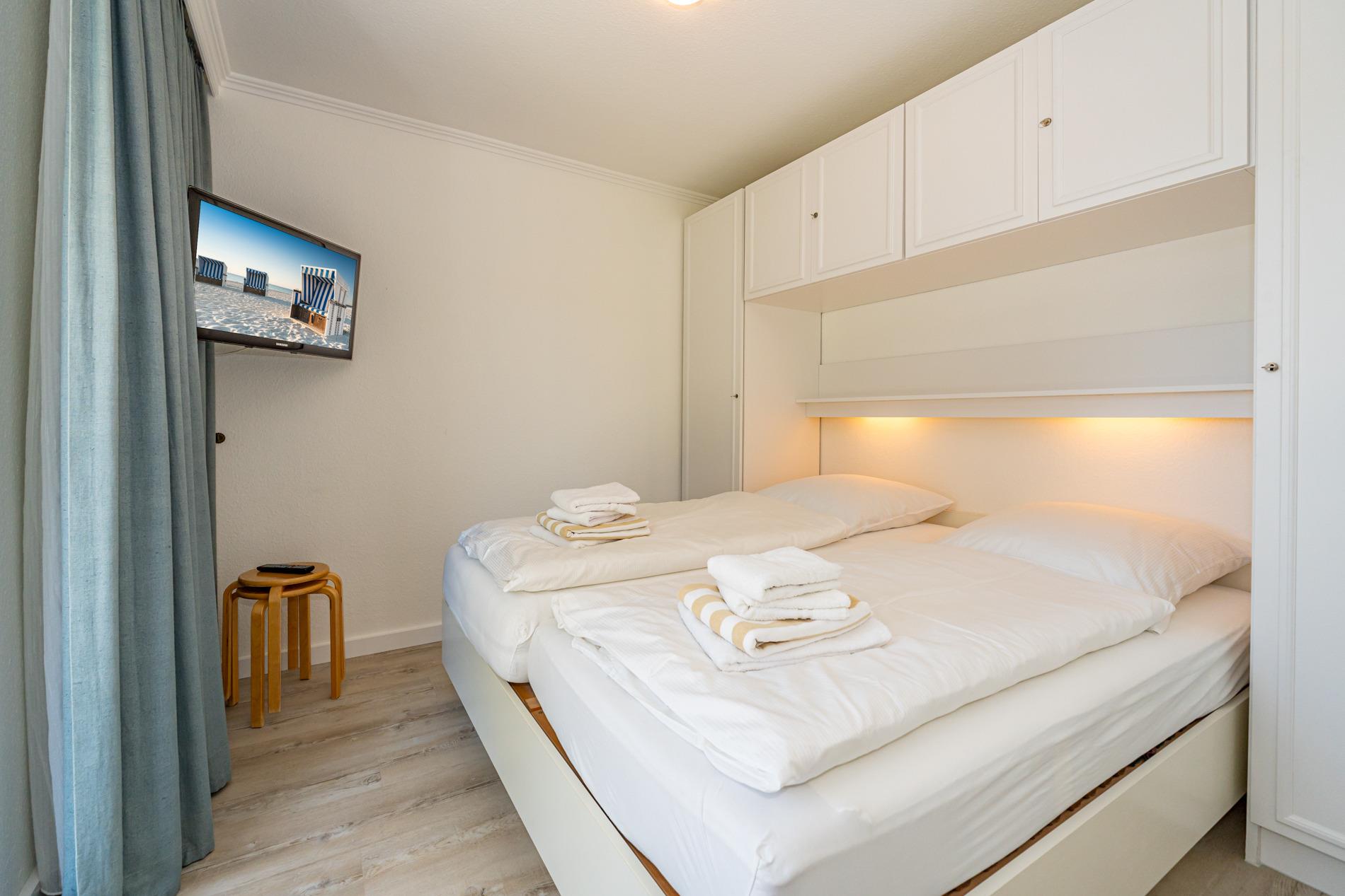 Vom Wohnzimmer aus gelangt man in das Schlafzimmer, das über ein komfortables Doppelbett mit guten Einzelmatratzen und einen weiteren Flachbild-TV verfügt.