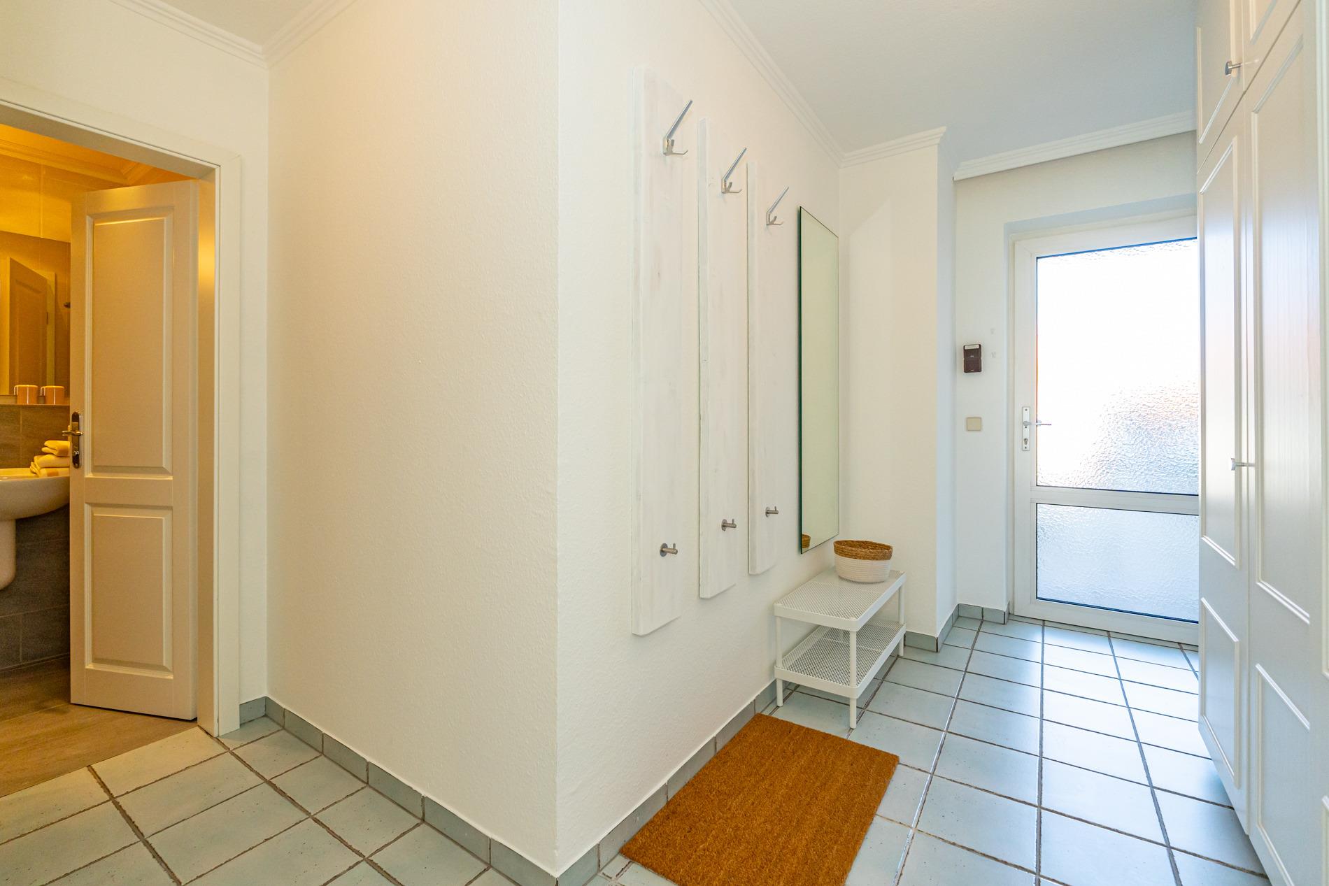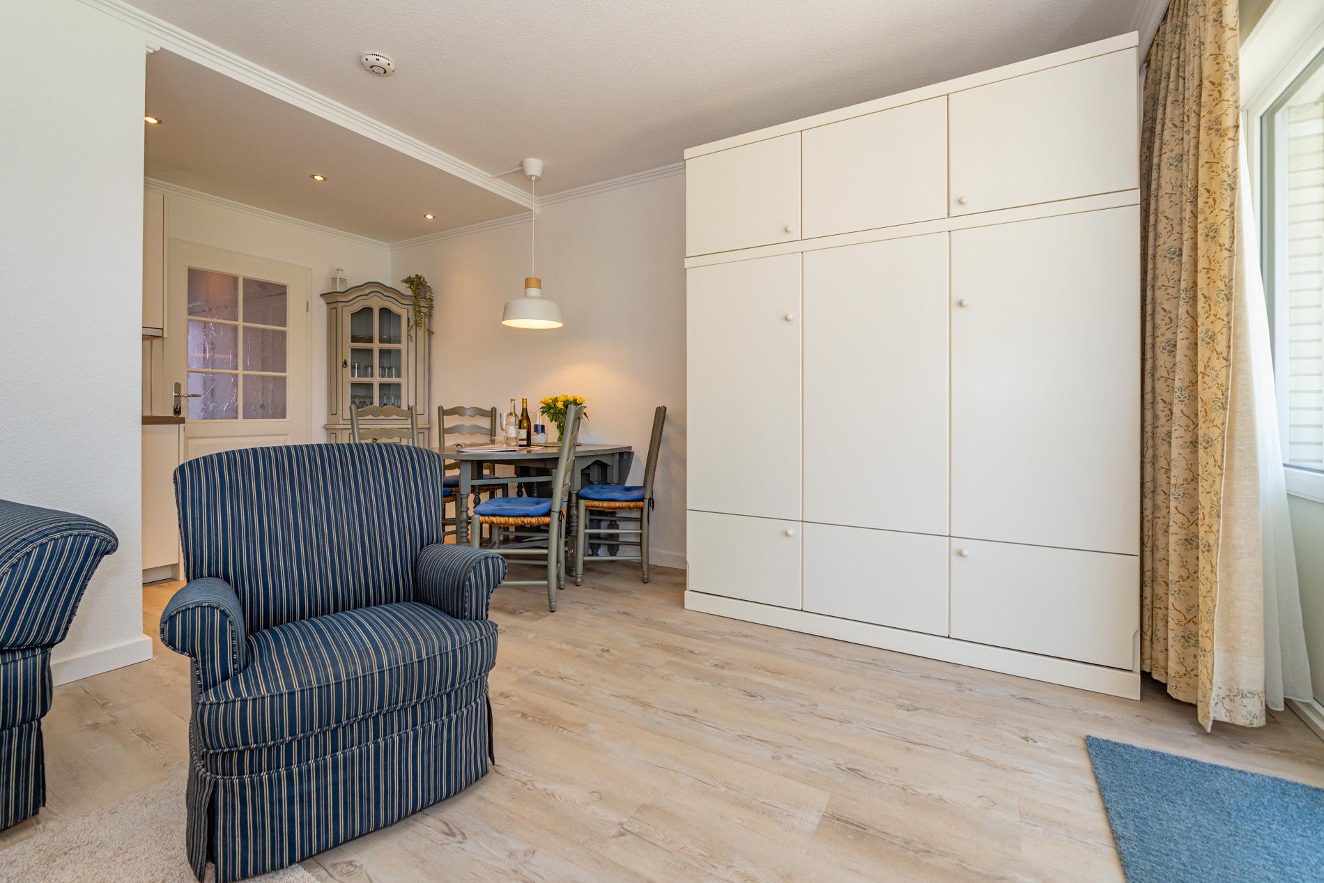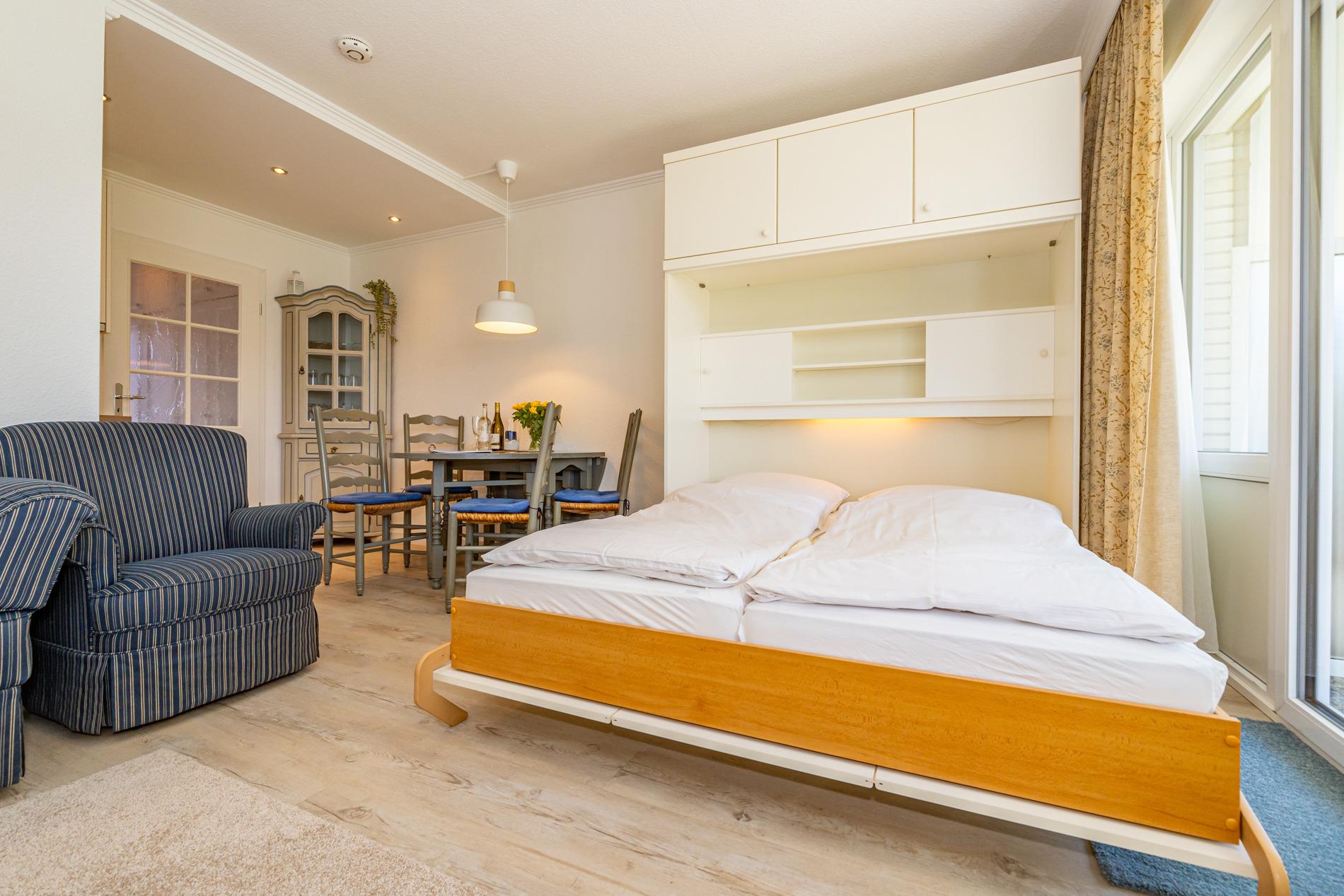 Die Wohnung verfügt über ein Wohnzimmer mit Zugang zur Terrasse, einen Vorflur mit Garderobe und offener Einbauküche und ein Badezimmer. Das Wohnzimmer ist mit einer Couch, zwei Sesseln, einem Essplatz, einem Doppelschrankbett und einem Kabel-Flachbild-TV eingerichtet.