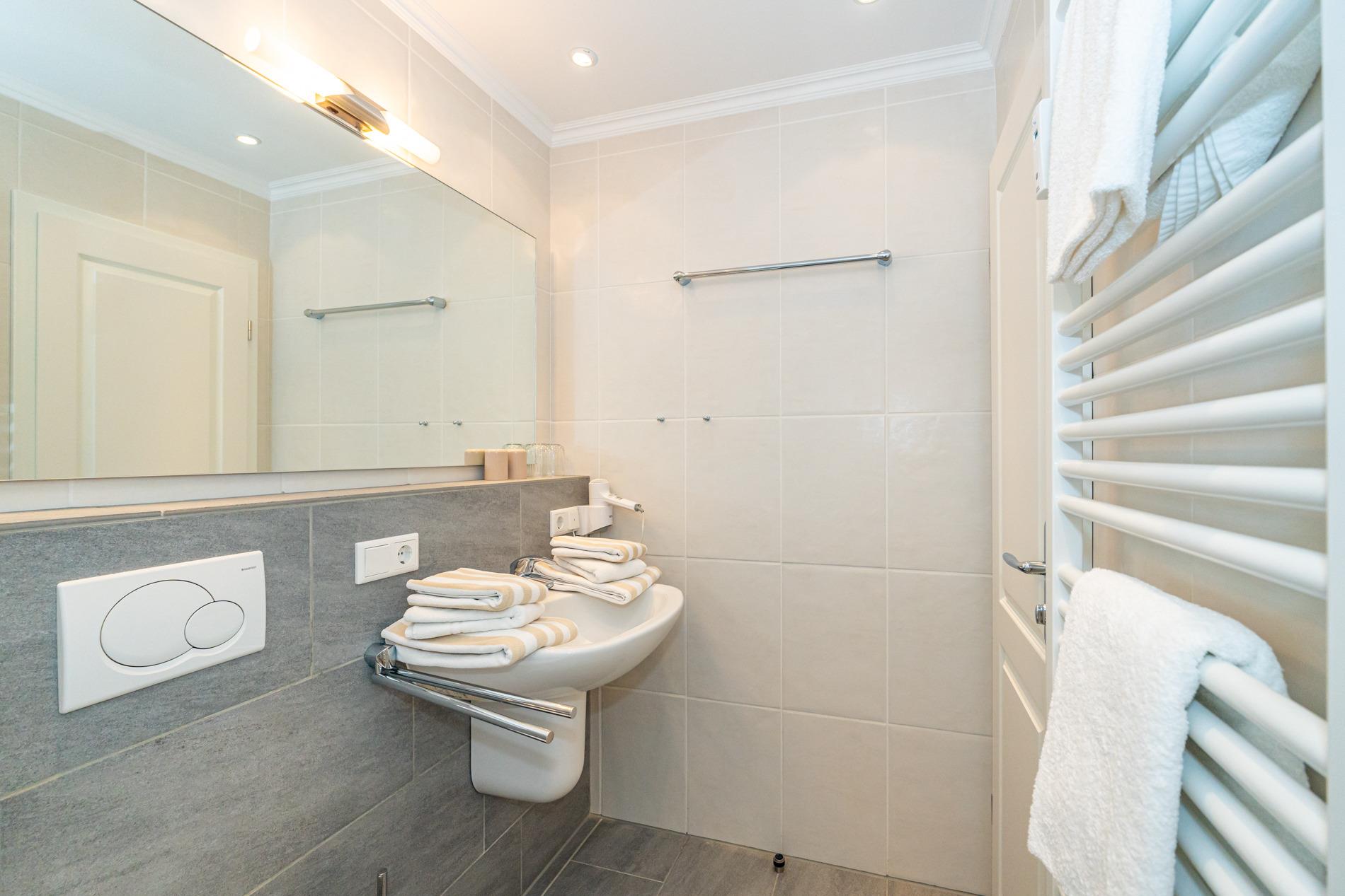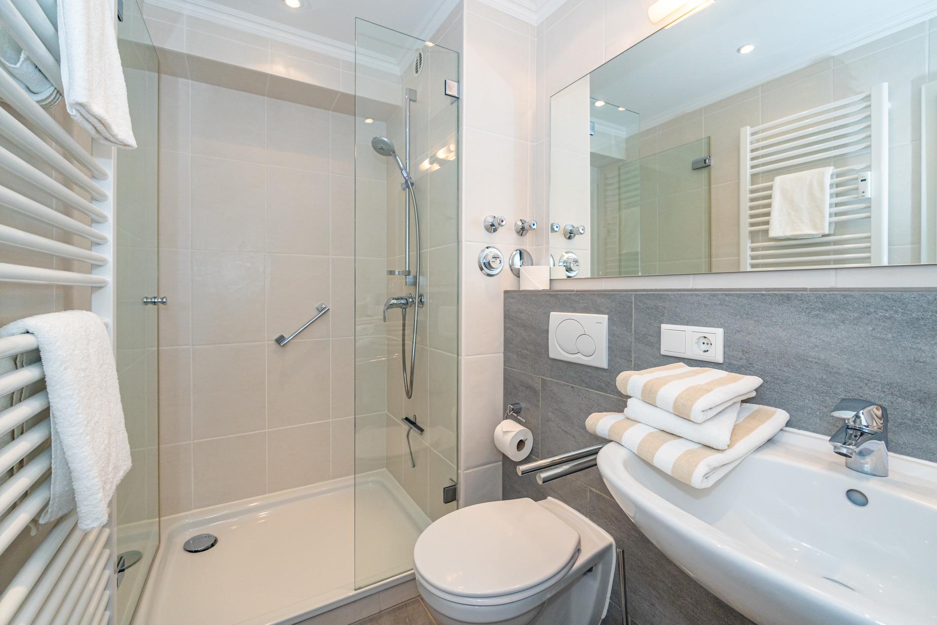 Das neuwertige Badezimmer ist mit einem Waschtisch, einer Dusche (extraflacher Einstieg), einem Handtuchtrockner und WC ausgestattet.