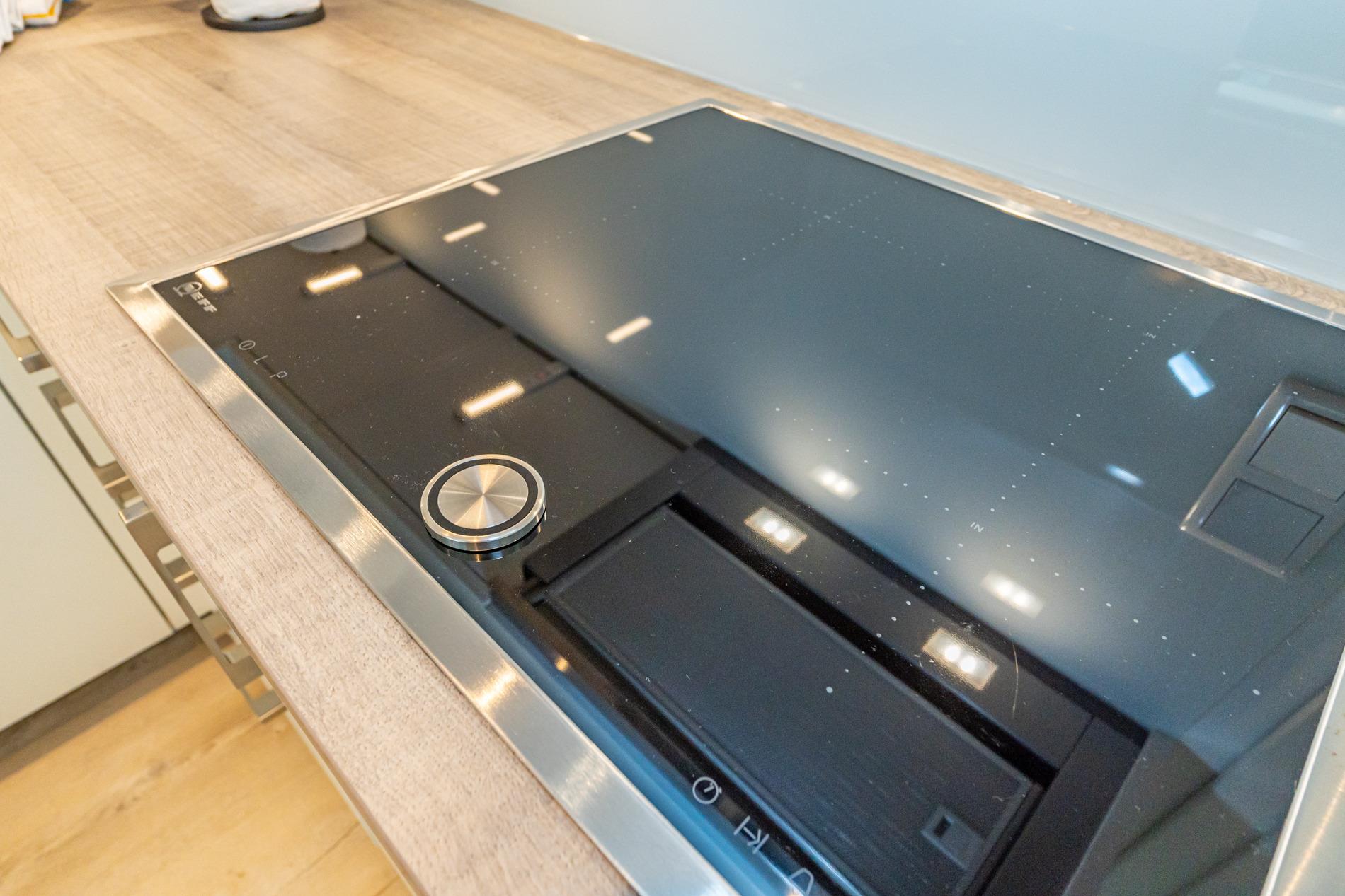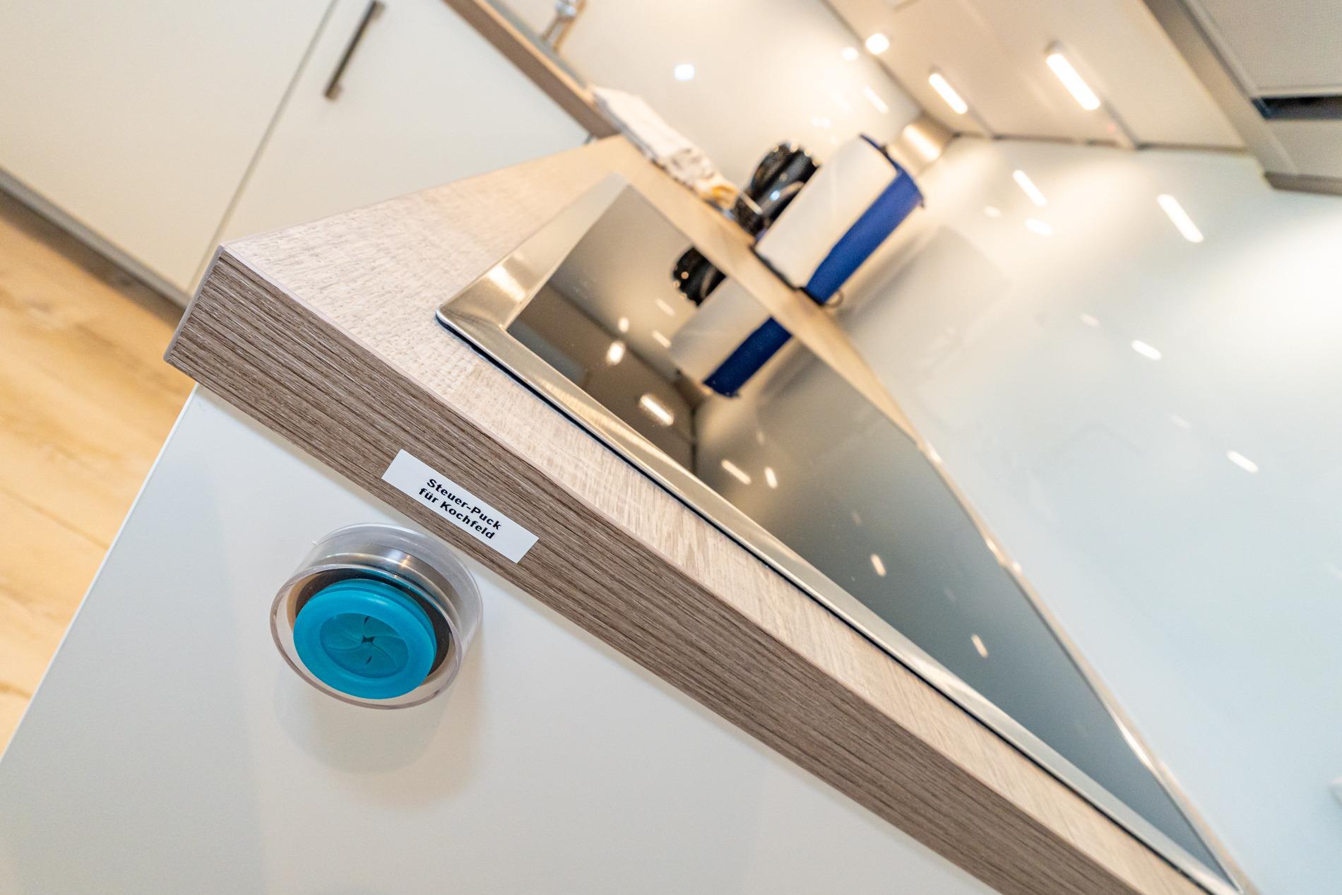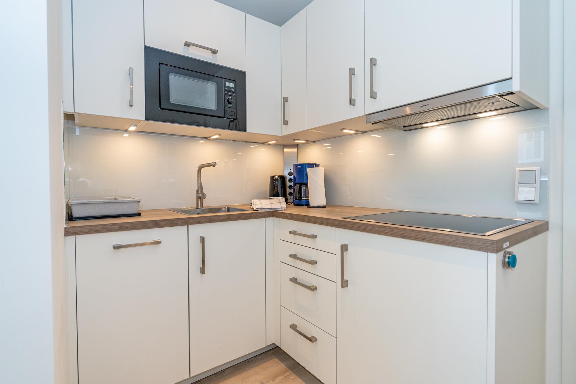 Die neue Einbauküche besitzt einen Geschirrspüler, eine Mikrowelle, ein Ceranfeld mit 4 Kochfeldern und einem Kühlschrank mit 3-Sterne-Gefrierfach. Zur Grundausstattung gehören außerdem eine Kaffeemaschine, ein Wasserkocher und ein Toaster.