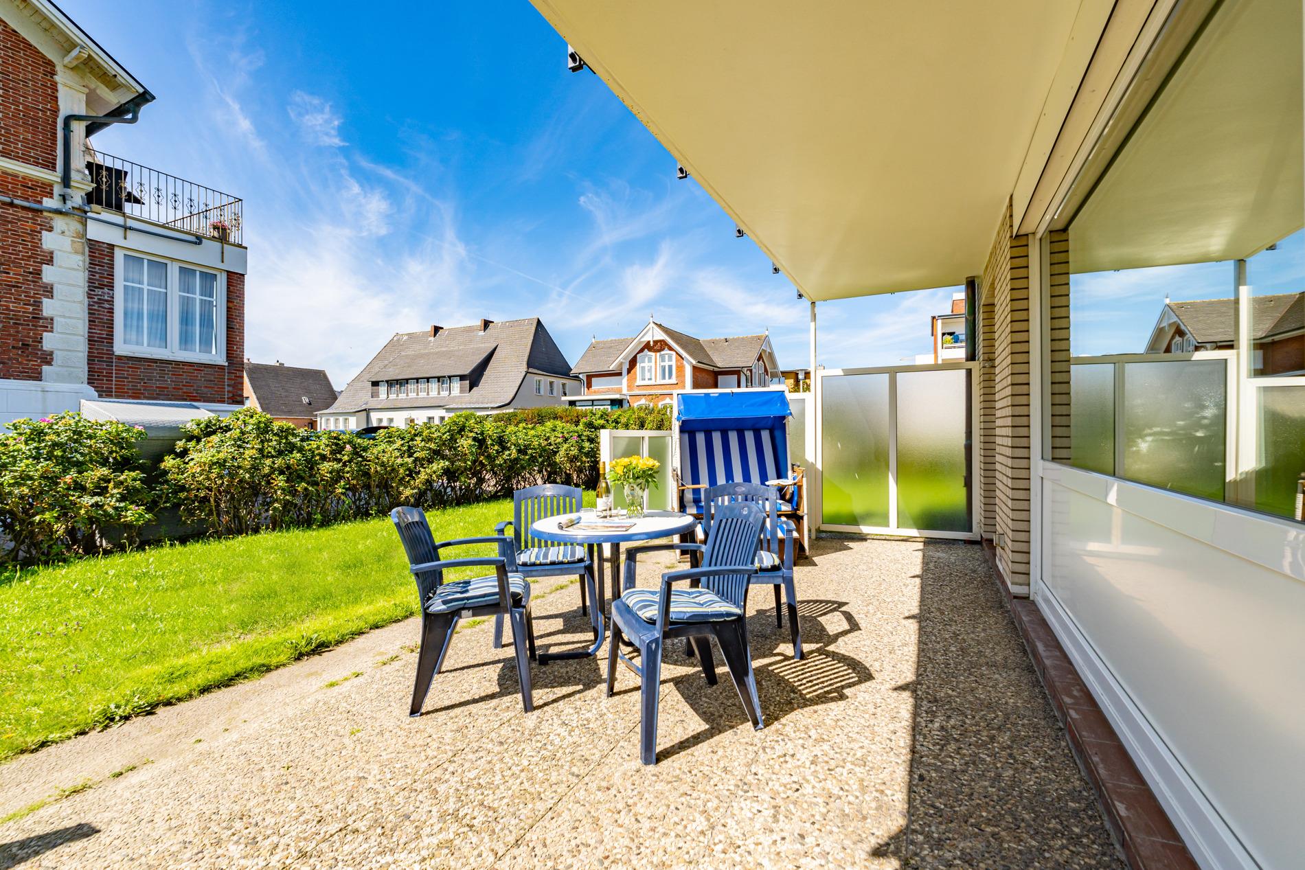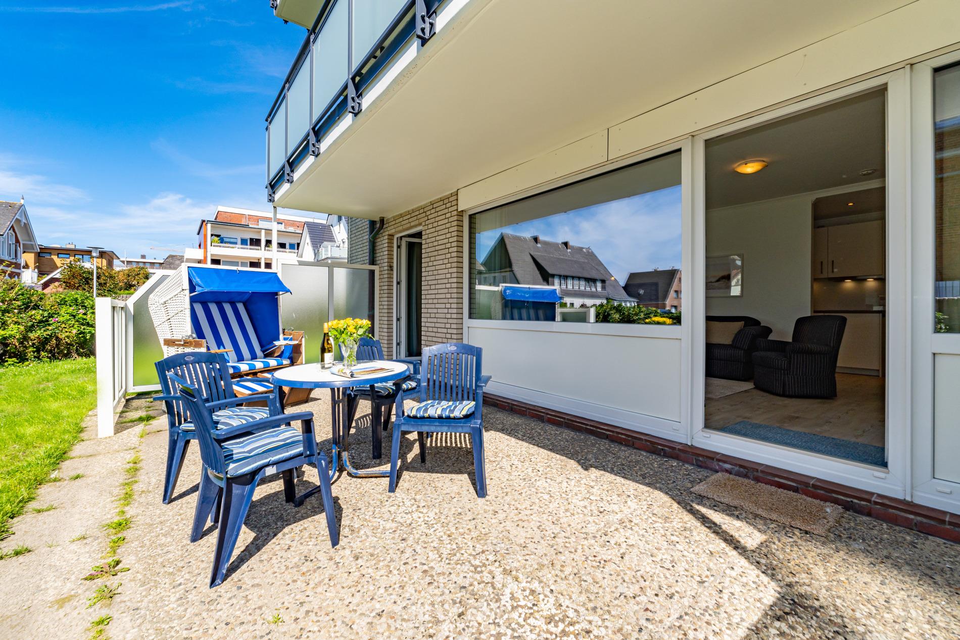 Die angebotene 2-Zimmer-Ferienwohnung (Nichtraucher) mit großzügiger Terrasse und PKW-Stellplatz in der Tiefgarage zeichnet sich durch ihre komfortable Ausstattung aus. Mit einer Größe von ca. 46 qm bietet sie Platz für bis zu 4 Personen und befindet sich im Erdgeschoss. Besonders ansprechend ist die großzügige Westterrasse, die mit Balkonmöbeln, Strandkorb und Auflagen ausgestattet ist.