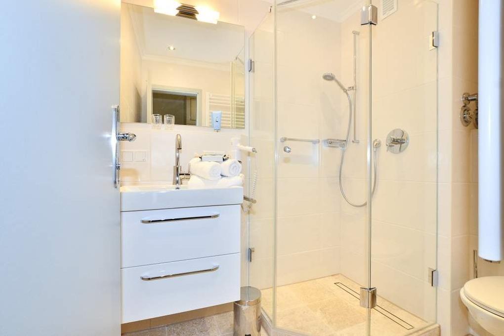 Das neue helle Duschbad/WC hat eine Dusche mit extra flachem Einstieg, Echt-Glas-Duschtür, Waschtisch, Handtuchtrockner und Fön.
