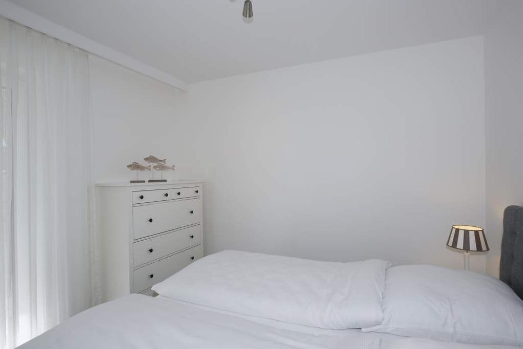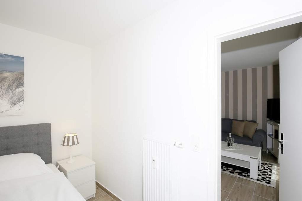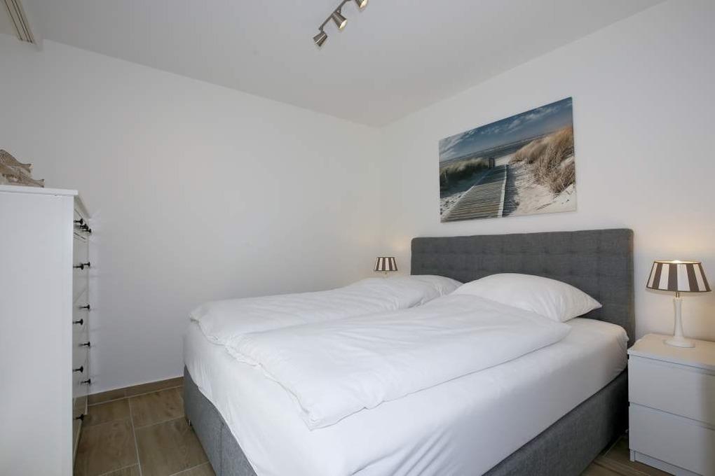Das vom Wohnzimmer aus begehbare Schlafzimmer hat ein besonders komfortables Boxspringbett mit durchgehender Matratze und extrahohem Kopfteil.