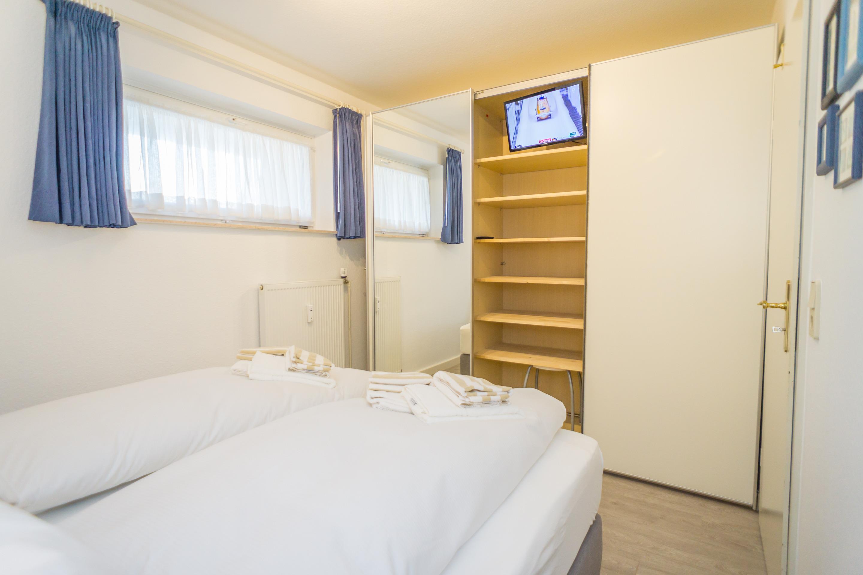 Das Schlafzimmer ist mit einem guten Doppelpolsterbett (0,90 x 2,00 m, 2 Einzelmatratzen) ausgestattet.