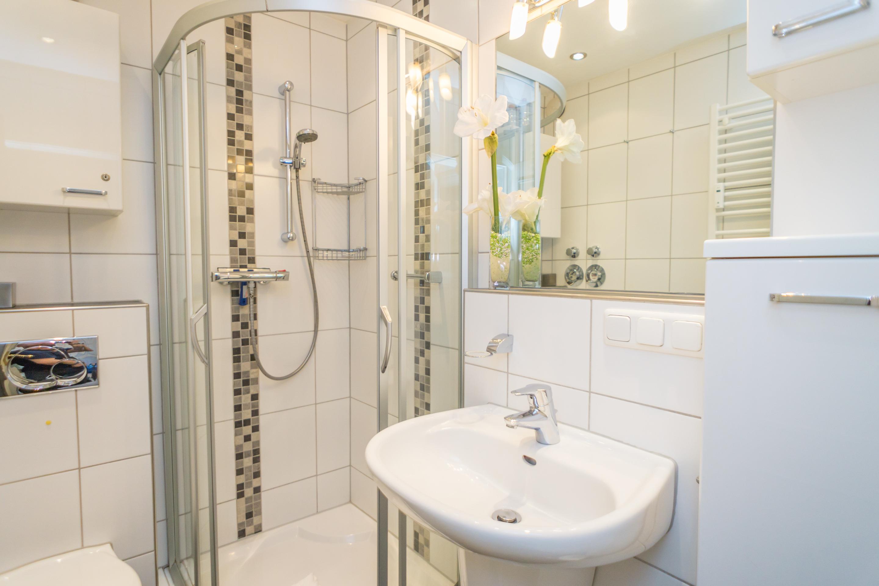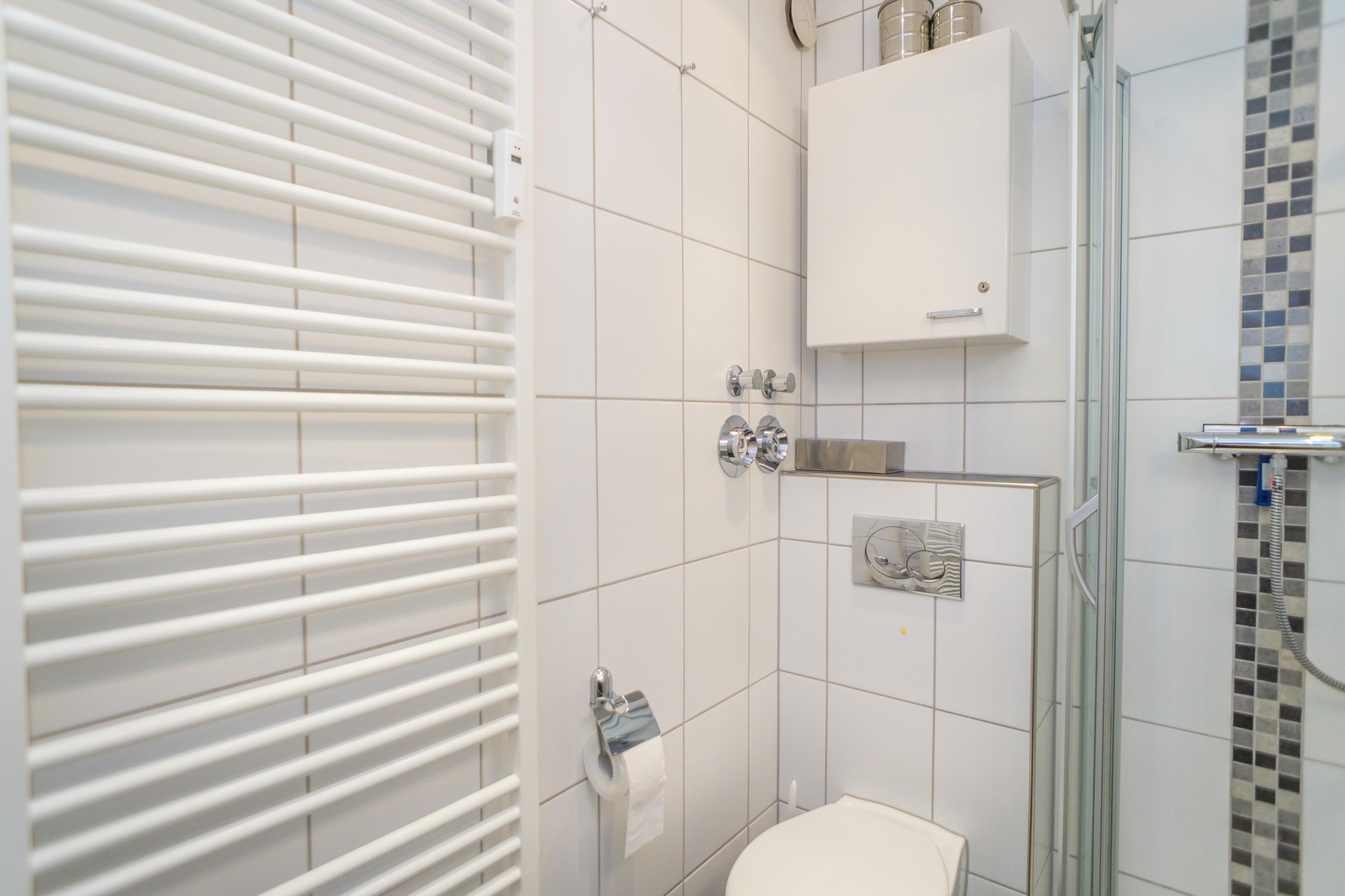 Das neue Duschbad/WC hat einen Waschtisch, Handtuchtrockner und Fön.