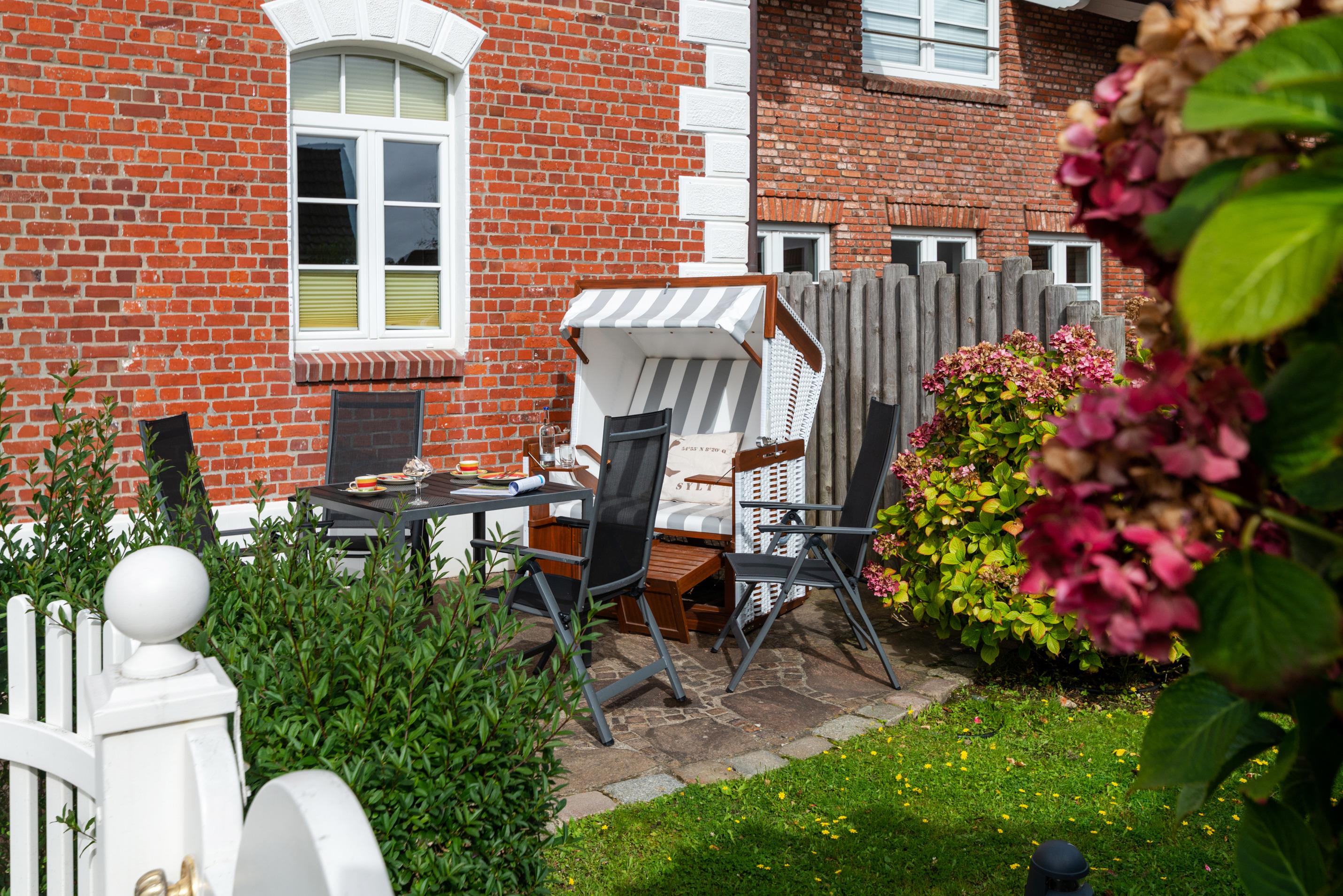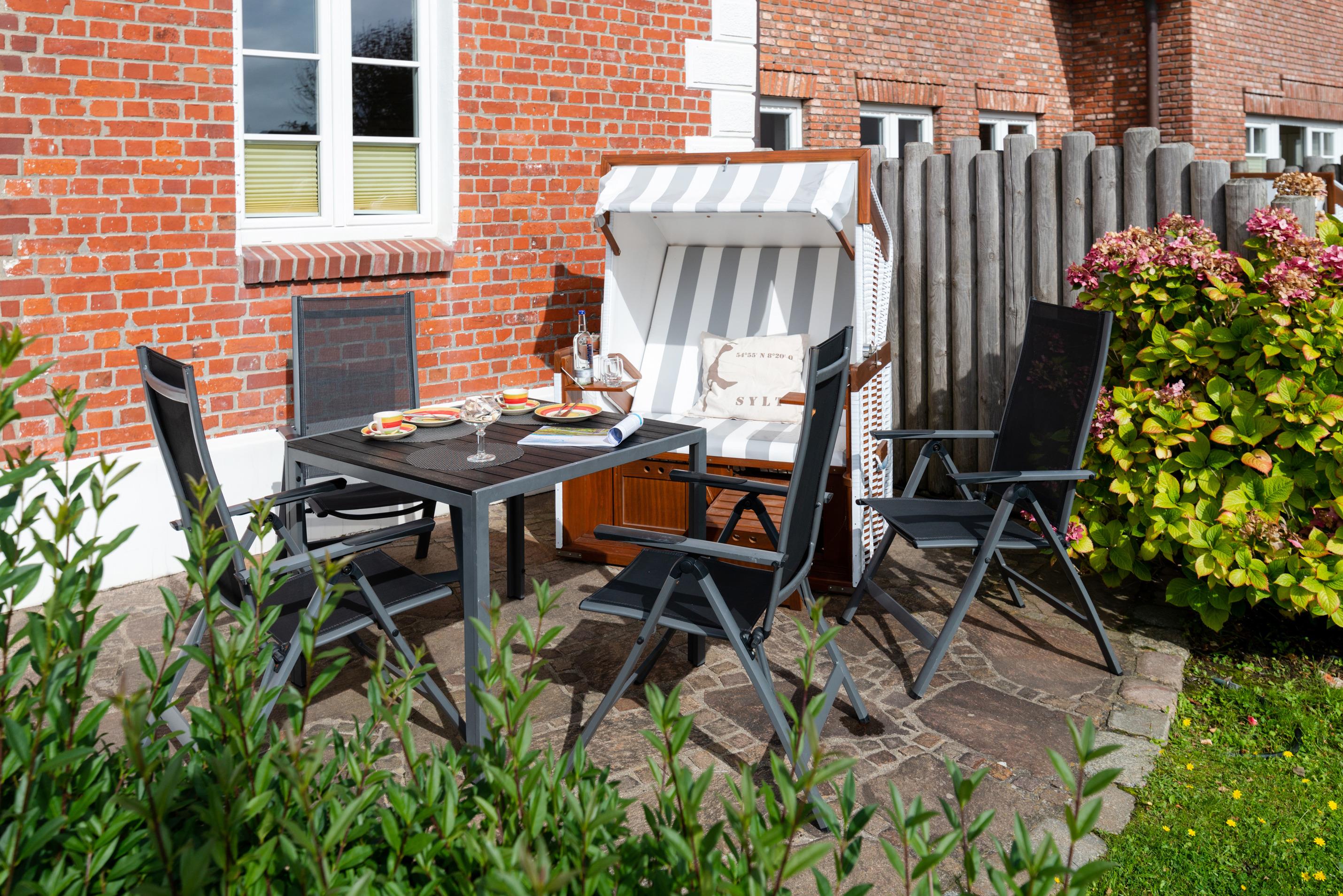 Die nach Süden ausgerichtete Sonnenterrasse bietet einen Saison-Strandkorb (ca. vom 01. April bis 15. Oktober) und Gartenmöbel mit Auflagen. Die Terrasse ist ausschließlich über den Hauseingang erreichbar.