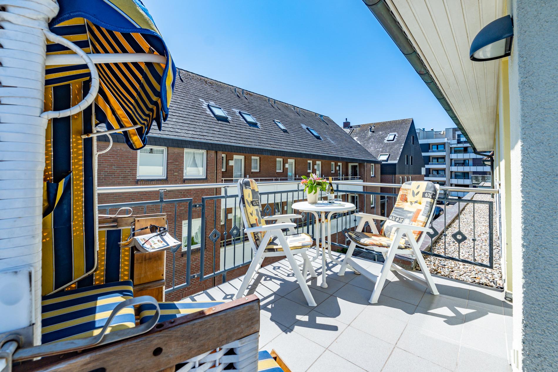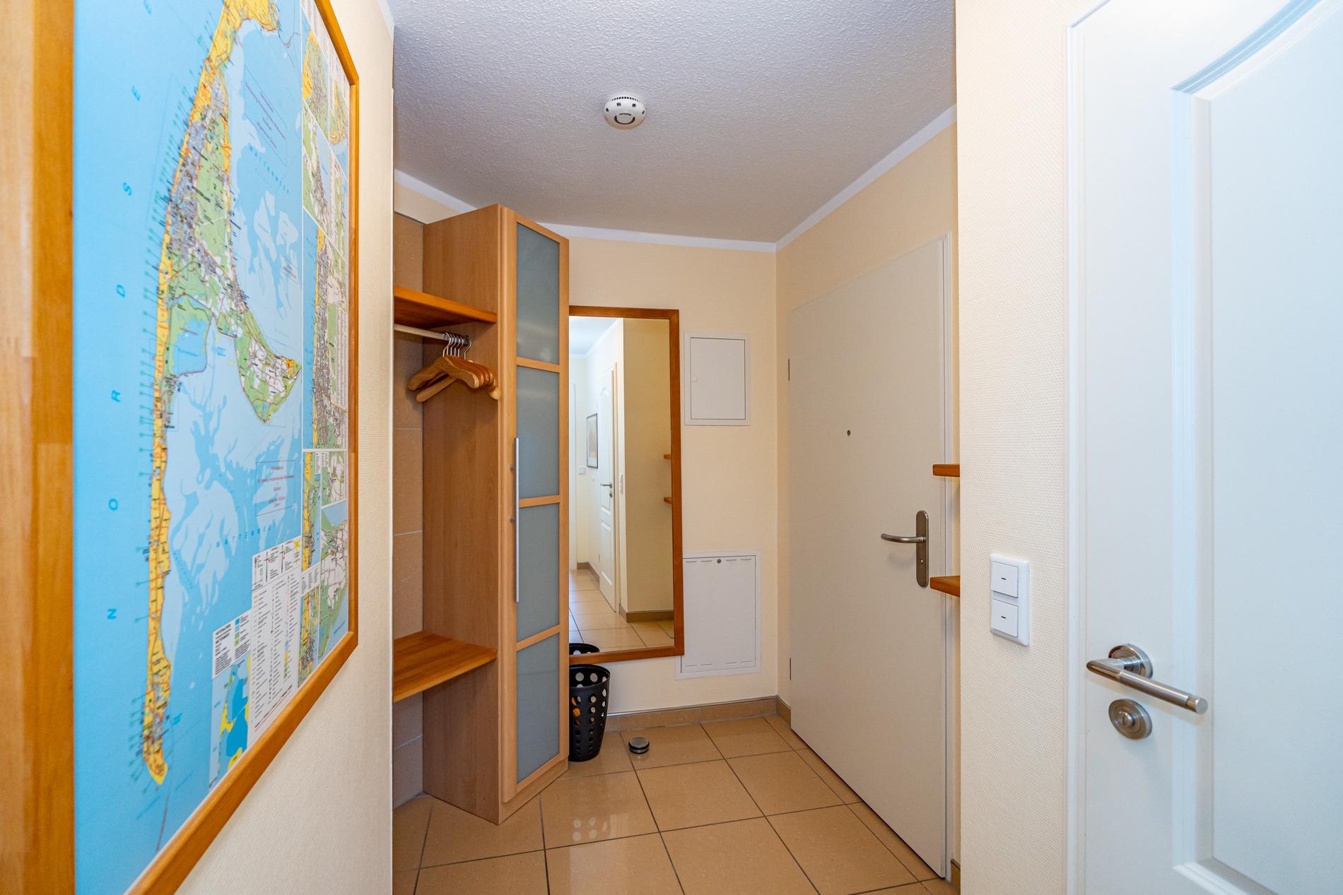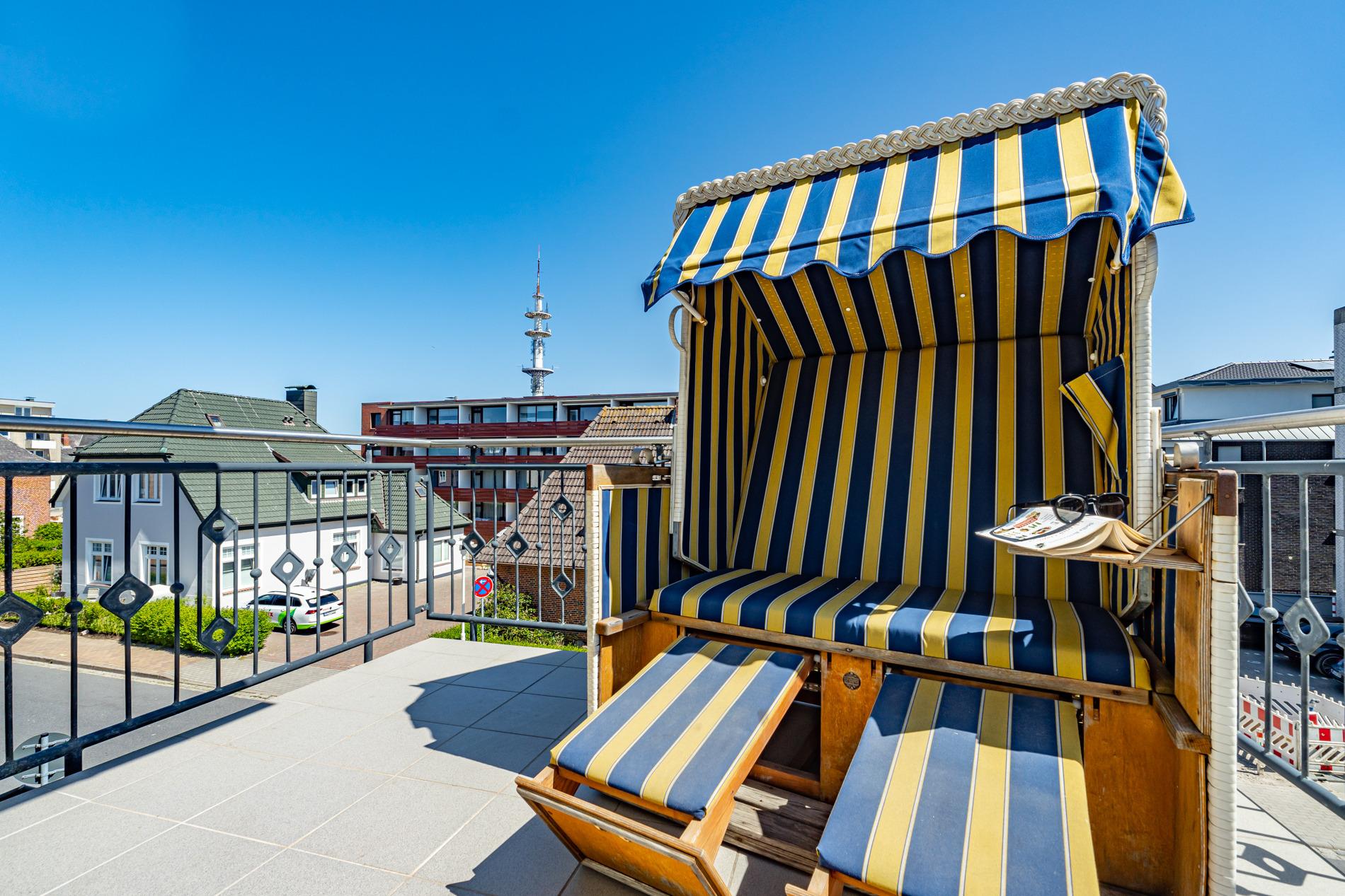 Vom Vorflur mit Garderobe gelangt man in das schicke Wohnzimmer (mit Austritt zum Balkon, mit Strandkorb, Balkonmöbeln und Auflagen), in das geräumige Duschbad/WC und in das Schlafzimmer.