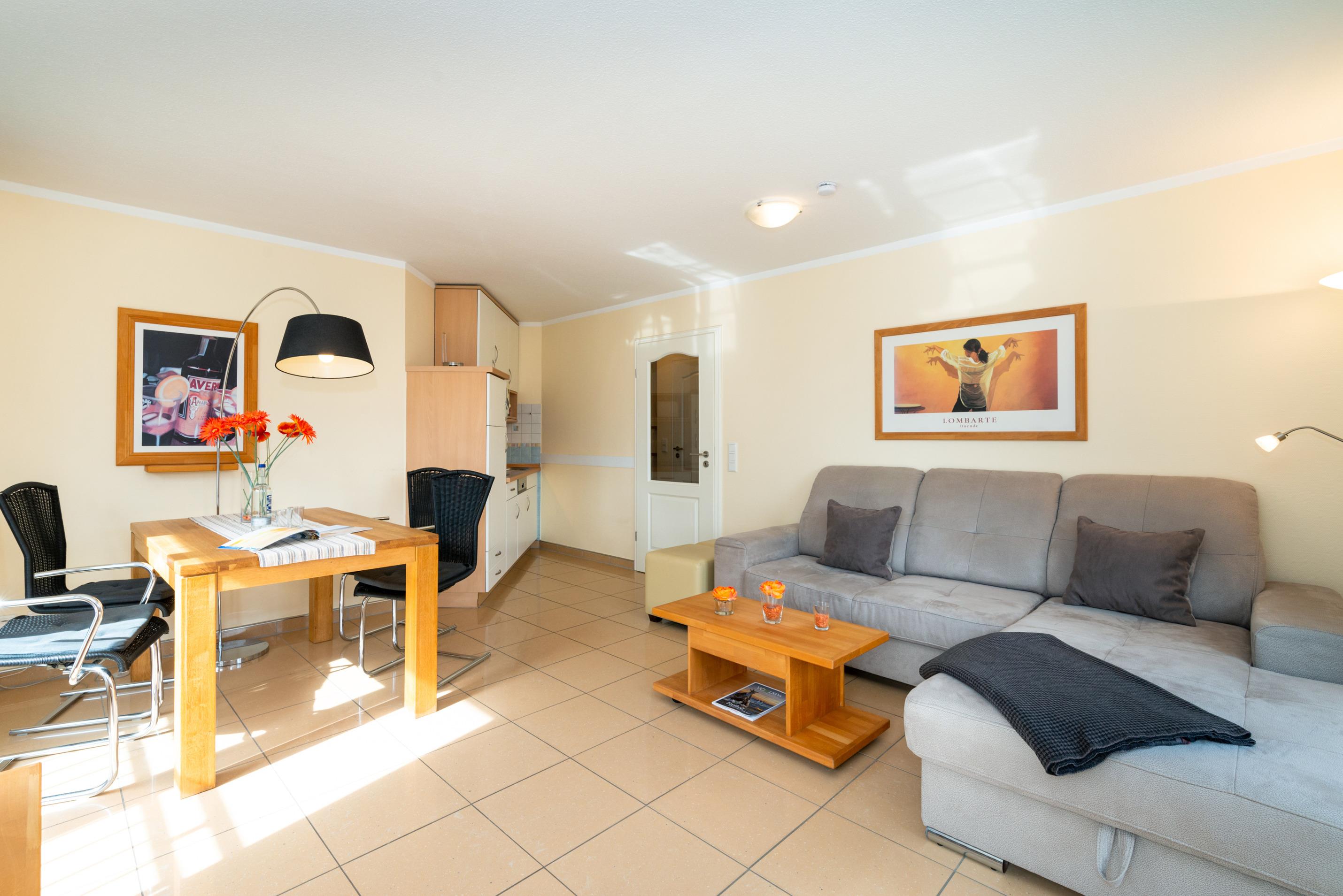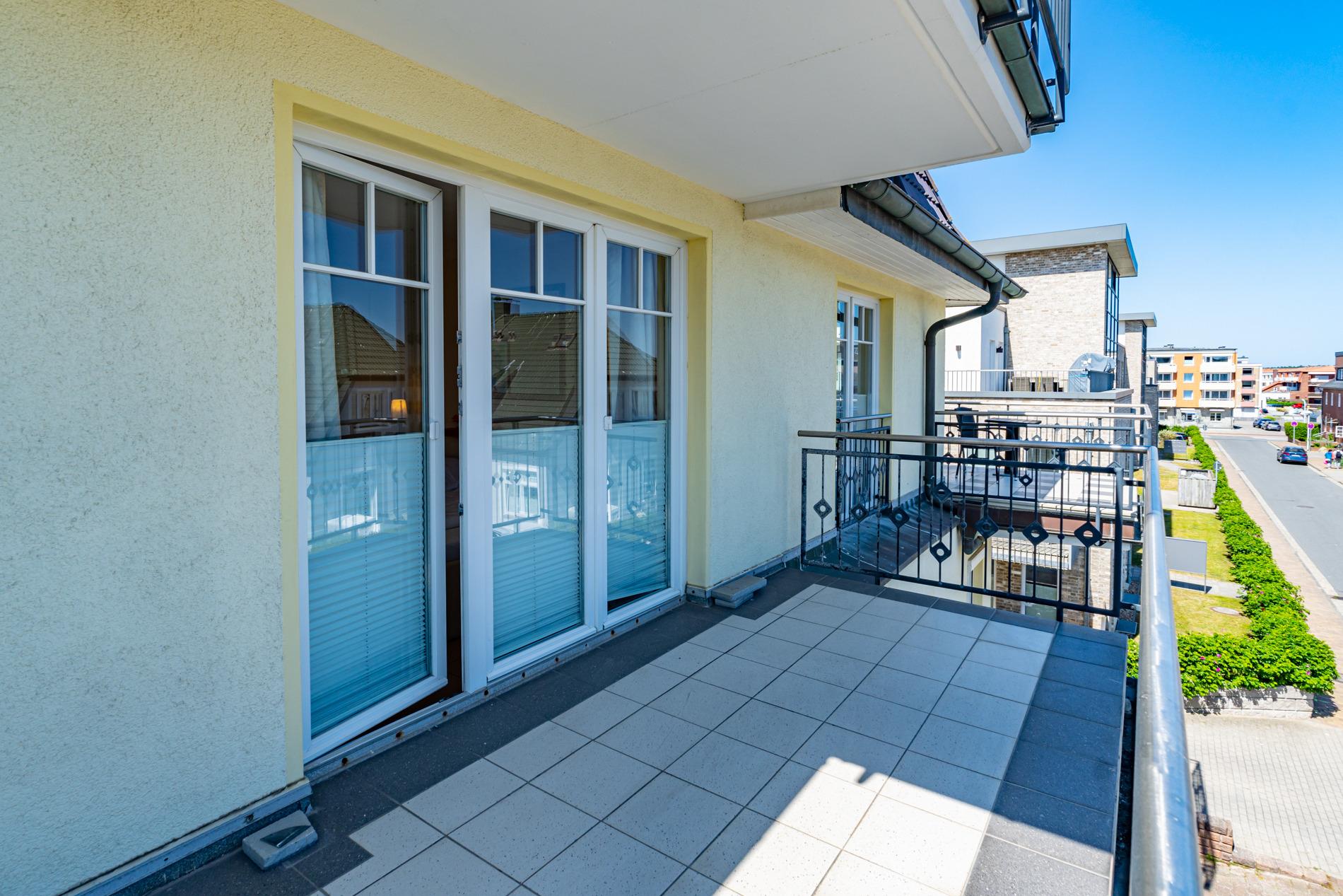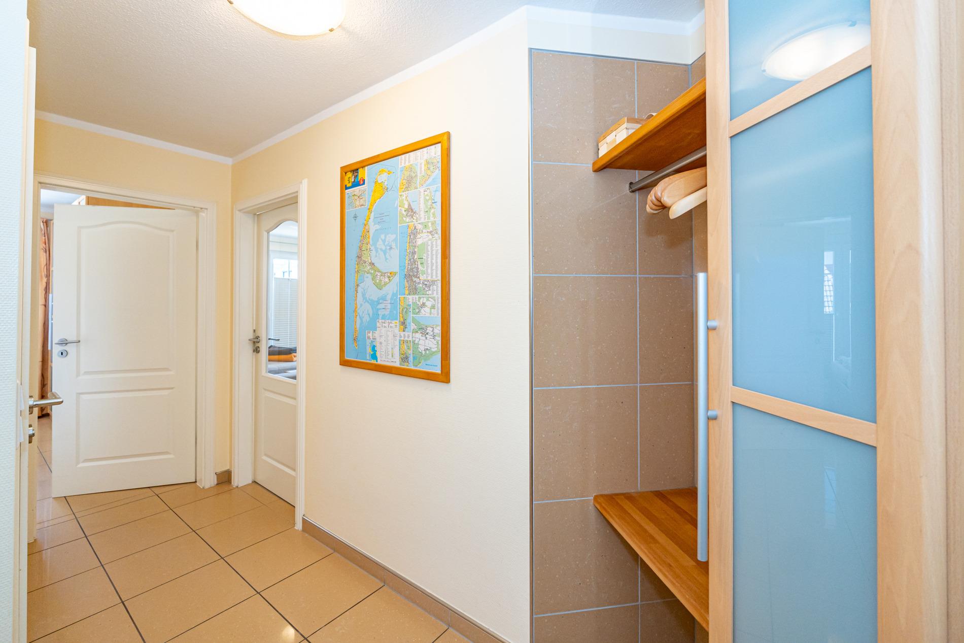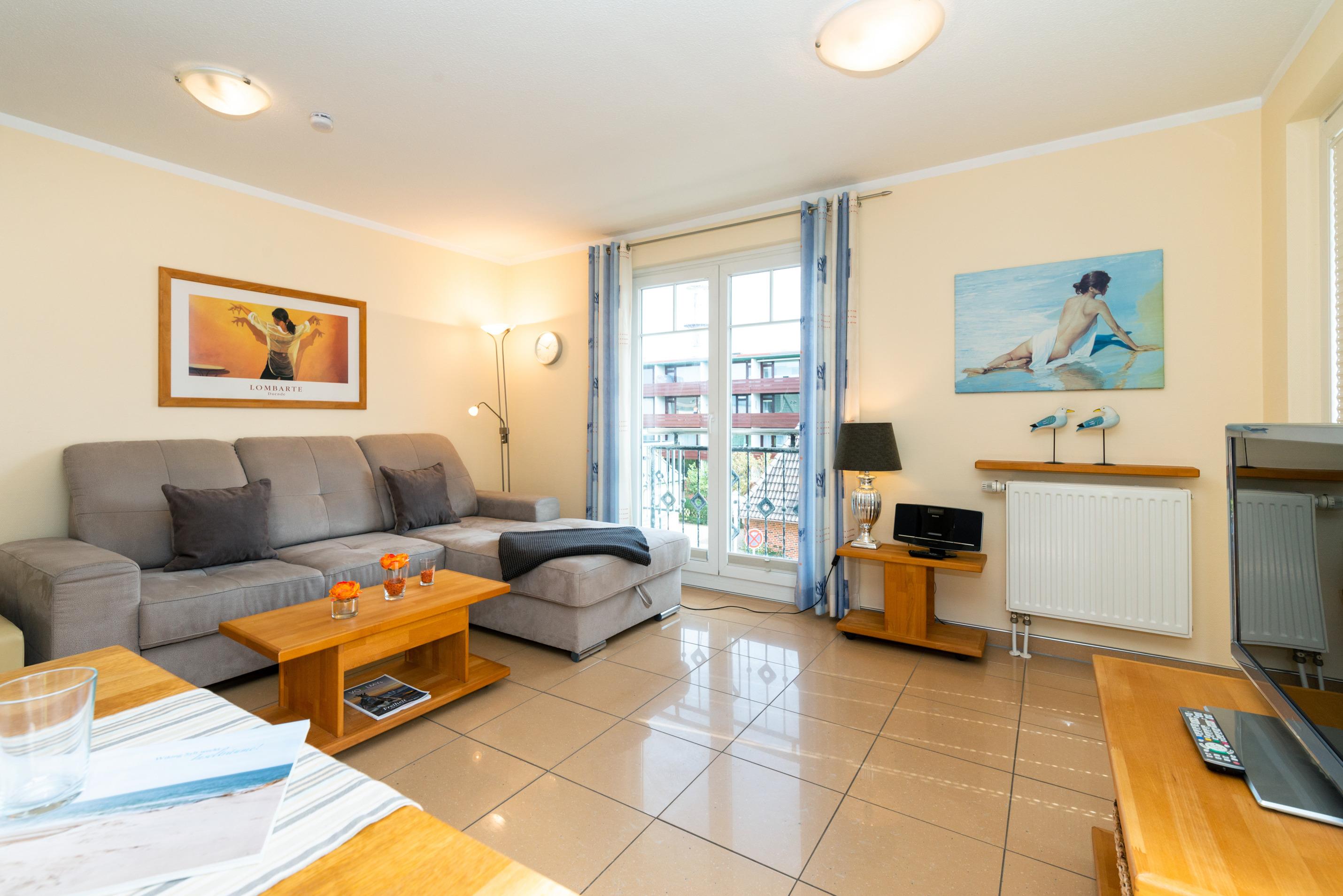 Vom Vorflur mit Garderobe gelangt man in das schicke Wohnzimmer (mit Austritt zum Balkon, mit Strandkorb, Balkonmöbeln und Auflagen), in das geräumige Duschbad/WC und in das Schlafzimmer.