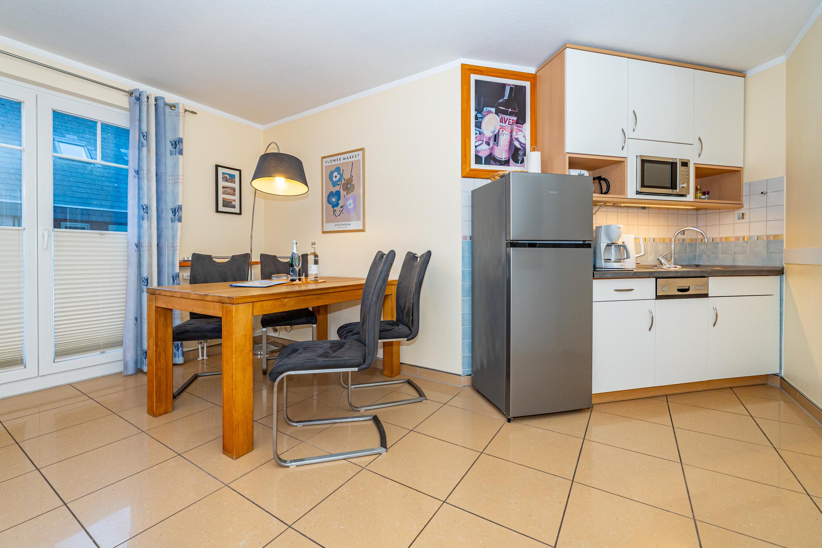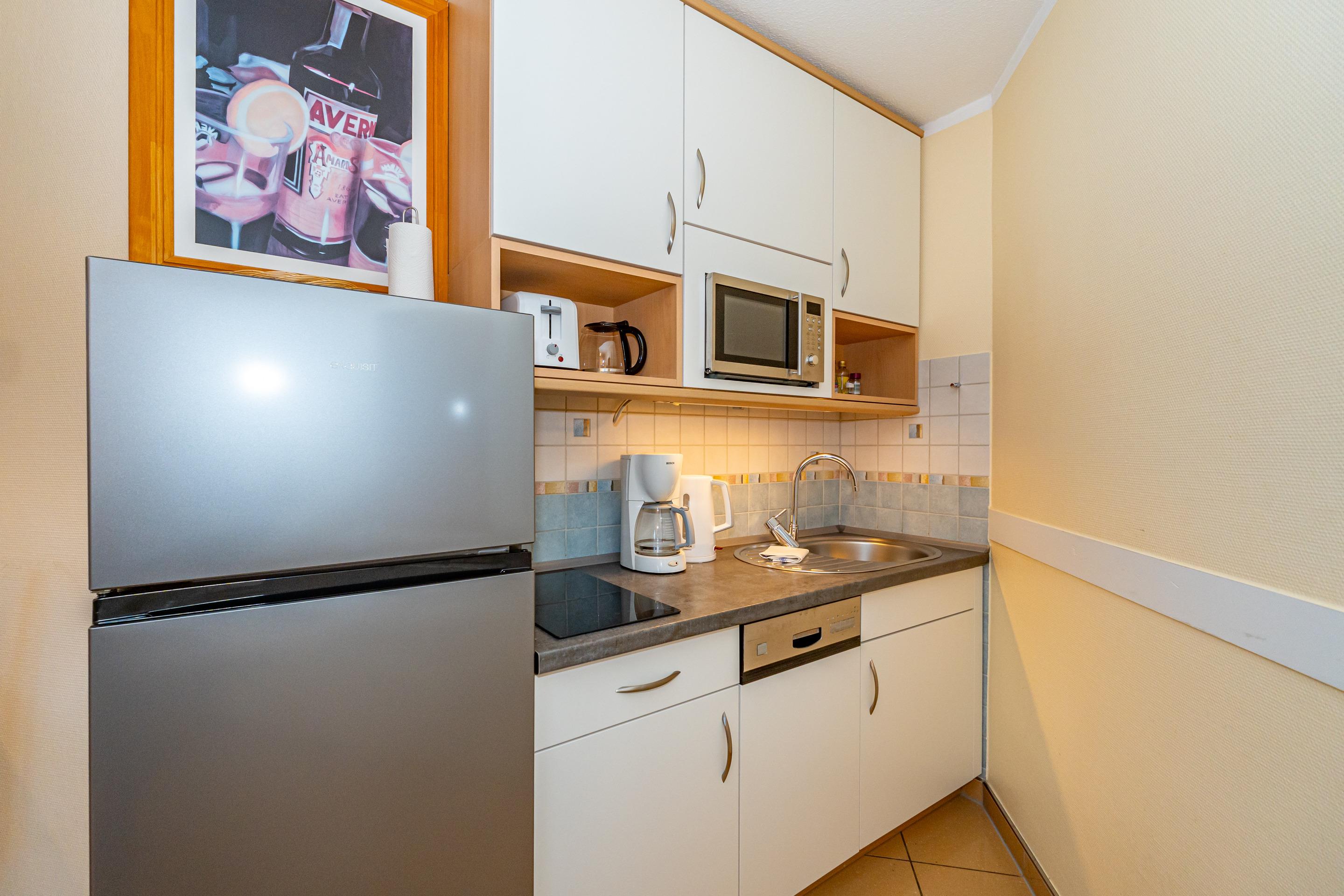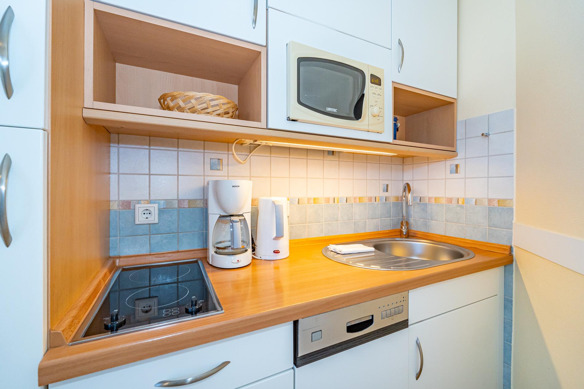 Die moderne Küchenzeile hat einen Geschirrspüler, Mikrowelle mit Grillfunktion, ein 2-Platten-Ceranfeld und einen Kühlschrank mit 3-Sterne-Gefrierfach.