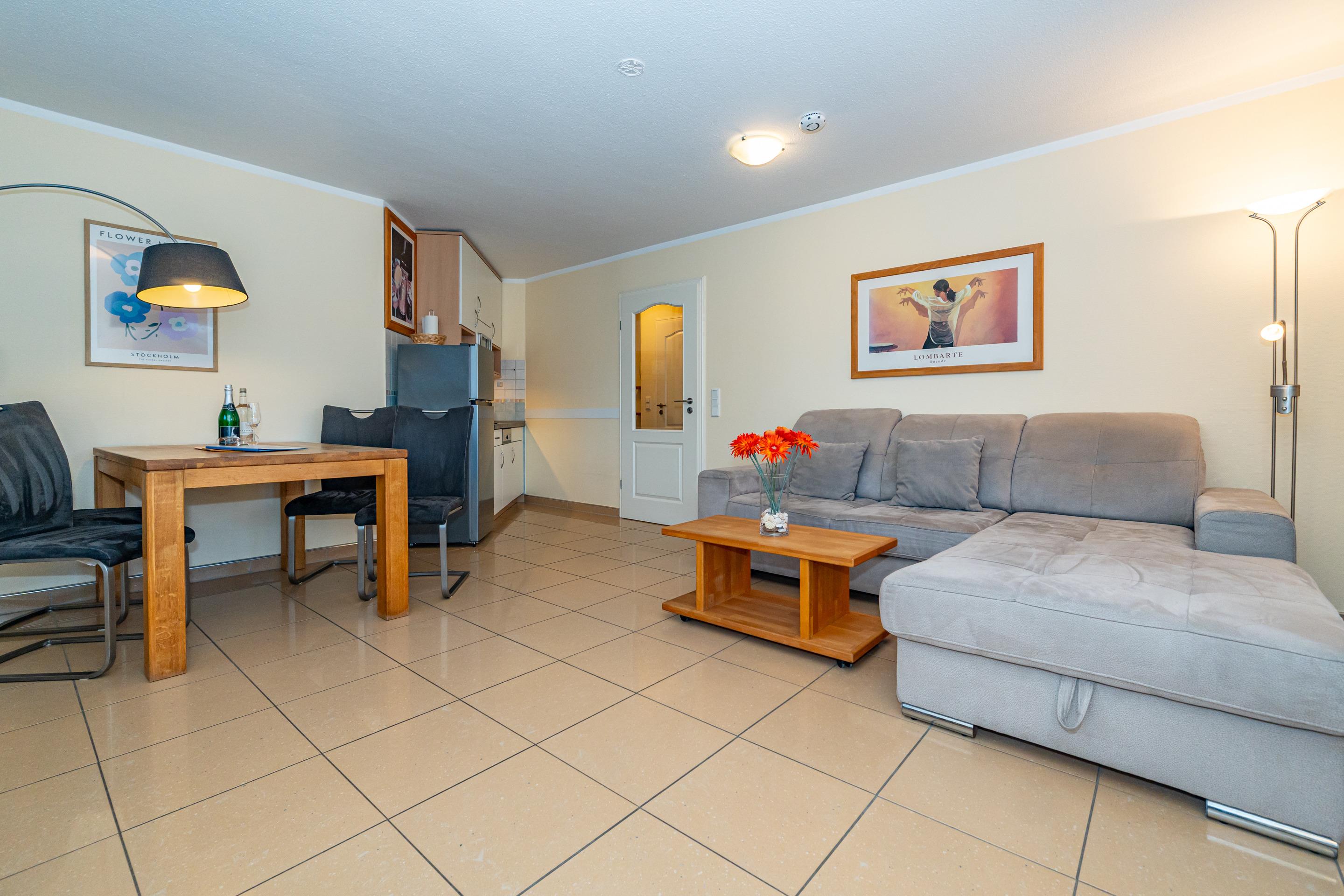 Das Wohnzimmer hat eine sehr gute Eckgarnitur (mit Doppelschlafcouch 1,27 x 2,00 m), Kabel-Flachbild-TV, einen Essplatz und Mini-Kompaktanlage.