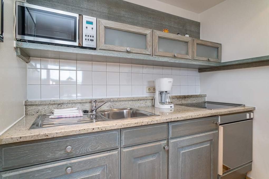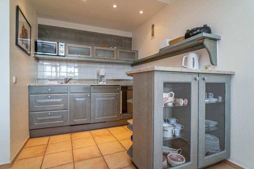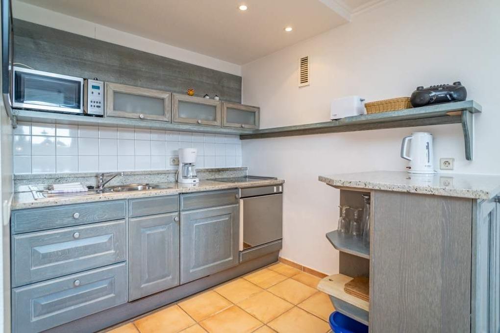 Die moderne, offene Einbauküche besitzt eine Mikrowelle, einen Herd mit Backofen und Ceran-Kochfeld sowie einen Kühlschrank mit 3*-Gefrierfach.