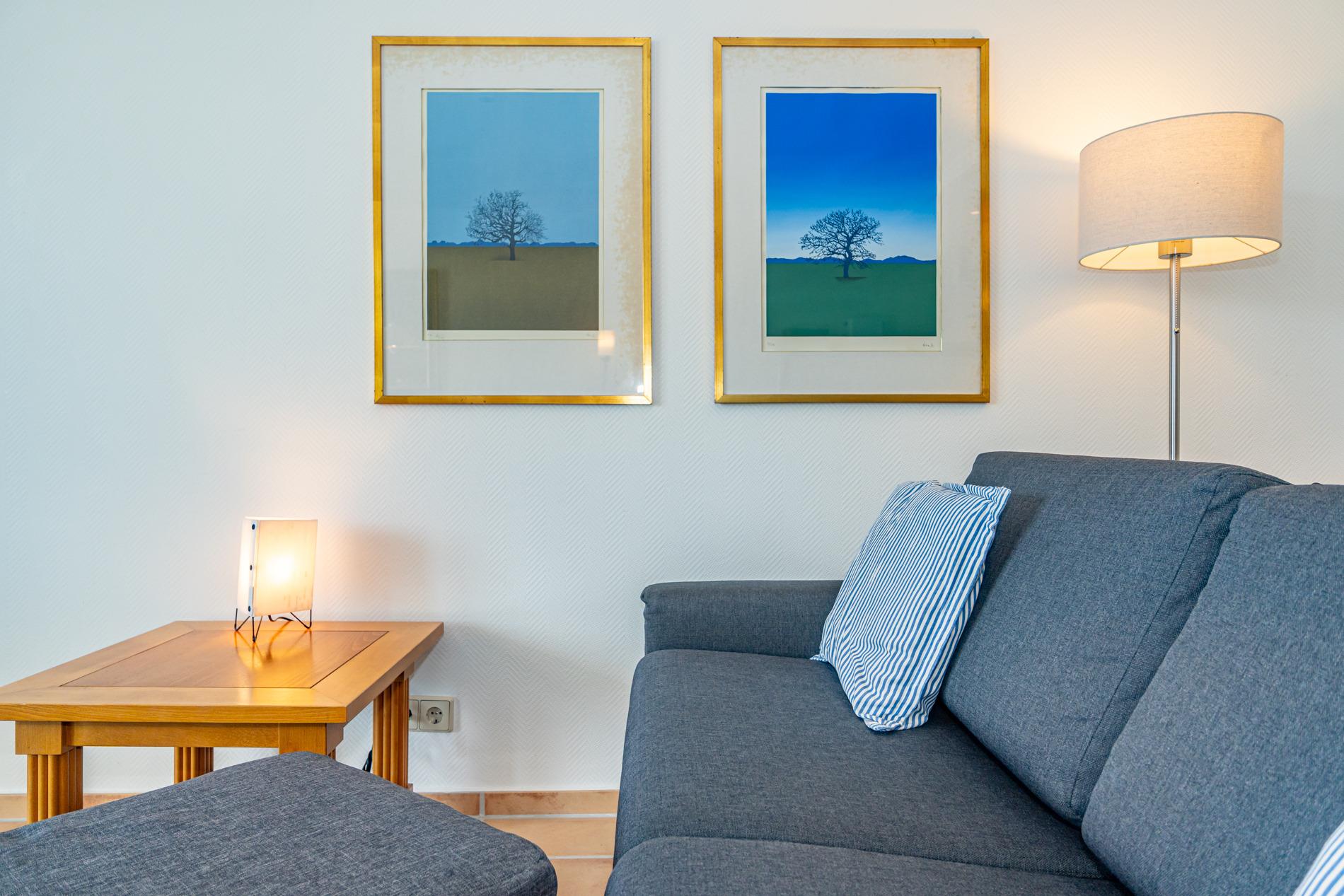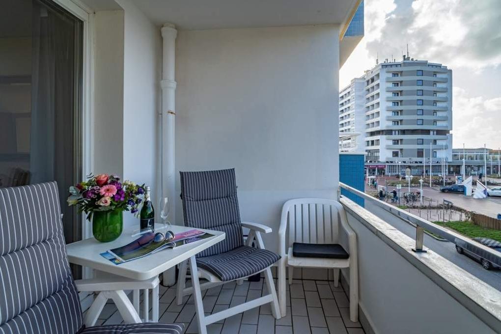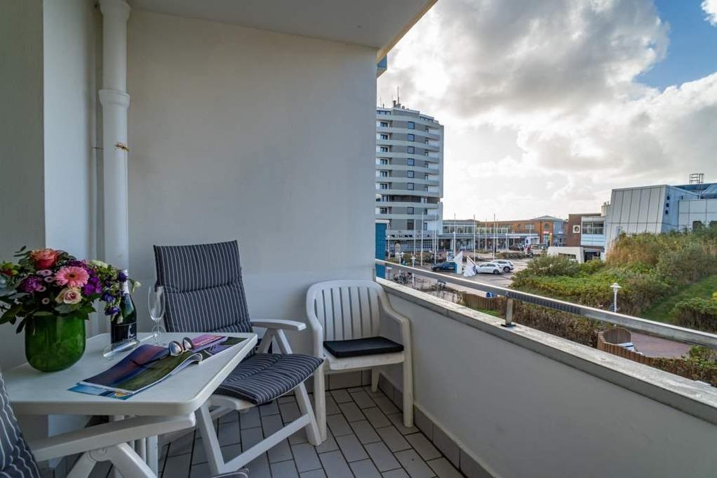 Komfortable 2-Zimmer-Nichtraucher-Ferienwohnung (ca. 54 qm) in der 2. Etage zur Seeseite mit Westloggia (Nachmittagssonne, mit Balkonmöbeln und Auflagen) für max. 2 Personen.