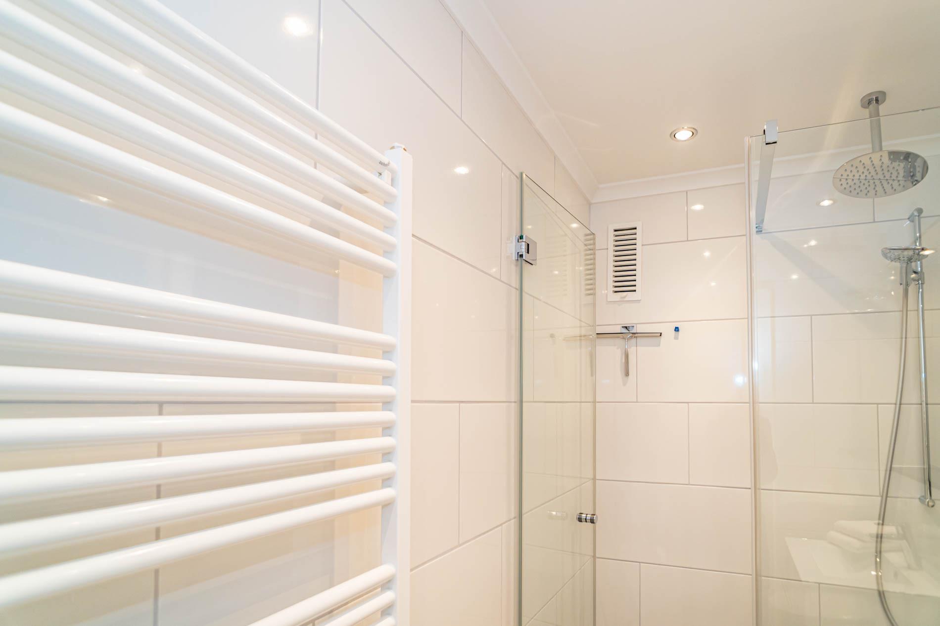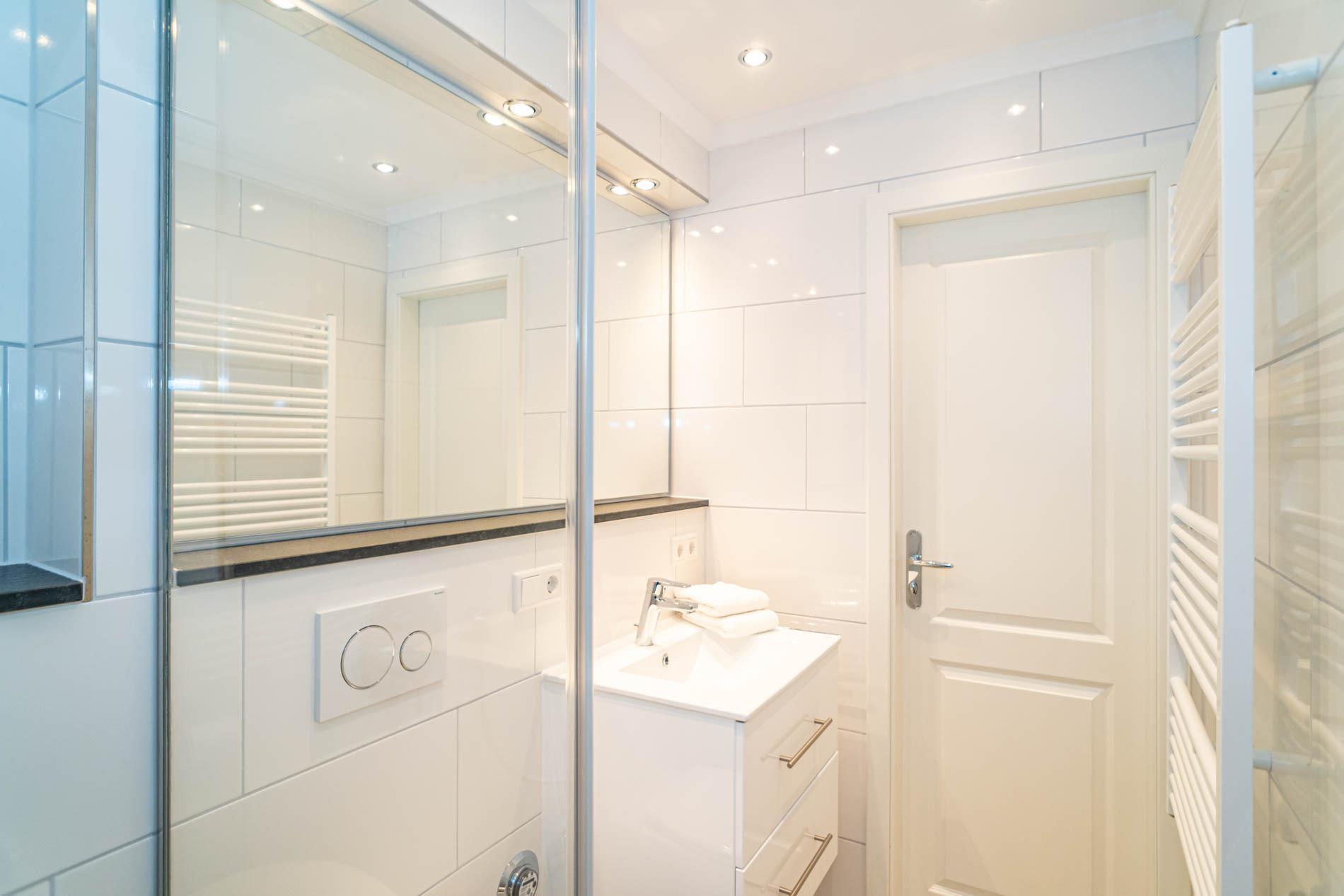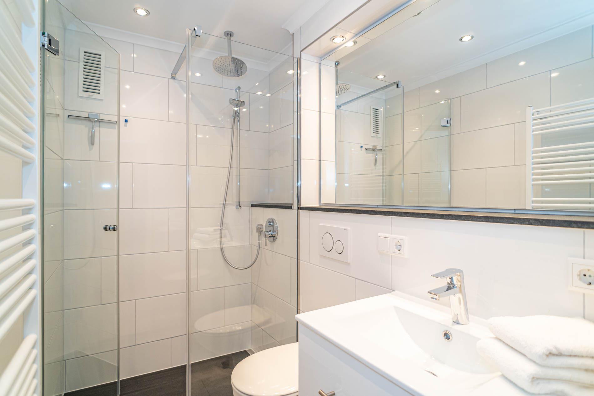 Das neue, moderne Badezimmer mit Dusche mit extraflachem Einstieg, Waschtisch, Handtuchtrockner und WC lässt Sie gut in den Tag starten.