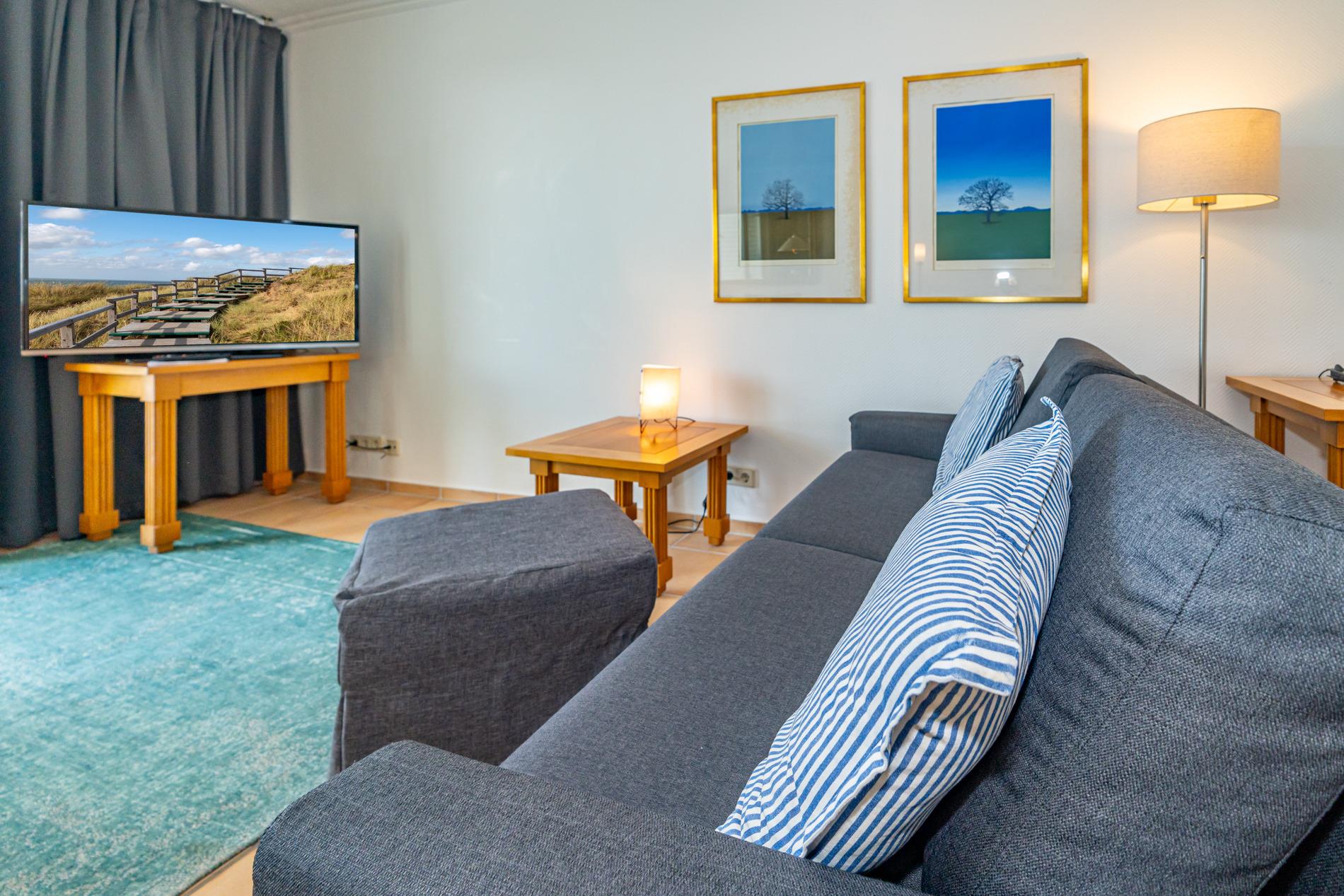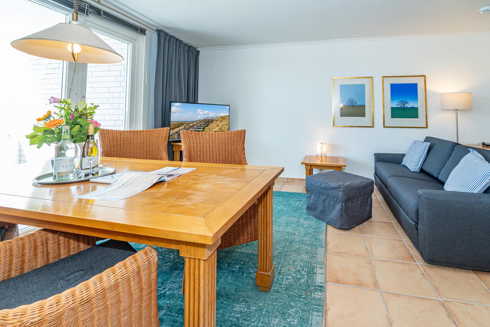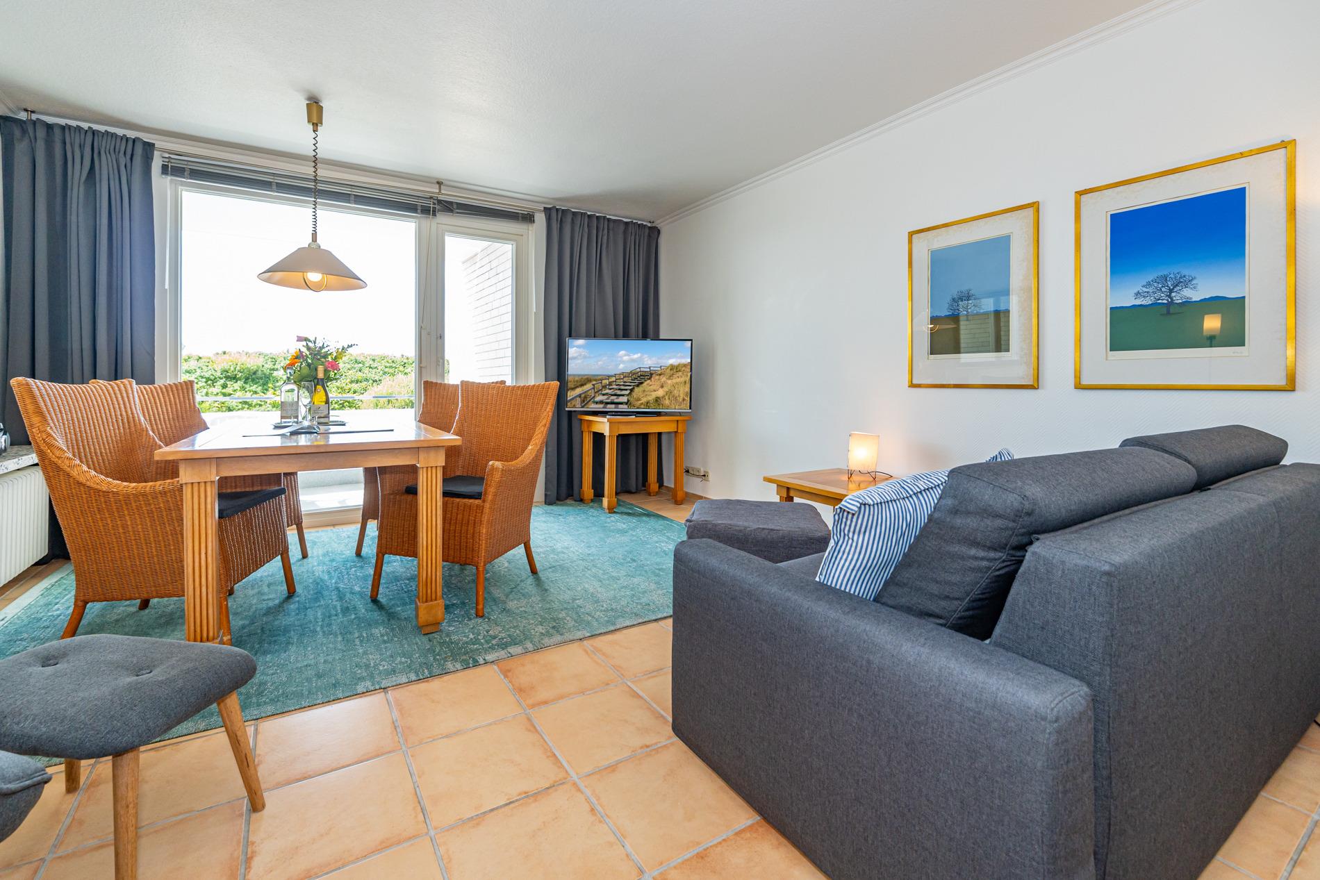 Das Wohnzimmer ist mit einer bequemen Sitzgarnitur, Essplatz direkt am Fenster, Sat-Flachbild-TV und Radio ausgestattet.
